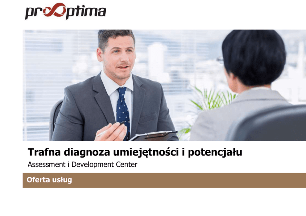 Trafna diagnoza umiejętności i potencjału Assessment i Development Center Oferta usług Oferta usług AC/DC Wysokie koszty błędnych decyzji Błędna ocena potencjału pracowników przekłada się na koszty związane z niewłaściwą decyzją personalną. Koszty zatrudnienia, a potem utrzymania pracownika, są o wiele większe niż jego pensja. niewłaściwego Awanse, budowanie kadry rezerwowej, sukcesja, zarządzanie talentami wymagają rzetelnej i trafnej oceny kompetencji pracowników. Brak właściwej oceny oznacza zazwyczaj koszty związane z istniejącymi wakatami, ale także koszty zaniechania inicjatyw, których autorami mogliby być pracownicy z potencjałem. A to oznacza stagnację, utratę aktualnej pozycji na rynku, a nawet zagrożenie upadkiem. Im większa firma, tym pracownikom HR trudnej poznać obiektywnie i kompleksowo potencjał każdego pracownika. Potrzebna jest profesjonalna, obiektywna ocena zewnętrznych ekspertów. Menedżerowie, mimo znajomości swoich podwładnych, nie mają kompetencji do pełnej oceny możliwości pracowników, a często potrzebują obiektywnego uzasadnienia dla decyzji kadrowych. W poradzeniu sobie z tymi wyzwaniami pomaga zewnętrzny ekspert oceniający kompetencje pracowników. Z czego korzysta ekspert? Z najbardziej skutecznej i Development Center. metody oceny potencjału – Assessment 1 Oferta usług AC/DC Wybieraj trafnie Na czym polega Assessment i Development Center? Co jest istotą AC/DC Assessment i Development Center (AC/DC) tu usługa pozwalająca na zebranie w wystandaryzowanych warunkach informacji o wiedzy, umiejętnościach i postawach pracowników/kandydatów. Istotą Assessment/Development Center są sesje grupowe, w trakcie, których uczestnicy muszą sobie radzić w sytuacjach, jakie rzeczywiście mogą im się przydarzyć w pracy. Assessment Center jest techniką prognozowania efektywności, poprzez określenie aktualnego poziomu umiejętności pracownika. Development Center to później rozwinięta odmiana techniki Assessment Center, której celem jest przede wszystkim stworzenie prognoz rozwojowych dla konkretnych osób i rozpoznanie możliwości zarządzania ich kompetencjami. Największą przewagą AC/DC nad innymi metodami oceny jest to, że dzięki zastosowaniu technik symulacyjnych pozwala na skuteczną weryfikację umiejętności. Trafność prognostyczna tej metody oceny kompetencji sięga 76% (w porównaniu do 35% trafności za pomocą innych metod: wywiad, analiza CV, analiza dokonań). Pomimo tego, że kosztuje więcej, warto ją wybrać, by nie ponosić kosztów niewłaściwych decyzji personalnych. W tym czasie zespół asesorów ocenia kompetencje poszczególnych uczestników i całego zespołu (np. w zakresie umiejętności negocjacyjnych, kreatywności, radzenia sobie w trudnych sytuacjach, itp.). Ocena dotyczy także tzw. miękkich kompetencji, które decydują o umiejętności współpracy z ludźmi. Metoda Assessment/Development Center daje zdecydowanie najpełniejszy obraz predyspozycji zawodowych i zdolności człowieka. Assessment i Development Center sprawdza się przy: rekrutacji na najwyższe stanowiska ocenie potencjału zawodowego pracowników konkursach na stanowiska kierownicze i specjalistyczne projektowaniu ścieżek rozwoju zawodowego (zarządzaniu talentami) ocenie przydatności osoby na określone stanowisko pracy (kierownicze średniego i wyższego szczebla) określaniu potrzeb szkoleniowych/rozwojowych dla grupy osób typowaniu osób do rezerwy kadrowej (HiPo) typowaniu osób do pełnienia roli "agentów zmiany" w organizacji Zarówno Assessment Center, jak i Development Center minimalizują zdecydowanie ryzyko wyboru niewłaściwego człowieka i podjęcia nietrafnej decyzji kadrowej. 2 Oferta usług AC/DC Assessment /Development Center to CSR i Employer Branding Rzetelność Usługa AC/DC to korzystny dla wizerunku firmy sposób selekcji pracowników i dbanie o relacje z otoczeniem (Employer Branding, CSR). Informacje zwrotne po procesie AC/DC są dostarczane dla każdego z uczestników AC/DC. Rzetelną i wnikliwą ocenę poziomu już posiadanych kompetencji oraz potencjału kandydatów/pracowników. Bezpieczeństwo Bezpieczeństwo trafnych decyzji personalnych dzięki zastosowaniu profesjonalnej oceny. Najwyższa trafność prognostyczna ocen (76%) jest możliwa do uzyskana poprzez stosowanie ocen wielokrotnych, zobiektywizowanych i nieprzypadkowych Poznanie ukrytej motywacji Dzięki metodologii badania możliwe jest zdecydowanie bardziej obiektywne określenie poziomu motywacji każdego z uczestników (wyjście poza deklaracje pracowników/kandydatów). Łatwiejsze decyzje personalne Czas Przedstawienie wyników usługi w formie indywidualnych i grupowych profili umożliwia szybkie porównanie poszczególnych kandydatów/pracowników, a przez to ułatwia analizę i podejmowanie decyzji. Zlecenie przygotowania ekspertom umożliwia krytycznych zadaniach wobec menedżerów czy i realizacji procesu zewnętrznym koncentrację na pozostałych, stawianych przez organizację działów HR. Wyłowienie ukrytych talentów AC/DC umożliwia identyfikację ukrytego potencjału pracowników, którzy aktualnie jeszcze nie wnoszą do organizacji tyle, ile będą mogli w przyszłości (identyfikacja przyszłych menedżerów, trenerów wewnętrznych, mentorów do sukcesji, ekspertów o wąskich specjalizacjach). 3 korzyści biznesowe z AC/DC Minimalizacja ryzyka kosztownych błędów powstających na skutek nietrafnej selekcji i nieprawidłowych decyzji rozwojowych; Przyspieszenie czasu selekcji kandydatów/pracowników o pożądanych cechach, kompetencjach, potencjale; Dostarczenie obiektywnych informacji o aktualnych kompetencjach kandydatów/pracowników oraz o lukach kompetencyjnych. 3 Oferta usług AC/DC Etapy procesu AC/DC z ProOpitma: ETAP1 – Przygotowanie Wybór badanych kompetencji kluczowych dla stanowiska. Przed sesją AC/DC określamy poszczególne kluczowe kompetencje, które będ