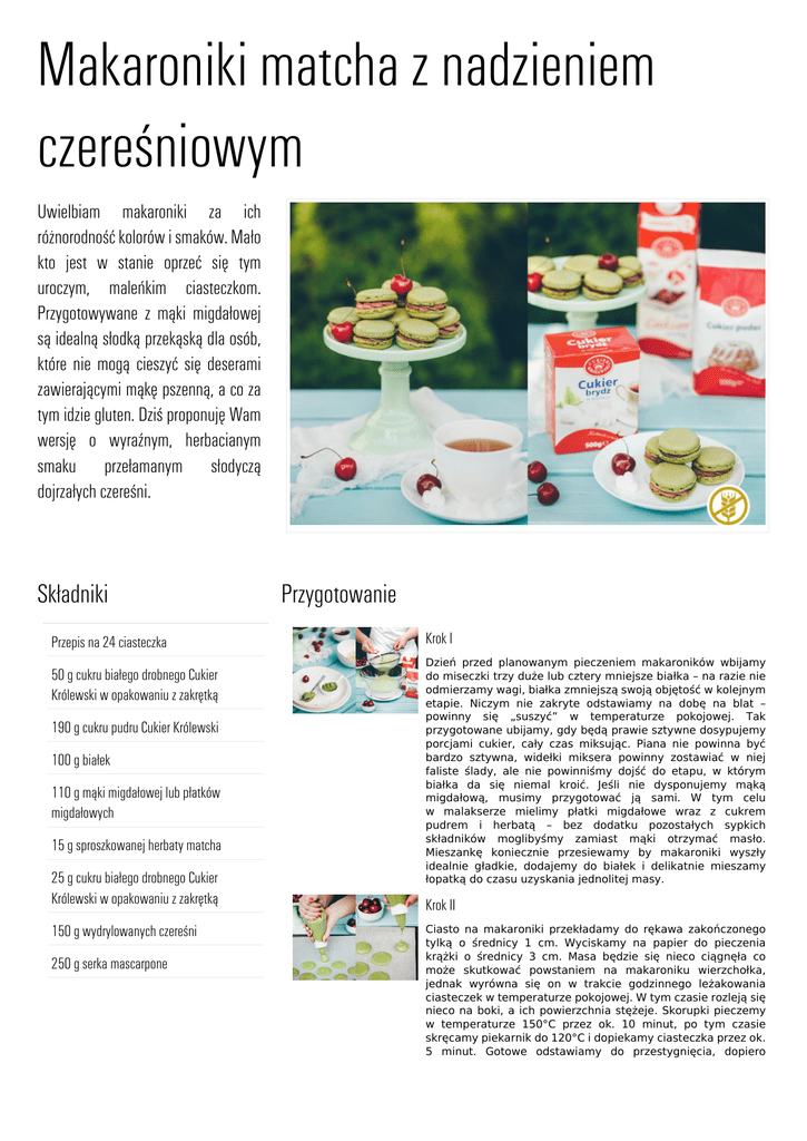 Makaroniki matcha z nadzieniem czereśniowym Uwielbiam makaroniki za ich różnorodność kolorów i smaków. Mało kto jest w stanie oprzeć się tym uroczym, maleńkim ciasteczkom. Przygotowywane z mąki migdałowej są idealną słodką przekąską dla osób, które nie mogą cieszyć się deserami zawierającymi mąkę pszenną, a co za tym idzie gluten. Dziś proponuję Wam wersję o wyraźnym, herbacianym smaku przełamanym słodyczą dojrzałych czereśni. Składniki Przepis na 24 ciasteczka 50 g cukru białego drobnego Cukier Królewski w opakowaniu z zakrętką 190 g cukru pudru Cukier Królewski 100 g białek 110 g mąki migdałowej lub płatków migdałowych 15 g sproszkowanej herbaty matcha 25 g cukru białego drobnego Cukier Królewski w opakowaniu z zakrętką 150 g wydrylowanych czereśni 250 g serka mascarpone Przygotowanie Krok I Dzień przed planowanym pieczeniem makaroników wbijamy do miseczki trzy duże lub cztery mniejsze białka – na razie nie odmierzamy wagi, białka zmniejszą swoją objętość w kolejnym etapie. Niczym nie zakryte odstawiamy na dobę na blat – powinny się „suszyć” w temperaturze pokojowej. Tak przygotowane ubijamy, gdy będą prawie sztywne dosypujemy porcjami cukier, cały czas miksując. Piana nie powinna być bardzo sztywna, widełki miksera powinny zostawiać w niej faliste ślady, ale nie powinniśmy dojść do etapu, w którym białka da się niemal kroić. Jeśli nie dysponujemy mąką migdałową, musimy przygotować ją sami. W tym celu w malakserze mielimy płatki migdałowe wraz z cukrem pudrem i herbatą – bez dodatku pozostałych sypkich składników moglibyśmy zamiast mąki otrzymać masło. Mieszankę koniecznie przesiewamy by makaroniki wyszły idealnie gładkie, dodajemy do białek i delikatnie mieszamy łopatką do czasu uzyskania jednolitej masy. Krok II Ciasto na makaroniki przekładamy do rękawa zakończonego tylką o średnicy 1 cm. Wyciskamy na papier do pieczenia krążki o średnicy 3 cm. Masa będzie się nieco ciągnęła co może skutkować powstaniem na makaroniku wierzchołka, jednak wyrówna się on w trakcie godzinnego leżakowania ciasteczek w temperaturze pokojowej. W tym czasie rozleją się nieco na boki, a ich powierzchnia stężeje. Skorupki pieczemy w temperaturze 150°C przez ok. 10 minut, po tym czasie skręcamy piekarnik do 120°C i dopiekamy ciasteczka przez ok. 5 minut. Gotowe odstawiamy do przestygnięcia, dopiero Powered by TCPDF (www.tcpdf.org) później odrywamy je od papieru. Krok III Czereśnie dokładnie miksujemy. Przelewamy do rondelka o grubym dnie, dodajemy cukier. Podgrzewamy mieszając aż uzyskają konsystencję dżemu. Ostudzone mieszamy łopatką z serkiem mascarpone. Nadzienie przekładamy do rękawa cukierniczego zakończonego tylką w kształcie otwartej gwiazdy, na połowę makaroników wyciskamy masę. Przykrywamy pozostałymi skorupkami.