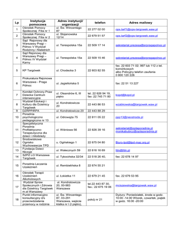 Lp 1 2 3 4 5 6 7 8 9 10 11 12 13 14 15 16 17 18 Instytucja pomocowa Ośrodek Pomocy Społecznej Filia nr 1 Ośrodek Pomocy Społecznej Filia nr 2 Sąd Rejonowy dla Warszawy Pragi – Północ V Wydział Rodzinny i Nieletnich Sąd Rejonowy dla Warszawy Pragi – Północ IV Wydział Karny KP Targówek Prokuratura Rejonowa Warszawa - Praga Północ Komitet Ochrony Praw Dziecka Centrum interwencyjne Wydział Edukacji i Kultury dla Dzielnicy Targówek DZRPPiRPA Poradnia psychologiczno pedagogiczna nr 13 Specjalistyczna Poradnia ProfilaktycznoTerapeutyczna dla dzieci i młodzieŜy Środowiskowe Ognisko Wychowawcze TPD Fundacja Dzieci Niczyje SZPZ LO Warszawa Targówek Poradnia Leczenia UzaleŜnień Ośrodek Terapii UzaleŜnień Alkoholowych Wydział Spraw Społecznych i Zdrowia dla Dzielnicy Targówek m.st Warszawy Punkt informacyjno konsultacyjny d/s przeciwdziałania przemocy w rodzinie Adres instytucji/ organizacji ul. Św. Wincentego 87 ul. Stojanowska 12/14 telefon Adres mailowy 22 277 02 00 [email protected] 22 679 51 57 [email protected] ul. Terespolska 15a 22 509 17 14 [email protected] ul. Terespolska 15a 22 509 15 46 [email protected] 22 603 82 55 fax. 22 603 71 02; 997 lub 112 z tel. komórkowych albo Policyjny telefon zaufania 0 800 120 226 ul. Chodecka 3 ul. Jagiellońska 5 fax: 22 51 13 227 ul. Oleandrów 6, III piętro tel. 22 626 94 19, fax :22 745 71 80 [email protected] ul. Kondratowicza 20 22 443 86 53 [email protected] ul. Kondratowicza 20 22 443 88 29 ul. OdrowąŜa 75 22 811 05 22 [email protected] ul. Wiśniowa 56 22 826 39 16 [email protected] [email protected] u. Ogińskiego 1 22 675 04 80 [email protected] ul. Walecznych 59 22 616 16 69 [email protected] ul. Tykocińska 32/34 22 518 26 40, fax: 22 678 14 97 ul. Rembielińska 8 22 674 55 21 ul. Łokietka 11 22 679 21 45 fax. 22 679 53 95 ul. Kondratowicza 20, 00-983 Warszawa tel.22 443 87 30, fax.: 22 675 19 06 [email protected] ul. Św. Wincentego 87, 03-291 Warszawa, wejście klatka nr I (I piętro), pokój nr 21 DyŜury: Poniedziałek, środa w godz. 10:00 -14:00 Wtorek, czwartek, piątek w godz. 16:00 -20:00 19 20 21 22 23 24 25 26 Ośrodek Interwencji Kryzysowej Poradnia rodzinna d/s przeciwdziałania przemocy w rodzinie Specjalistyczny Ośrodek dla ofiar Przemocy w rodzinie w Fundacji Centrum Praw Kobiet Dom Samotnej Matki Caritas Diecezji Warszawsko – Praskiej Ośrodek dla ofiar przemocy w rodzinie DOM Ogólnopolskie Pogotowie dla ofiar przemocy rodzinie Niebieska Linia Jednostka Ratowniczo-Gaśnicza nr 15 StraŜy PoŜarnej VI OT StraŜy Miejskiej ul. Dalibora 1 22 877 56 43 ul. Belgijska 4 22 845 12 12 22 667 833 400 ul. Wilcza 60/19 22 652 01 17 22 622 25 17 Zielonka ul. Kilińskiego 69 22 781 09 79 ul. Walecznych 59 22 616 10 36 fax: 22 617 28 91 ul. Korotyńskiego 13 22 824 25 01 lub 801 12 00 02 [email protected] tel. 22 596 71 50 tel. Interwencyjny 998 lub 112 z telefonów komórkowych ul. Młodzieńcza 5/7 03-655 Warszawa ul. J. Młota 3 03-490 Warszawa fax.: 22 619 22 80 tel. Interwencyjny 986 lub sms 723 986 112