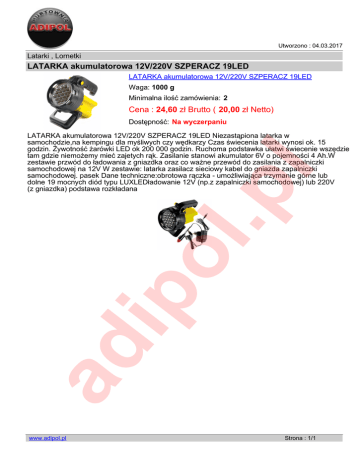Utworzono : 04.03.2017 Latarki , Lornetki LATARKA akumulatorowa 12V/220V SZPERACZ 19LED LATARKA akumulatorowa 12V/220V SZPERACZ 19LED Waga: 1000 g Minimalna ilość zamówienia: 2 Cena : 24,60 zł Brutto ( 20,00 zł Netto) Dostępność: Na wyczerpaniu ad ip ol .p l LATARKA akumulatorowa 12V/220V SZPERACZ 19LED Niezastąpiona latarka w samochodzie,na kempingu dla myśliwych czy wędkarzy Czas świecenia latarki wynosi ok. 15 godzin. Żywotność żarówki LED ok 200 000 godzin. Ruchoma podstawka ułatwi świecenie wszędzie tam gdzie niemożemy mieć zajetych rąk. Zasilanie stanowi akumulator 6V o pojemności 4 Ah.W zestawie przwód do ładowania z gniazdka oraz co ważne przewód do zasilania z zapalniczki samochodowej na 12V W zestawie: latarka zasilacz sieciowy kabel do gniazda zapalniczki samochodowej. pasek Dane techniczne:obrotowa rączka - umożliwiająca trzymanie górne lub dolne 19 mocnych diód typu LUXLEDładowanie 12V (np.z zapalniczki samochodowej) lub 220V (z gniazdka) podstawa rozkładana www.adipol.pl Powered by TCPDF (www.tcpdf.org) Strona : 1/1