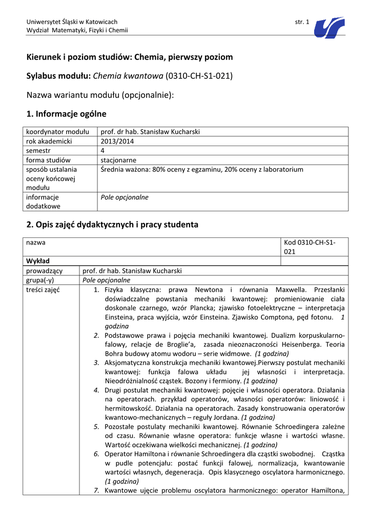 Uniwersytet Śląski w Katowicach Wydział Matematyki, Fizyki i Chemii str. 1 Kierunek i poziom studiów: Chemia, pierwszy poziom Sylabus modułu: Chemia kwantowa (0310-CH-S1-021) Nazwa wariantu modułu (opcjonalnie): 1. Informacje ogólne koordynator modułu rok akademicki semestr forma studiów sposób ustalania oceny końcowej modułu informacje dodatkowe prof. dr hab. Stanisław Kucharski 2013/2014 4 stacjonarne Średnia ważona: 80% oceny z egzaminu, 20% oceny z laboratorium Pole opcjonalne 2. Opis zajęć dydaktycznych i pracy studenta nazwa Wykład prowadzący grupa(-y) treści zajęć Kod 0310-CH-S1021 prof. dr hab. Stanisław Kucharski Pole opcjonalne 1. Fizyka klasyczna: prawa Newtona i równania Maxwella. Przesłanki doświadczalne powstania mechaniki kwantowej: promieniowanie ciała doskonale czarnego, wzór Plancka; zjawisko fotoelektryczne – interpretacja Einsteina, praca wyjścia, wzór Einsteina. Zjawisko Comptona, pęd fotonu. 1 godzina 2. Podstawowe prawa i pojęcia mechaniki kwantowej. Dualizm korpuskularnofalowy, relacje de Broglie’a, zasada nieoznaczoności Heisenberga. Teoria Bohra budowy atomu wodoru – serie widmowe. (1 godzina) 3. Aksjomatyczna konstrukcja mechaniki kwantowej.Pierwszy postulat mechaniki kwantowej: funkcja falowa układu jej własności i interpretacja. Nieodróżnialność cząstek. Bozony i fermiony. (1 godzina) 4. Drugi postulat mechaniki kwantowej: pojęcie i własności operatora. Działania na operatorach. przykład operatorów, własności operatorów: liniowość i hermitowskość. Działania na operatorach. Zasady konstruowania operatorów kwantowo-mechanicznych – reguły Jordana. (1 godzina) 5. Pozostałe postulaty mechaniki kwantowej. Równanie Schroedingera zależne od czasu. Równanie własne operatora: funkcje własne i wartości własne. Wartość oczekiwana wielkości mechanicznej. (1 godzina) 6. Operator Hamiltona i równanie Schroedingera dla cząstki swobodnej. Cząstka w pudle potencjału: postać funkcji falowej, normalizacja, kwantowanie wartości własnych, degeneracja. Opis klasycznego oscylatora harmonicznego. (1 godzina) 7. Kwantowe ujęcie problemu oscylatora harmonicznego: operator Hamiltona, Uniwersytet Śląski w Katowicach Wydział Matematyki, Fizyki i Chemii str. 2 równanie Schroedingera, wartości własne i funkcje własne, oscylacyjna liczba kwantowa i jej dopuszczalne wartości. Zastosowanie modelu oscylatora harmonicznego do opisu drgań cząsteczek. (1 godzina) 8. Moment pędu – definicja i opis w ujęciu mechaniki klasycznej. Zagadnienie własne dla operatora składowej z-towej i kwadratu wektora momentu pędu: wartości własne i funkcje własne, rotacyjne liczby kwantowe. Rotator sztywny: hamiltonian, wartości własne, stała rotacyjna, widmo rotacyjne. (1 godzina) 9. Atom wodoru i jony wodoropodobne. Hamiltonian i równanie Schroedingera. Wartości własne i funkcje własne. Pojęcie orbitalu atomowego, analityczna postać, współrzędne kartezjańskie i sferyczne. Liczby kwantowe w kwantowomechanicznym opisie atomu wodoru.(1 godzina) 10. Radialna gęstość prawdopodobieństwa. Maksima radialnej gęstości prawdopodobieństwa dla orbitali o maksymalnej liczbie l a promienie orbit bohrowskich. Spin elektronu. Spinowa i magnetyczna spinowa liczba kwantowa. Spinorbitale. (1 godzina) 11. Atom wieloelektronowy, powłoki, podpowłoki , konfiguracje elektronowe. Zakaz Pauliego. Zabudowa elektronowa atomu. Dodawanie wektorów momentu pędu, termy atomowe, przykład wyznaczania termów atomowych dla elektronów nierównoważnych. Reguły Hunda. (1 godzina) 12. Zasada wariacyjna i metoda wariacyjna. Liniowe parametry wariacyjne, metoda Ritza, równania sekularne. Metoda LCAO, rozwinięcie orbitalu na funkcje bazowe. Orbitale wiążące i antywiążące. Klasyfikacja orbitali molekularnych, m.in. ze względu na symetrię, orbitale σ,π,δ. (1 godzina) 13. Konfiguracje elektronowe cząsteczek dwuatomowych homo- i heterojądrowych. Rząd wiazania vs. długość i energia wiązania. Własności paramagnetyczne. Cząsteczki wieloatomowe. Hybrydyzacja orbitali atomowych: sp, sp2, sp3, sd, sp3d, sp3d2. (1 godzina) 14. Ogólna charakterystyka i podział metod obliczeniowych chemii kwantowej. Metody oparte na funkcji falowej i na funkcji gęstości. Metoda Hartree-Focka i metod DFT (1 godzina) 15. Związki węgla zawierające sprzężony układ wiązań podwójnych. Metoda Hueckla. Układ równań sekularnych. Parametryzacja całki kulombowskiej i rezonansowej. Przykłady orbitali molekularnych π wiążących, niewiążących i antywiążących w cząsteczek etenu, butadienu, benzenu i allilu. Węglowodory naprzemienne i nienaprzemienne. Energia delokalizacji. (1 godzina) metody prowadzenia zajęć liczba godzin dydaktycznych (kontaktowych) liczba godzin pracy własnej studenta opis pracy własnej studenta Jak w opisie modułu 15 9 Praca ze wskazaną literaturą przedmiotu obejmująca samodzielne przyswojenie wiedzy odnośnie wskazanych zagadnień na wykładzie Uniwersytet Śląski w Katowicach Wydział Matematyki, Fizyki i Chemii organizacja zajęć literatura obowiązkowa str. 3 Wykłady prowadzone przez cały semestr (1 godzina wykładu/tydzień) 1. W. Kołos, Chemia kwantowa, PWN, Warszawa 1986, 2. A.Gołębiewski, Elementy mechaniki i chemii kwantowej, PWN, Warszawa 1982, 3. D.O. Hayward, Mechanika kwantowa dla chemików, PWN, Warszawa, 2006. 1. L. Piela, Idee chemii kwantowej, PWN, Warszawa, 2004, literatura uzupełniająca adres strony Pole opcjonalne www zajęć informacje Pole opcjonalne dodatkowe nazwa Laboratorium prowadzący grupa(-y) treści zajęć metody prowadzenia zajęć liczba godzin dydaktycznych (kontaktowych) liczba godzin pracy własnej studenta opis pracy własnej studenta organizacja zajęć literatura obowiązkowa literatura uzupełniająca adres strony www zajęć Kod 0310-CH-S1021 dr Piotr Lodowski, dr Maciej Kołaski, dr Katarzyna Kowalska-Szojda, dr hab. Tadeusz Pluta Wszystkie gru