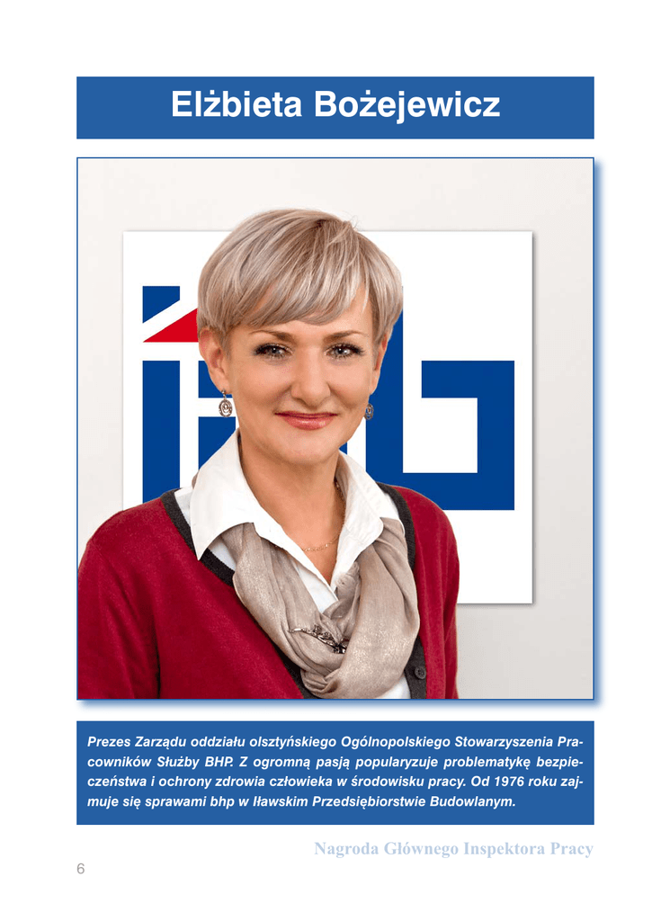 Elżbieta Bożejewicz Prezes Zarządu oddziału olsztyńskiego Ogólnopolskiego Stowarzyszenia Pracowników Służby BHP. Z ogromną pasją popularyzuje problematykę bezpieczeństwa i ochrony zdrowia człowieka w środowisku pracy. Od 1976 roku zajmuje się sprawami bhp w Iławskim Przedsiębiorstwie Budowlanym. Nagroda Głównego Inspektora Pracy 6 Czy praca behapowca może być atrakcyjna dla młodego człowieka? To chyba nie jest dziedzina, w której łatwo odnieść sukces? Praca w służbie bhp jest bardzo ciekawym zajęciem, wymagającym zdobywania nowych doświadczeń i ciągłego inwestowania w swoją wiedzę. Od czasu, kiedy zaczynałam swoją przygodę z bhp, wiele się zmieniło. W środowisku pracy pojawiły się nowe zagrożenia, z którymi trzeba sobie radzić. To jest zajęcie dla osób zainteresowanych rozwojem zawodowym, ambitnych i kreatywnych. Mogę się nawet pochwalić, że za moją namową wielu młodych ludzi, którzy nie wybrali swojej drogi zawodowej, zdecydowało się na bhp i świetnie sobie teraz radzą. A sukces? Dzięki zaangażowaniu i doskonaleniu się można go osiągnąć w każdym zawodzie. Nadzorowała Pani duże budowy. Co, z Pani punktu widzenia, jest największym problemem podczas realizacji takich inwestycji? Na dużej budowie, gdzie często jest wielu różnych podwykonawców, behapowiec stoi przed niemałymi wyzwaniami. Nadzorowałam budowę galerii handlowych, szpitali, pływalni. W tego typu inwestycjach poważnym problemem jest ograniczanie środków finansowych na zakup sprzętu ochrony zbiorowej i indywidualnej. W ofertach przetargowych niejednokrotnie nie uwzględnia się kosztów związanych z bezpieczeństwem pracy w pożądanym zakresie, czego rezultatem są tzw. wymuszone oszczędności. A nie trze- ba przypominać, jak tragiczne mogą być konsekwencje oszczędzania na bezpieczeństwie pracowników. Co zatem w takiej sytuacji może zrobić behapowiec? Przy dużym zaangażowaniu zarówno osoby nadzorującej bhp, jak i samych pracowników, można pomóc kierownictwu budowy w stworzeniu bezpiecznych warunków pracy. Powodzenie tej współpracy zależy także od kultury bezpieczeństwa panującej w danym zakładzie pracy. Jej budowanie również należy do zadań behapowców i mamy tutaj ciągle wiele do zrobienia. Osobiście lubię nadzorować budowy i duże, i małe. Zawsze staram się nawiązać dobrą, opartą na wzajemnym zrozumieniu współpracę z pracownikami. Odnosi to lepszy skutek niż stosowanie kar. – Czy przepisy Kodeksu pracy dotyczące bhp są obecnie wystarczające? Czy widzi Pani potrzebę zmian? Większość przepisów Kodeksu pracy, dotyczących bezpieczeństwa i higieny pracy, sformułowana jest, moim zdaniem, w wystarczającym zakresie. Natomiast w przepisach wykonawczych warto wprowadzić pewne porządkujące modyfikacje. Mam na myśli rozporządzenia dotyczące służby bhp czy też szkoleń w tej dziedzinie. Widzę konieczność dokonania przeglądu stanu prawnego funkcjonujących przepisów, ponieważ niektóre zapisy rozporządzeń nie korelują z przepisami kodeksu. W konsekwencji jako behapowcy mamy problem z ich interpretacją i wdrażaniem w pracy. imienia Haliny Krahelskiej 7