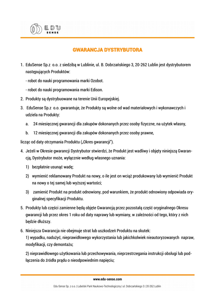 GWARANCJA DYSTRYBUTORA 1. EduSense Sp.z o.o. z siedzibą w Lublinie, ul. B. Dobrzańskiego 3, 20-262 Lublin jest dystrybutorem następujących Produktów: - robot do nauki programowania marki Ozobot. - robot do nauki programowania marki Edison. 2. Produkty są dystrybuowane na terenie Unii Europejskiej. 3. EduSense Sp.z o.o. gwarantuje, że Produkty są wolne od wad materiałowych i wykonawczych i udziela na Produkty: a. 24 miesięcznej gwarancji dla zakupów dokonanych przez osoby fizyczne, na użytek własny, b. 12 miesięcznej gwarancji dla zakupów dokonanych przez osoby prawne, licząc od daty otrzymania Produktu („Okres gwarancji”). 4. Jeżeli w Okresie gwarancji Dystrybutor stwierdzi, że Produkt jest wadliwy i objęty niniejszą Gwarancją, Dystrybutor może, wyłącznie według własnego uznania: 1) bezpłatnie usunąć wadę; 2) wymienić reklamowany Produkt na nowy, o ile jest on wciąż produkowany lub wymienić Produkt na nowy o tej samej lub wyższej wartości; 3) zamienić Produkt na produkt odnowiony, pod warunkiem, że produkt odnowiony odpowiada oryginalnej specyfikacji Produktu. 5. Produkty lub części zamienne będą objęte Gwarancją przez pozostałą część oryginalnego Okresu gwarancji lub przez okres 1 roku od daty naprawy lub wymiany, w zależności od tego, który z nich będzie dłuższy. 6. Niniejsza Gwarancja nie obejmuje strat lub uszkodzeń Produktu na skutek: 1) wypadku, nadużyć, nieprawidłowego wykorzystania lub jakichkolwiek nieautoryzowanych napraw, modyfikacji, czy demontażu; 2) nieprawidłowego użytkowania lub przechowywania, nieprzestrzegania instrukcji obsługi lub podłączenia do źródła prądu o nieodpowiednim napięciu; 3) zgubienia oryginalnych części Produktu; 4) normalnego zużycia; 5) szkodliwego oprogramowania lub innych działań pozostających poza zakresem kontroli ze strony Dystrybutora lub Producenta 7. Gwarancja nie wyłącza, nie ogranicza ani nie zawiesza uprawnień kupującego wynikających z przepisów o rękojmi za wady rzeczy sprzedanej. 8. Gwarancja jest niezbywalna, ograniczona do pierwszego kupującego i ograniczona do państwa, w którym dokonano zakupu Produktów. 9. EduSense Sp.z o.o. w żadnym wypadku nie ponosi odpowiedzialności za poniesione przez klienta szkody celowe, przypadkowe lub następcze wynikające z naruszenia gwarancji, naruszenia umowy, zaniedbania lub odpowiedzialności na zasadzie ryzyka. Tego rodzaju szkody mogą obejmować: utratę zysków, oszczędności lub przychodów, niemożność użytkowania produktu lub powiązanych z nim akcesoriów, niemożność użytkowania sprzętu lub oprogramowania, koszty urządzenia zastępczego, roszczenia osób trzecich, szkody majątkowe i/lub utratę wartości przedsiębiorstwa. Instrukcja korzystania z serwisu gwarancyjnego: Skontaktuj się ze sklepem, w którym dokonałeś zakupu celem stwierdzenia, czy Twój Produkt podlega wymianie gwarancyjnej. Jeśli będzie się kwalifikował, zwróć Produkt w oryginalnym opakowaniu lub innym opakowaniu zapewniającym ten sam stopień zabezpieczenia Produktu. Przed przyjęciem do usługi gwarancyjnej będziemy też wymagali okazania dowodu zakupu (paragon/faktura). Pamiętaj aby wykonać kopię zapasową danych, oprogramowania lub innych materiałów, które są przechowywane są w Twoim Produkcie.