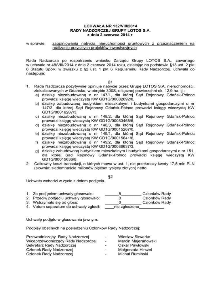 UCHWAŁA NR 132/VIII/2014 RADY NADZORCZEJ GRUPY LOTOS S.A. z dnia 2 czerwca 2014 r. w sprawie: zaopiniowania nabycia nieruchomości gruntowych z przeznaczeniem na realizację przyszłych projektów inwestycyjnych Rada Nadzorcza po rozpatrzeniu wniosku Zarządu Grupy LOTOS S.A., zawartego w uchwale nr 48/VIII/2014 z dnia 2 czerwca 2014 roku, działając na podstawie §13 ust. 2 pkt 6 Statutu Spółki w związku z §2 ust. 1 pkt 6 Regulaminu Rady Nadzorczej, uchwala co następuje: 1. 2. §1 Rada Nadzorcza pozytywnie opiniuje nabycie przez Grupę LOTOS S.A. nieruchomości, zlokalizowanych w Gdańsku, w obrębie 300S, o łącznej powierzchni ok. 12,9 ha, tj.: a) działkę niezabudowaną o nr 147/1, dla której Sąd Rejonowy Gdańsk-Północ prowadzi księgę wieczystą KW GD1G/00082692/8, b) działkę zabudowaną budynkiem mieszkalnym i budynkami gospodarczymi o nr 147/2, dla której Sąd Rejonowy Gdańsk-Północ prowadzi księgę wieczystą KW GD1G/00016287/3, c) działkę niezabudowaną o nr 148/2, dla której Sąd Rejonowy Gdańsk-Północ prowadzi księgę wieczystą KW GD1G/00083468/6, d) działkę niezabudowaną o nr 148/3, dla której Sąd Rejonowy Gdańsk-Północ prowadzi księgę wieczystą KW GD1G/00015267/0, e) działkę niezabudowaną o nr 149/1, dla której Sąd Rejonowy Gdańsk-Północ prowadzi księgę wieczystą KW GD1G/00015641/6, f) działkę niezabudowaną o nr 149/2, dla której Sąd Rejonowy Gdańsk-Północ prowadzi księgę wieczystą KW GD1G/00086637/3, g) działkę zabudowaną budynkiem mieszkalnym i budynkami gospodarczymi o nr 151, dla której Sąd Rejonowy Gdańsk-Północ prowadzi księgę wieczystą KW GD1G/00015636/8. Całkowity koszt transakcji, o których mowa w ust. 1, nie przekroczy kwoty 17,5 mln PLN (słownie: siedemnaście milionów pięćset tysięcy złotych) netto. §2 Uchwała wchodzi w życie z dniem podjęcia. 1. 2. 3. 4. Za podjęciem uchwały głosowało: Przeciw podjęciu uchwały głosowało: Wstrzymało się od głosu: Votum separatum do uchwały zgłosił: ______5_________ Członków Rady ______0_________ Członków Rady ______0_________ Członków Rady ____nie zgłoszono___________ Uchwałę podjęto w głosowaniu jawnym. Podpisy obecnych na posiedzeniu Członków Rady Nadzorczej: Przewodniczący Rady Nadzorczej Wiceprzewodniczący Rady Nadzorczej Sekretarz Rady Nadzorczej Członek Rady Nadzorczej Członek Rady Nadzorczej - Wiesław Skwarko Marcin Majeranowski Oskar Pawłowski Małgorzata Hirszel Michał Rumiński