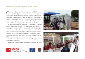 STOISKA PROMOCYJNE OTOP NA LUBELSZCZYŹNIE C rody. Oby było nas jak najwięcej! Pierwszy Lubelski Wyścig Kaczek – stoisko OTOP. fot. Bartłomiej Ebertowski OTOP na obchodach nocy świętojańskiej w gminie Dorohusk. fot. Bartłomiej Ebertowski zerwiec w Lubelskim Biurze Regionalnym OTOP upłynął w rozjazdach. Oprócz wykonywania prac terenowych, zawitaliśmy ze stoiskiem promocyjnym w Lublinie na Pierwszym Lubelskim Wyścigu Kaczek oraz w Świerżach (gmina Dorohusk) na obchodach nocy świętojańskiej. Dzięki gościnności organizatorów tych wydarzeń, dotarliśmy do ludzi, których porusza problem ochrony przyrody, w tym ochrony ptaków. Na wystawionych przez nas stoiskach mieszkańcy Lubelszczyzny mieli do dyspozycji wiele materiałów informacyjnych dotyczących ochrony ptaków i ich siedlisk. Było to też miejsce promocji projektów: „Zarządzanie siedliskiem wodniczki poprzez wdrożenie zrównoważonych systemów zagospodarowania biomasy” oraz „Ochrona różnorodności gatunkowej cennych przyrodniczo siedlisk na użytkach rolnych na obszarach Natura 2000 w woj. lubelskim”. Cieszyło nas wielkie zainteresowanie odwiedzających, zarówno dorosłych, jak i dzieci. Dziękujemy wszystkim, których porusza temat ochrony przy-