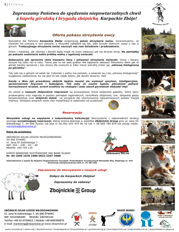 1|Strona Zapraszamy Państwa do spędzenia niepowtarzalnych chwil z kapelą góralską i brygadą zbójnicką Karpackie Zbóje! Oferta pokazu strzyżenia owcy Specjalnie dla Państwa Karpackie Zbóje zorganizują pokaz strzyżenia owiec. Gwarantujemy, że owieczki nie ucierpią w tym pokazie, a wszystko odbędzie się tak, jako bywało dawnymi czasy u nas w górach. Tradycyjnego strzyżenia owiec nauczyli nas nasi dziadowie i pradziadowie. Dzieci i młodzież, ale również i dorośli będą mogli na żywo zobaczyć jak się strzyże owcę. Na pamiątkę po pokazie weźmiecie sobie próbkę wełny z ogolonej owieczki. Zobaczycie jak sprawnie idzie naszemu bacy i juhasowi strzyżenie owieczki. Owce i barany strzyże się tylko raz w roku. Także jest to nie lada gratka! Nie będziecie żałować! Pokażemy Wam jak to górale bardzo sprawnie i bez stresu dla owieczki w kilka minut potrafią zrobić jej „odnowę biologiczną po góralsku”. Tak robi się w górach od setek lat. Człowiek z wełny ma pożytek, a owieczki są z tej „odnowy biologicznej” wyjątkowo zadowolone, bo nie jest im tak ciepło latem, jak słonko skwarzy. Hej! Kozdy z Wos jak prawdziwy zbójnik będzie musioł sie wykozać sprytem, inteligencjom, sprawnościom fizycnom i łodwagom. Tak zeby ze swoim łupem, plecokiem pełnym harnasiowych wrażeń, wrócił scośliwy ku chałupie i zeby sławił gorolskom ślebode! Hej! Za udział w naszych zbójnickich imprezach są przewidziane liczne zbójnickie gadżety, które sami produkujemy oraz nagrody w postaci pamiątek regionalnych, certyfikaty zbójnickie, tzw. zbójeckie glejty bezpieczeństwa oraz zbójnicki dukat na szczęście dla uhonorowania najważniejszych postaci Twojej imprezy. Niniejszy program może ulec modyfikacji w zależności od oczekiwań. Rezerwacja Wszystkie usługi na zapytanie z indywidualną kalkulacją! Skorzystanie z odpowiednich atrakcji wymaga wcześniejszej rezerwacji, której można dokonać w siedzibie Zbójnickie Group przy ul. Jana III Sobieskiego 7, 34-300 Żywiec lub pod nr tel./fax 033 475 96 52 lub + 48 609 789 879 lub pisząc maila: [email protected] Dane do przelewu: ZBÓJNICKI SZLAK LESZEK MŁODZIANOWSKI 34-300 ŻYWIEC Ul. Jana III Sobieskiego 7 NIP: 553 – 230 – 63 – 40 REGON: 240 745 145 KONTO BANKOWE ZŁOTÓWKOWE ING BANK ŚLĄSKI Nr. 84 1050 1070 1000 0023 2267 3688 Zaświadczenie o wpisie do Rejestru Organizatorów Turystyki i Pośredników Turystycznych Marszałka Woj. Śląskiego nr. 944 Gwarancja ubezpieczeniowa AXA nr. 01.281.630 Zapraszamy do skorzystania z naszych usług! Dołącz do Karpackich Zbójów! Zapraszamy do zabawy! ZBÓJNICKI SZLAK LESZEK MŁODZIANOWSKI Ul. Jana III Sobieskiego 7, 34-300 ŻYWIEC NIP: 5532306340 REGON: 240745145 Tel/fax +48 33 4759652 | Mobile +48 609789879 e-mail: [email protected] www.zbojnickie.pl NASZE MARKI zywiec.turystyka.pl | zywiec.org | zbojnickitravel.pl | karpackigazda.pl |karpackiezboje.pl | goralskicatering.pl | jacentyignatowicz.pl | kuligi.beskidy.com.pl | zbojnickisklep.na.allegro.pl