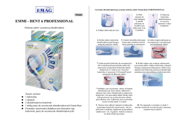 Używanie ultradźwiękowego systemu ochrony zębów Emmi-dent 6 PROFESSIONAL: Polski 2. Włóż rękojeść do stacji ładującej w sposób pokazany na rysunku (czas ładowania: 8 do 12 godzin): 3. Zamocuj końcówkę ultradźwiękową na szczycie rękojeści i włącz urządzenie. 5. Umieść niewielką ilość pasty Emmi-dent (wielkości dwóch ziaren grochu) na szczoteczce 6. Lekko rozprowadź pastę na wewnętrznych i zewnętrznych powierzchniach zębów EMMI - DENT 6 PROFESSIONAL Ochrona zębów za pomocą ultradźwięków 1. Podłącz ładowarkę do sieci. 4. Krótko opłucz końcówkę ultradźwiękową pod bieżącą wodą aby zmoczyć włoski 7. Lekko przyłóż końcówkę do zewnętrznych lub wewnętrznych powierzchni zębów bez poruszania szczoteczką! Końcówka będzie obejmować 2-3 zęby na raz. Pozostaw końcówkę w tej pozycji 5-10 sekund* przed przejściem do dalszych zębów ● ● ● ● ● Zestaw zawiera: 1 ładowarkę 1 rękojeść 2 ultradźwiękowe końcówki 1 tubkę pasty do szczoteczek ultradźwiękowych Emmi-Dent Formularz zamówienia dodatkowych elementów (np. końcówek, pasty do szczoteczek ultradźwiękowych) 8. Krótko opłucz usta wodą po zakończeniu czyszczenia zębów. Opłucz końcówkę i rękojeść bieżącą wodą przed wyłączeniem i lekko osusz rękojeść (nie końcówkę, ponieważ ultradźwięki automatycznie zdezynfekują włoski końcówki). * Dokładny czas czyszczenia zależy od stopnia zabrudzenia (np. ilości nalotu, odbarwień z nikotyny lub wina). Ultradźwięki są całkowicie bezpieczne i nie spowodują żadnej szkody także jeśli przytrzyma się szczoteczkę przy zębach przez dłuższy czas. Całkowity czas czyszczenia wynosi zwykle około 3-4 minut 9. Możesz teraz odłożyć rękojeść na ładowarkę zostawiając końcówkę zamocowaną - lub też, jeśli jesteś w podróży, zapakować ją (po pełnym załadowaniu - ok. 12 godzin - bateria wystarcza na około 20 dni używania) 10. Nie zapomnij o wymianie co około 3 miesiące końcówki szczoteczki (przy zalecanej częstości mycia zębów) Opis produktu: Prawidłowe użycie: Wszystkie produkty mogą być stosowane wyłącznie w celach i przypadkach zastosowań przewidzianych w katalogach i opisach technicznych, tj. do czyszczenia zębów, i przy zastosowaniu jedynie rekomendowanych lub dopuszczonych przez EMAG AG elementów i urządzeń dodatkowych. Jakiekolwiek inne użycie poza wspomnianym jest uznawane za użycie nieprawidłowe. EMAG AG nie ponosi żadnej odpowiedzialności za jakiekolwiek szkody wynikłe z nieprawidłowego użycia ani nie gwarantuje odpowiedniego i bezbłędnego działania urządzenia i jego komponentów w wypadku nieprawidłowego użycia. Do prawidłowego użycia zalicza się również stosowanie wszystkich zaleceń zawartych w instrukcjach użytkowania. Jest to dodatkowo oznaczone symbolem wykrzyknika na tabliczce znamionowej. Bezbłędne i bezpieczne użytkowanie produktów zależy także od odpowiedniego transportu, składowania, montażu i instalacji, jak też ostrożnego obchodzenia się i konserwacji. Prawidłowe użycie zawiera również stosowanie się do zaleceń regularnej kontroli wg. Regulaminu Zapobiegania Wypadkom A3. Urządzenie musi być podłączone w sposób pozwalający na łatwy dostęp do wtyczki ładowarki w dowolnym momencie. Rękojeść z włącznikiem i źródłem zasilania Ładowarka Pasta do szczoteczek ultradźwiękowych Końcówki z generatorami ultradźwięków Dane techniczne: Parametry Długość (z końcówką) Szerokość Źródło zasilania: - Ładowarka - Rękojeść Klasa bezpieczeństwa Waga Wartości Jednostki 250 mm 40 x 30 mm 230 V~/50 Hz 12 V IP 42 - około 500 g Nieprawidłowe użycie: Nieprawidłowe użycie produktu może być niebezpieczne i spowodować zagrożenie zdrowia lub życia jak też straty materialne. Z tego powodu zabronione jest używanie urządzenia w jakimkolwiek celu poza tymi do których jest przeznaczone. EMAG AG nie ponosi żadnej odpowiedzialności wynikającej z nieprawidłowego użycia ani nie gwarantuje odpowiedniego i bezbłędnego działania urządzenia i jego komponentów podczas używania w nieprawidłowy sposób. Prosimy o zastosowanie się do następujących zaleceń w celu zapewnienia prawidłowego użycia produktu: ● Należy używać ultradźwiękowego systemu ochrony zębów wyłącznie w połączeniu z siecią o napięciu oznaczonym na tabliczce znamionowej (na spodzie ładowarki), w uziemionej wtyczce elektrycznej. ● Nie należy czyścić urządzenia łatwopalnymi lub żrącymi chemikaliami (kwasy itp.) ● W przypadku uszkodzenia w transporcie nie należy podłączać ładowarki do prądu. ● Urządzenie powinno być używane w pomieszczeniach w temperaturze pokojowej Instrukcje użytkowania: Włóż wtyczkę ładowarki do gniazdka (230V ~/50Hz), umieść rękojeść na ładowarce i pozostaw w celu załadowania przez około 8-12 godzin. Kiedy rękojeść jest podłączona do ładowarki, dioda pod włącznikiem zmieni kolor na czerwony na znak że urządzenie ładuje się prawidłowo (dioda pozostanie czerwona także gdy bateria jest w pełni załadowana a rękojeść pozostaje położona na ładowarce - proces ładowania jest przerywany automatycznie). Zdejmij rękojeść z ładowarki i zamocuj końcówkę ultradźwiękową na szczycie rękojeści (zawsze mocuj i zdejmuj końcówkę z rękojeści pionowo aby zapobiec uszkodzeniu bolców kontaktowych na szczycie rękojeści - nie obracaj końcówki!). Umieść na chwilę końcówkę pod bieżącą wodą aby zmoczyć włoski i umieść niewielką ilość (około 2 razy wielkości ziarnka grochu) pasty na końcówce. Uwaga: używaj jedynie pasty Emmi-dent ponieważ konwencjonalne pasty nie mogą utworzyć mikropęcherzyków. Włącz urządzenie. Szczoteczka ultradźwiękowa zacznie generować fale ultradźwiękowe ponad włoskami końcówki, regulowane przez elektronikę w rękojeści. Po włączeniu urządzenia 