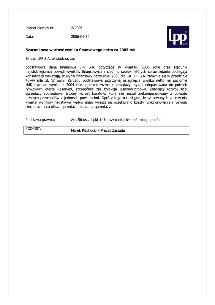 Raport bieżący nr: 2/2006 Data: 2006-01-30 Szacunkowa wartość wyniku finansowego netto za 2005 rok Zarząd LPP S.A. oświadcza, że: podstawowe dane finansowe LPP S.A. dotyczące IV kwartału 2005 roku oraz szacunki najistotniejszych pozycji wyników finansowych z siedmiu spółek, których sprawozdania podlegają konsolidacji wskazują, iż wynik finansowy netto roku 2005 dla GK LPP S.A. zamknie się w przedziale 40-44 mln zł. W opinii Zarządu podstawową przyczyną osiągnięcia wyniku netto na poziomie zbliżonym do wyniku z 2004 roku pomimo wzrostu sprzedaży, była niedopasowana do potrzeb rynkowych oferta Reserved, szczególnie zaś kolekcja jesienno-zimowa. Znaczący rozwój sieci sprzedaży spowodował istotny wzrost kosztów, który nie został zrekompensowany z powodu niższych przychodów z jednostki powierzchni. Oprócz tego na osiągnięcie szacowanych za czwarty kwartał wyników negatywny wpływ miały wyższe niż oczekiwano koszty funkcjonowania i rozwoju sieci oraz nieco niższa sprzedaż i marża na sprzedaży. Podstawa prawna: Art. 56 ust. 1 pkt 1 Ustawy o ofercie - informacje poufne PODPISY: Marek Piechocki – Prezes Zarządu