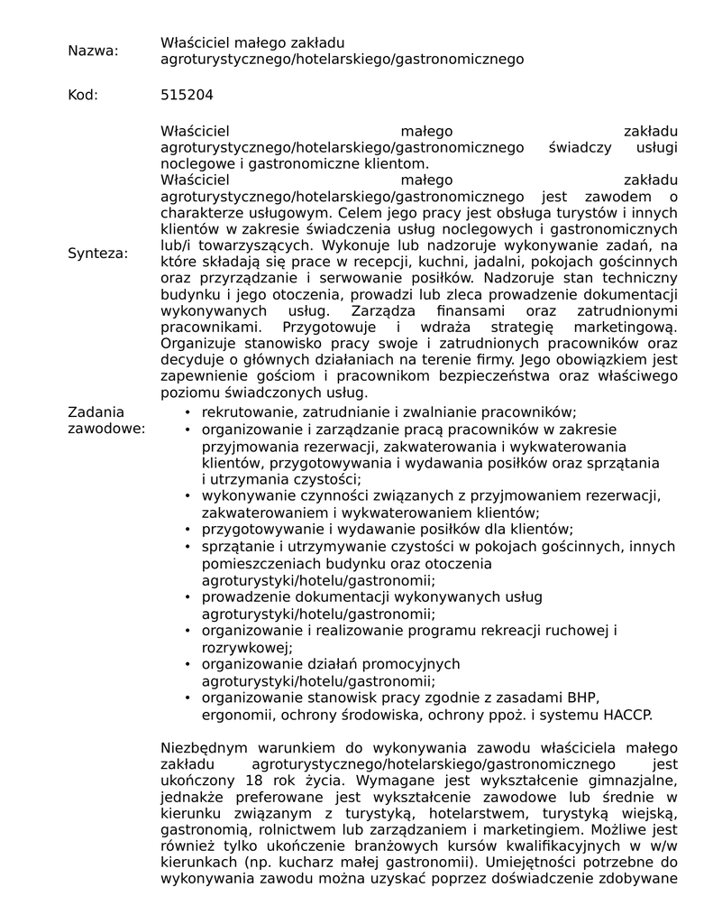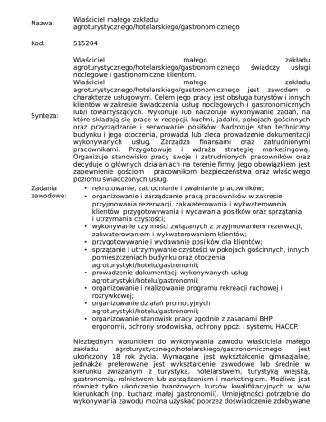 Nazwa: Właściciel małego zakładu agroturystycznego/hotelarskiego/gastronomicznego Kod: 515204 Synteza: Zadania zawodowe: Właściciel małego zakładu agroturystycznego/hotelarskiego/gastronomicznego świadczy usługi noclegowe i gastronomiczne klientom. Właściciel małego zakładu agroturystycznego/hotelarskiego/gastronomicznego jest zawodem o charakterze usługowym. Celem jego pracy jest obsługa turystów i innych klientów w zakresie świadczenia usług noclegowych i gastronomicznych lub/i towarzyszących. Wykonuje lub nadzoruje wykonywanie zadań, na które składają się prace w recepcji, kuchni, jadalni, pokojach gościnnych oraz przyrządzanie i serwowanie posiłków. Nadzoruje stan techniczny budynku i jego otoczenia, prowadzi lub zleca prowadzenie dokumentacji wykonywanych usług. Zarządza finansami oraz zatrudnionymi pracownikami. Przygotowuje i wdraża strategię marketingową. Organizuje stanowisko pracy swoje i zatrudnionych pracowników oraz decyduje o głównych działaniach na terenie firmy. Jego obowiązkiem jest zapewnienie gościom i pracownikom bezpieczeństwa oraz właściwego poziomu świadczonych usług. • rekrutowanie, zatrudnianie i zwalnianie pracowników; • organizowanie i zarządzanie pracą pracowników w zakresie przyjmowania rezerwacji, zakwaterowania i wykwaterowania klientów, przygotowywania i wydawania posiłków oraz sprzątania i utrzymania czystości; • wykonywanie czynności związanych z przyjmowaniem rezerwacji, zakwaterowaniem i wykwaterowaniem klientów; • przygotowywanie i wydawanie posiłków dla klientów; • sprzątanie i utrzymywanie czystości w pokojach gościnnych, innych pomieszczeniach budynku oraz otoczenia agroturystyki/hotelu/gastronomii; • prowadzenie dokumentacji wykonywanych usług agroturystyki/hotelu/gastronomii; • organizowanie i realizowanie programu rekreacji ruchowej i rozrywkowej; • organizowanie działań promocyjnych agroturystyki/hotelu/gastronomii; • organizowanie stanowisk pracy zgodnie z zasadami BHP, ergonomii, ochrony środowiska, ochrony ppoż. i systemu HACCP. Niezbędnym warunkiem do wykonywania zawodu właściciela małego zakładu agroturystycznego/hotelarskiego/gastronomicznego jest ukończony 18 rok życia. Wymagane jest wykształcenie gimnazjalne, jednakże preferowane jest wykształcenie zawodowe lub średnie w kierunku związanym z turystyką, hotelarstwem, turystyką wiejską, gastronomią, rolnictwem lub zarządzaniem i marketingiem. Możliwe jest również tylko ukończenie branżowych kursów kwalifikacyjnych w w/w kierunkach (np. kucharz małej gastronomii). Umiejętności potrzebne do wykonywania zawodu można uzyskać poprzez doświadczenie zdobywane w trakcie pracy. Właściciel małego zakładu agroturystycznego powinien posiadać prawo jazdy kategorii B. Wskazana jest znajomość jednego języka obcego na poziomie podstawowym. Dodatkowe zadania zawodowe: Uwaga – opis standardów kompetencji zawodowych dla tego zawodu można znaleźć w bazie danych: www.kwalifikacje.praca.gov.pl