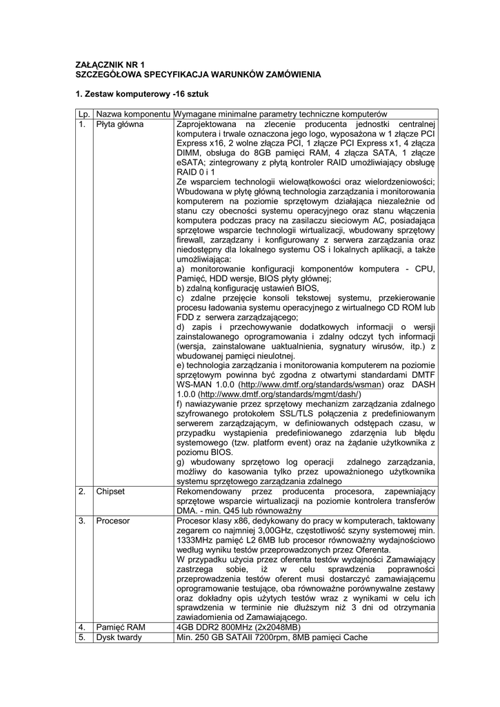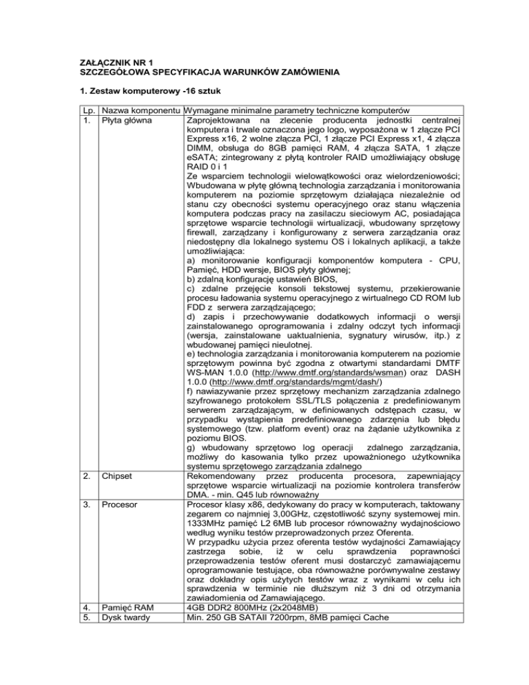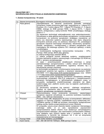 ZAŁĄCZNIK NR 1 SZCZEGÓŁOWA SPECYFIKACJA WARUNKÓW ZAMÓWIENIA 1. Zestaw komputerowy -16 sztuk Lp. Nazwa komponentu Wymagane minimalne parametry techniczne komputerów 1. Płyta główna Zaprojektowana na zlecenie producenta jednostki centralnej komputera i trwale oznaczona jego logo, wyposażona w 1 złącze PCI Express x16, 2 wolne złącza PCI, 1 złącze PCI Express x1, 4 złącza DIMM, obsługa do 8GB pamięci RAM, 4 złącza SATA, 1 złącze eSATA; zintegrowany z płytą kontroler RAID umożliwiający obsługę RAID 0 i 1 Ze wsparciem technologii wielowątkowości oraz wielordzeniowości; Wbudowana w płytę główną technologia zarządzania i monitorowania komputerem na poziomie sprzętowym działająca niezależnie od stanu czy obecności systemu operacyjnego oraz stanu włączenia komputera podczas pracy na zasilaczu sieciowym AC, posiadająca sprzętowe wsparcie technologii wirtualizacji, wbudowany sprzętowy firewall, zarządzany i konfigurowany z serwera zarządzania oraz niedostępny dla lokalnego systemu OS i lokalnych aplikacji, a także umożliwiająca: a) monitorowanie konfiguracji komponentów komputera - CPU, Pamięć, HDD wersje, BIOS płyty głównej; b) zdalną konfigurację ustawień BIOS, c) zdalne przejęcie konsoli tekstowej systemu, przekierowanie procesu ładowania systemu operacyjnego z wirtualnego CD ROM lub FDD z serwera zarządzającego; d) zapis i przechowywanie dodatkowych informacji o wersji zainstalowanego oprogramowania i zdalny odczyt tych informacji (wersja, zainstalowane uaktualnienia, sygnatury wirusów, itp.) z wbudowanej pamięci nieulotnej. e) technologia zarządzania i monitorowania komputerem na poziomie sprzętowym powinna być zgodna z otwartymi standardami DMTF WS-MAN 1.0.0 (http://www.dmtf.org/standards/wsman) oraz DASH 1.0.0 (http://www.dmtf.org/standards/mgmt/dash/) f) nawiazywanie przez sprzętowy mechanizm zarządzania zdalnego szyfrowanego protokołem SSL/TLS połączenia z predefiniowanym serwerem zarządzającym, w definiowanych odstępach czasu, w przypadku wystąpienia predefiniowanego zdarzęnia lub błędu systemowego (tzw. platform event) oraz na żądanie użytkownika z poziomu BIOS. g) wbudowany sprzętowo log operacji zdalnego zarządzania, możliwy do kasowania tylko przez upoważnionego użytkownika systemu sprzętowego zarządzania zdalnego 2. Chipset Rekomendowany przez producenta procesora, zapewniający sprzętowe wsparcie wirtualizacji na poziomie kontrolera transferów DMA. - min. Q45 lub równoważny 3. Procesor Procesor klasy x86, dedykowany do pracy w komputerach, taktowany zegarem co najmniej 3,00GHz, częstotliwość szyny systemowej min. 1333MHz pamięć L2 6MB lub procesor równoważny wydajnościowo według wyniku testów przeprowadzonych przez Oferenta. W przypadku użycia przez oferenta testów wydajności Zamawiający zastrzega sobie, iż w celu sprawdzenia poprawności przeprowadzenia testów oferent musi dostarczyć zamawiającemu oprogramowanie testujące, oba równoważne porównywalne zestawy oraz dokładny opis użytych testów wraz z wynikami w celu ich sprawdzenia w terminie nie dłuższym niż 3 dni od otrzymania zawiadomienia od Zamawiającego. 4. Pamięć RAM 4GB DDR2 800MHz (2x2048MB) 5. Dysk twardy Min. 250 GB SATAII 7200rpm, 8MB pamięci Cache 6. 7. 8. 9. 10. 11. 12. 13. 14. 15. 16. Zintegrowana, z możliwością dynamicznego przydzielenia pamięci w obrębie pamięci systemowej do 256MB, np. Intel GMA X4500 lub równoważna Karta dźwiękowa Karta dźwiękowa zintegrowana z płytą główną, zgodna z High Definition (ADI 1984A), wewnętrzny głośnik w obudowie komputera Karta sieciowa 10/100/1000 Ethernet RJ 45, zintegrowana z płytą umożliwiająca zdalny dostęp do komputera z poziomu konsoli zarządzająco – diagnostycznej producenta komputera. Porty Wbudowane: 1 x LPT; 1 x RS232, VGA, eSATA, 2 x PS/2, DisplayPort; min. 11 x USB, w tym 10 portów wyprowadzonych na zewnątrz komputera: min. 4 z przodu obudowy i 6 z tyłu, port sieciowy RJ-45, porty słuchawek i mikrofonu na przednim oraz tylnym panelu obudowy. Wymagana ilość i rozmieszczenie (na zewnątrz obudowy komputera) portów USB nie może być osiągnięta w wyniku stosowania konwerterów, przejściówek itp. Klawiatura Klawiatura USB w układzie polski programisty – trwale oznaczona logo producenta jednostki centralnej Mysz Mysz laserowa USB z sześcioma klawiszami oraz rolką (scroll) min 1000dpi – trwale oznaczona logo producenta Napęd optyczny Nagrywarka DVD +/-RW wraz z oprogramowaniem do nagrywania płyt Obudowa Typu Mini Tower (2 x 5,25” zewnętrzne, 1 x 3,5” zewnętrzne i 2 x 3,5” wewnętrzne) Moduł konstrukcji obudowy w jednostce centralnej komputera powinien pozwalać na demontaż kart rozszerzeń i napędów bez konieczności użycia narzędzi (wyklucza się użycia wkrętów, śrub motylkowych); Obudowa w jednostce centralnej musi być otwierana bez konieczności użycia narzędzi (wyklucza się użycie standardowych wkrętów, śrub motylkowych) oraz powinna posiadać czujnik otwarcia obudowy współpracujący z oprogramowaniem zarządzająco – diagnostycznym producenta komputera; Obudowa musi umożliwiać zastosowanie zabezpieczenia fizycznego w postaci linki metalowej (złącze blokady Kensingtona) oraz kłódki (oczko w obudowie do założenia kłódki) Zasilacz o mocy max. 255W i wydajności 88% W obudowę komputera musi być wbudowany wizualny system diagnostyczny, służący do sygnalizowania i diagnozowania problemów z komputerem i jego komponentami; a w szczególności musi sygnalizować: Przebieg procedury POST Sum kontrolnych BIOSu Awarii procesora lub pamięci podręcznej procesora Uszkodzenia lub braku pamięci RAM, uszkodzenia złączy PCI, kontrolera Video, dysku twardego, płyty głównej, kontrolera USB System operacyjny Wersja angielska Microsoft Windows Vista Bussines 32-bit z SP1 wraz z preinstalowanym fabrycznie systemem Microsoft Windows XP Professional z Service Pack 3, z