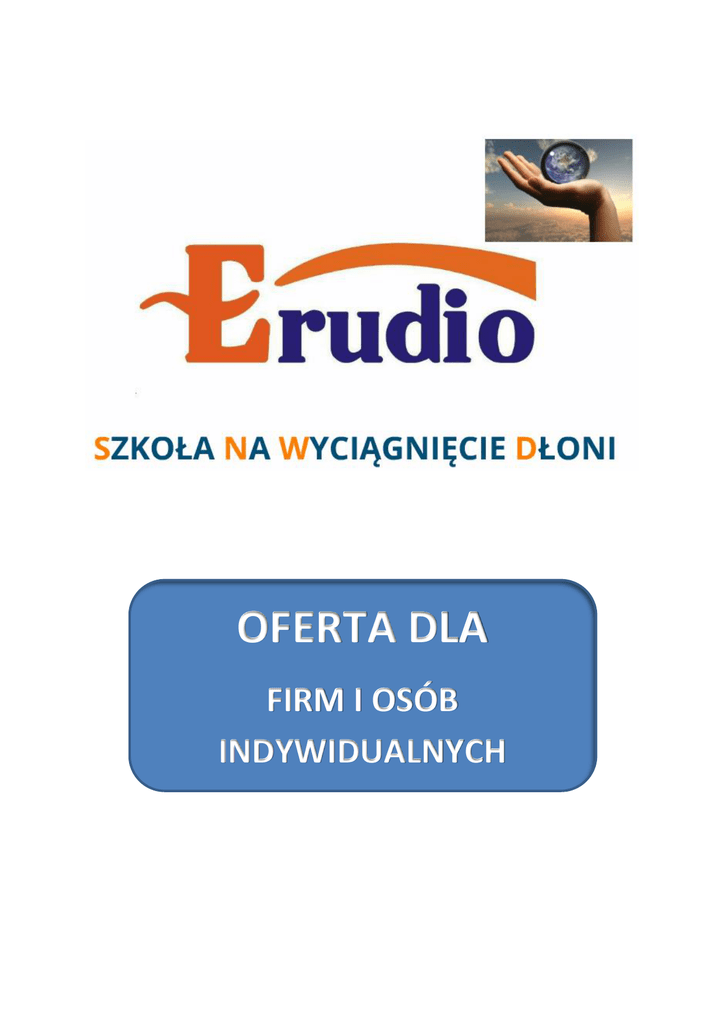 OFERTA DLA FIRM I OSÓB INDYWIDUALNYCH ERUDIO to ludzie z pasją... ERUDIO istnieje na rynku usług edukacyjnych w Łodzi od 2007 roku. Z roku na rok mogą Państwo obserwować dynamiczny rozwój organizacji, która rozpoczynała swoją działalność głównie na polu kursów specjalistycznych i kwalifikacyjnych skierowanych do pielęgniarek i położnych. Obecnie oferta ERUDIO jest na tyle bogata, że każdy znajdzie coś dla siebie. Misja ERUDIO Naszą misją jest systematyczne podnoszenie jakości pracy we wszystkich obszarach działalności placówki. W ERUDIO zawsze panuje przyjazna atmosfera. Dokładamy wszelkich starań, aby każdy uczestnik kursu czy szkolenia czuł się pewnie, bezpiecznie i przede wszystkim mógł realizować się w wybranym przez siebie obszarze. Jesteśmy placówką, która: zapewnia wykwalifikowaną kadrę dydaktyczną, uwzględnia indywidualne potrzeby każdego uczestnika kursu, gwarantuje 100% zdawalność egzaminu Państwowego ze specjalizacji w Warszawie, nieustannie się rozwija i poszerza swoją ofertę zgodnie z zapotrzebowaniem, posiada Akredytacją Łódzkiego Kuratora Oświaty, bierze udział w przetargach, aby móc oferować tańsze lub darmowe kursy w ramach Unii Europejskiej, systematycznie tworzy własną historię. Naszą misję realizujemy poprzez: organizację kształcenia dla osób dorosłych, uzupełnianie wiedzy ogólnej, umiejętności i kwalifikacji zawodowych, zgodnie z Rozporządzeniem Ministra Edukacji i Nauki oraz innych przepisów, w następujących pozaszkolnych formach kształcenia: KURSY KOSMETYCZNE • MASAŻU • FOTOGRAFII • FRYZJERSKIE • ARTETERAPIA • MUZYKOTERAPIA • KURSY SZYTE NA MIARĘ organizację kształcenia dla pielęgniarek i położnych, na podstawie zadań określonych w przepisach Rozporządzenia Ministra Zdrowia z dnia 29 października 2003r. w sprawie kształcenia podyplomowego pielęgniarek i położnych wchodzą: SPECJALIZACJE • KUSY KWALIFIKACYJNE • KURSY SPECJALISTYCZNE • KURSY DLA RATOWNIKÓW MEDYCZNYCH • KURS SANITARIUSZ SZPITALNY Numer ewidencyjny wpisu w Wojewódzkim Urzędzie Pracy do Rejestru Instytucji Szkoleniowych: 2.10/00021/2008 GWARANTUJEMY NAJWYŻSZĄ JAKOŚĆ USŁUG SILNY ZESPÓŁ ERUDIO I WYKWALIFIKOWANA KADRA ZAWODOWA: Fundamentem ERUDIO są LUDZIE! Doskonale zdajemy sobie sprawę z wartości czynnika ludzkiego, mającego kluczowe znaczenie w sprawnym funkcjonowaniu organizacji, dlatego nieustannie podnosimy kwalifikacje naszych pracowników! Dzięki temu nasi pracownicy z chęcią i uśmiechem w profesjonalny sposób opowiedzą o ofercie i odpowiedzą na każde nurtujące pytanie. ERUDIO ISTNIEJE: JAK DO NAS DOJECHAĆ? ERUDIO ul. Pomorska 83/85 90-224 Łódź email: [email protected] tel. 42 630 95 59 tel/fax 42 630 73 00 kom. 784 009 277