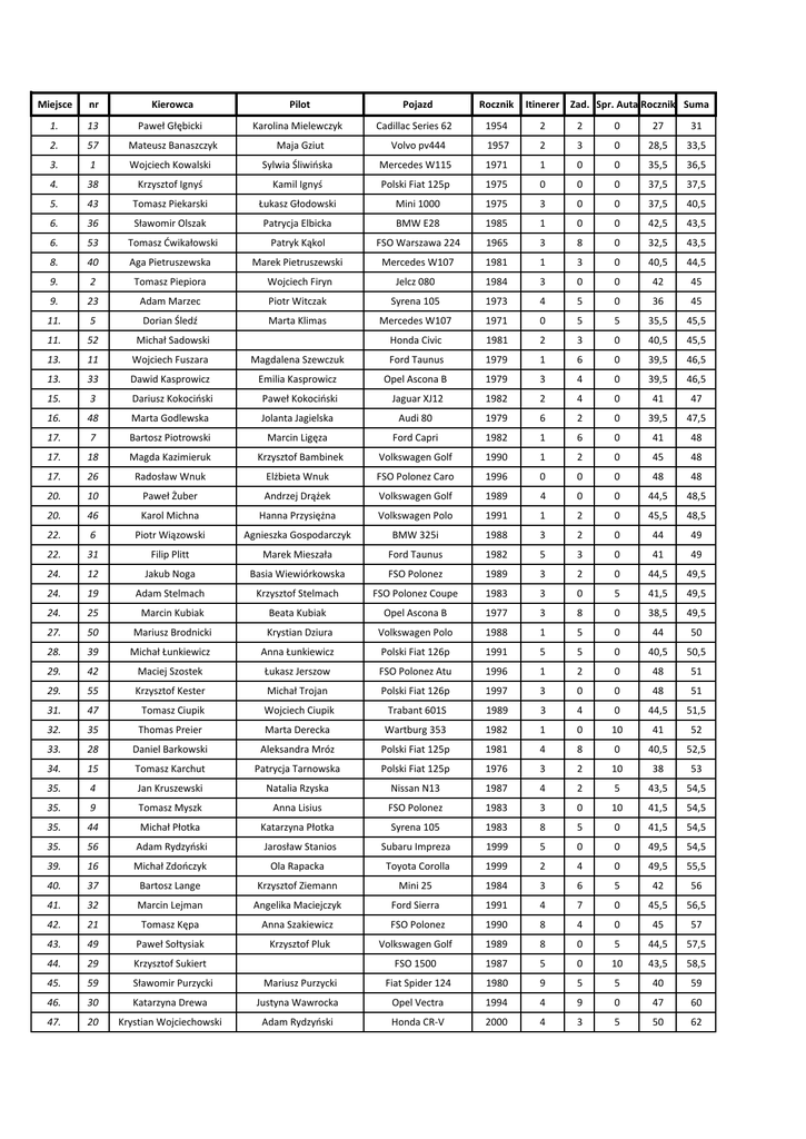 Miejsce nr Kierowca Pilot 1. 13 Paweł Głębicki Karolina Mielewczyk 2. 57 Mateusz Banaszczyk Maja Gziut 3. 1 Wojciech Kowalski 4. 38 Krzysztof Ignyś 5. 43 6. 36 6. Pojazd Cadillac Series 62 Rocznik Itinerer Zad. Spr. Auta Rocznik Suma 1954 2 2 0 27 31 Volvo pv444 1957 2 3 0 28,5 33,5 Sylwia Śliwińska Mercedes W115 1971 1 0 0 35,5 36,5 Kamil Ignyś Polski Fiat 125p 1975 0 0 0 37,5 37,5 Tomasz Piekarski Łukasz Głodowski Mini 1000 1975 3 0 0 37,5 40,5 Sławomir Olszak Patrycja Elbicka BMW E28 1985 1 0 0 42,5 43,5 53 Tomasz Ćwikałowski Patryk Kąkol FSO Warszawa 224 1965 3 8 0 32,5 43,5 8. 40 Aga Pietruszewska Marek Pietruszewski Mercedes W107 1981 1 3 0 40,5 44,5 9. 2 Tomasz Piepiora Wojciech Firyn Jelcz 080 1984 3 0 0 42 45 9. 23 Adam Marzec Piotr Witczak Syrena 105 1973 4 5 0 36 45 11. 5 Dorian Śledź Marta Klimas Mercedes W107 1971 0 5 5 35,5 45,5 11. 52 Michał Sadowski Honda Civic 1981 2 3 0 40,5 45,5 13. 11 Wojciech Fuszara Magdalena Szewczuk Ford Taunus 1979 1 6 0 39,5 46,5 13. 33 Dawid Kasprowicz Emilia Kasprowicz Opel Ascona B 1979 3 4 0 39,5 46,5 15. 3 Dariusz Kokociński Paweł Kokociński Jaguar XJ12 1982 2 4 0 41 47 16. 48 Marta Godlewska Jolanta Jagielska Audi 80 1979 6 2 0 39,5 47,5 17. 7 Bartosz Piotrowski Marcin Ligęza Ford Capri 1982 1 6 0 41 48 17. 18 Magda Kazimieruk Krzysztof Bambinek Volkswagen Golf 1990 1 2 0 45 48 17. 26 Radosław Wnuk Elżbieta Wnuk FSO Polonez Caro 1996 0 0 0 48 48 20. 10 Paweł Żuber Andrzej Drążek Volkswagen Golf 1989 4 0 0 44,5 48,5 20. 46 Karol Michna Hanna Przysiężna Volkswagen Polo 1991 1 2 0 45,5 48,5 22. 6 Piotr Wiązowski Agnieszka Gospodarczyk BMW 325i 1988 3 2 0 44 49 22. 31 Filip Plitt Marek Mieszała Ford Taunus 1982 5 3 0 41 49 24. 12 Jakub Noga Basia Wiewiórkowska FSO Polonez 1989 3 2 0 44,5 49,5 24. 19 Adam Stelmach Krzysztof Stelmach FSO Polonez Coupe 1983 3 0 5 41,5 49,5 24. 25 Marcin Kubiak Beata Kubiak Opel Ascona B 1977 3 8 0 38,5 49,5 27. 50 Mariusz Brodnicki Krystian Dziura Volkswagen Polo 1988 1 5 0 44 50 28. 39 Michał Łunkiewicz Anna Łunkiewicz Polski Fiat 126p 1991 5 5 0 40,5 50,5 29. 42 Maciej Szostek Łukasz Jerszow FSO Polonez Atu 1996 1 2 0 48 51 29. 55 Krzysztof Kester Michał Trojan Polski Fiat 126p 1997 3 0 0 48 51 31. 47 Tomasz Ciupik Wojciech Ciupik Trabant 601S 1989 3 4 0 44,5 51,5 32. 35 Thomas Preier Marta Derecka Wartburg 353 1982 1 0 10 41 52 33. 28 Daniel Barkowski Aleksandra Mróz Polski Fiat 125p 1981 4 8 0 40,5 52,5 34. 15 Tomasz Karchut Patrycja Tarnowska Polski Fiat 125p 1976 3 2 10 38 53 35. 4 Jan Kruszewski Natalia Rzyska Nissan N13 1987 4 2 5 43,5 54,5 35. 9 Tomasz Myszk Anna Lisius FSO Polonez 1983 3 0 10 41,5 54,5 35. 44 Michał Płotka Katarzyna Płotka Syrena 105 1983 8 5 0 41,5 54,5 35. 56 Adam Rydzyński Jarosław Stanios Subaru Impreza 1999 5 0 0 49,5 54,5 39. 16 Michał Zdończyk Ola Rapacka Toyota Corolla 1999 2 4 0 49,5 55,5 40. 37 Bartosz Lange Krzysztof Ziemann Mini 25 1984 3 6 5 42 56 41. 32 Marcin Lejman Angelika Maciejczyk Ford Sierra 1991 4 7 0 45,5 56,5 42. 21 Tomasz Kępa Anna Szakiewicz FSO Polonez 1990 8 4 0 45 57 43. 49 Paweł Sołtysiak Krzysztof Pluk Volkswagen Golf 1989 8 0 5 44,5 57,5 44. 29 Krzysztof Sukiert FSO 1500 1987 5 0 10 43,5 58,5 45. 59 Sławomir Purzycki Mariusz Purzycki Fiat Spider 124 1980 9 5 5 40 59 46. 30 Katarzyna Drewa Justyna Wawrocka Opel Vectra 1994 4 9 0 47 60 47. 20 Krystian Wojciechowski Adam Rydzyński Honda CR-V 2000 4 3 5 50 62 48. 54 48. 60 50. 8 51. 52. Marcin Stypulski Sebastian Adamczyk Karolina Łempio Ford Escort 1990 6 2 10 45 63 Volkswagen T4 1994 6 5 5 47 63 Honda Civic 1999 5 4 5 49,5 63,5 Monika Kozłowska Wartburg 312 1963 5 6 25 31,5 67,5 Robert Tkaczyk Volkswagen Golf 1 1977 9 8 15 38,5 70,5 Mateusz Kopiś Syrena 105 1975 27 8 0 37,5 72,5 Patrycja Kaniuk Honda Civic 1998 4 2 20 49 75 Sylwia Leśniewska Wartburg 353 S 1988 27 9 10 44 90 Volkswagen Garbus 1968 27 14 25 34 100 Nysa 522 1990 27 11 25 45 108 Andrzej Chlebowski FSO Polonez Caro + 1999 21 14 25 49,5 109,5 Paweł Piepiórka Opel Kadett E 1991 27 14 25 45,5 111,5 Paweł Witkowski Jolanta Zdończyk Mirosław Zdończyk 41 Piotr Kozłowski 24 Mateusz Budzyński 53. 14 Maciej Kopiś 54. 34 Michał Maliński 55. 22 Maciej Tomkowicz 56. 27 Marcin Sieciński Asia Drawc 57. 58 Tomasz Kamać 58. 45 Maciej Kiernicki 59. 51 Andrzej Miśniakiewicz