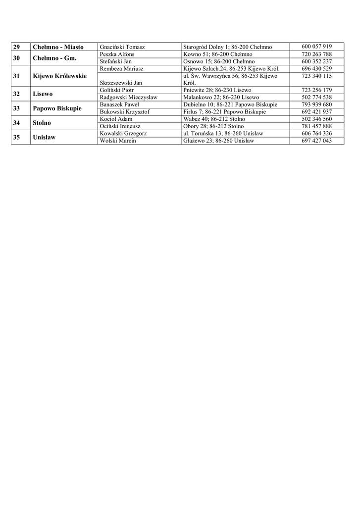 29 Chełmno - Miasto 30 Chełmno - Gm. 31 Kijewo Królewskie 32 Lisewo 33 Papowo Biskupie 34 Stolno 35 Unisław Gnaciński Tomasz Peszka Alfons Stefański Jan Rembeza Mariusz Skrzeszewski Jan Goliński Piotr Radgowski Mieczysław Banaszek Paweł Bukowski Krzysztof Kocioł Adam Ociński Ireneusz Kowalski Grzegorz Wolski Marcin Starogród Dolny 1; 86-200 Chełmno Kowno 51; 86-200 Chełmno Osnowo 15; 86-200 Chełmno Kijewo Szlach.24; 86-253 Kijewo Król. ul. Św. Wawrzyńca 56; 86-253 Kijewo Król. Pniewite 28; 86-230 Lisewo Malankowo 22; 86-230 Lisewo Dubielno 10; 86-221 Papowo Biskupie Firlus 7; 86-221 Papowo Biskupie Wabcz 40; 86-212 Stolno Obory 28; 86-212 Stolno ul. Toruńska 13; 86-260 Unisław Głażewo 23; 86-260 Unisław 600 057 919 720 263 788 600 352 237 696 430 529 723 340 115 723 256 179 502 774 538 793 939 680 692 421 937 502 346 560 781 457 888 606 764 326 697 427 043