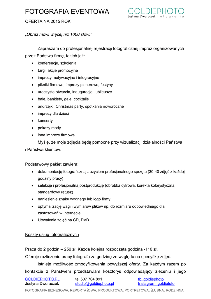 FOTOGRAFIA EVENTOWA OFERTA NA 2015 ROK „Obraz mówi więcej niż 1000 słów.” Zapraszam do profesjonalnej rejestracji fotograficznej imprez organizowanych przez Państwa firmę, takich jak: konferencje, szkolenia targi, akcje promocyjne imprezy motywacyjne i integracyjne pikniki firmowe, imprezy plenerowe, festyny uroczyste otwarcia, inauguracje, jubileusze bale, bankiety, gale, cocktaile andrzejki, Christmas party, spotkania noworoczne imprezy dla dzieci koncerty pokazy mody inne imprezy firmowe. Myślę, że moje zdjęcia będą pomocne przy wizualizacji działalności Państwa i Państwa klientów. Podstawowy pakiet zawiera: dokumentację fotograficzną z użyciem profesjonalnego sprzętu (30-40 zdjęć z każdej godziny pracy) selekcję i profesjonalną postprodukcję (obróbka cyfrowa, korekta kolorystyczna, standardowy retusz) naniesienie znaku wodnego lub logo firmy optymalizację wagi i wymiarów plików np. do rozmiaru odpowiedniego dla zastosowań w Internecie Utrwalenie zdjęć na CD, DVD. Koszty usług fotograficznych Praca do 2 godzin – 250 zł. Każda kolejna rozpoczęta godzina -110 zł. Oferuję rozliczenie pracy fotografa za godzinę ze względu na specyfikę zdjęć. Istnieje możliwość zmodyfikowania powyższej oferty. Za każdym razem po kontakcie z Państwem przedstawiam kosztorys odpowiadający zleceniu i jego GOLDIEPHOTO.PL Justyna Dworaczek tel.607 704 891 [email protected] fb: goldiephoto Instagram: goldiefoto FOTOGRAFIA BIZNESOWA, REPORTA ŻOWA, PRODUKTOWA, PORTRETOWA, ŚLUBNA, RODZINNA FOTOGRAFIA EVENTOWA OFERTA NA 2015 ROK specyfice. Przy większych zleceniach oferuję atrakcyjne zniżki. W przypadku usług niestandardowych dodatkowe koszty takie jak noclegi, diety i inne pokrywa Zleceniodawca, a ceny każdorazowo kalkulowane są indywidualnie. Usługa zawiera dojazd do Państwa lub Państwa klienta (do 30km od Gliwic, powyżej – 1 zł za każdy kilometr plus powrót, przy dłuższych trasach cena dojazdu podlega negocjacji). Przedstawione ceny to ceny netto, na życzenie wystawiam faktury VAT. Serdecznie zapraszam do współpracy, Justyna Dworaczek tel. +48 607 704 891 e-mail: [email protected] www.goldiephoto.pl Odwołanie zlecenia z winy Zleceniodawcy na mniej niż 24 godz. przed planowanym rozpoczęciem pracy wymaga wypłacenia autorowi 25% ustalonego honorarium. Oryginały zdjęć pozostają własnością autora (Ustawa o prawie autorskim i prawach pokrewnych) chyba, że strony w pisemnej umowie ustalą inaczej. GOLDIEPHOTO.PL Justyna Dworaczek tel.607 704 891 [email protected] fb: goldiephoto Instagram: goldiefoto FOTOGRAFIA BIZNESOWA, REPORTA ŻOWA, PRODUKTOWA, PORTRETOWA, ŚLUBNA, RODZINNA