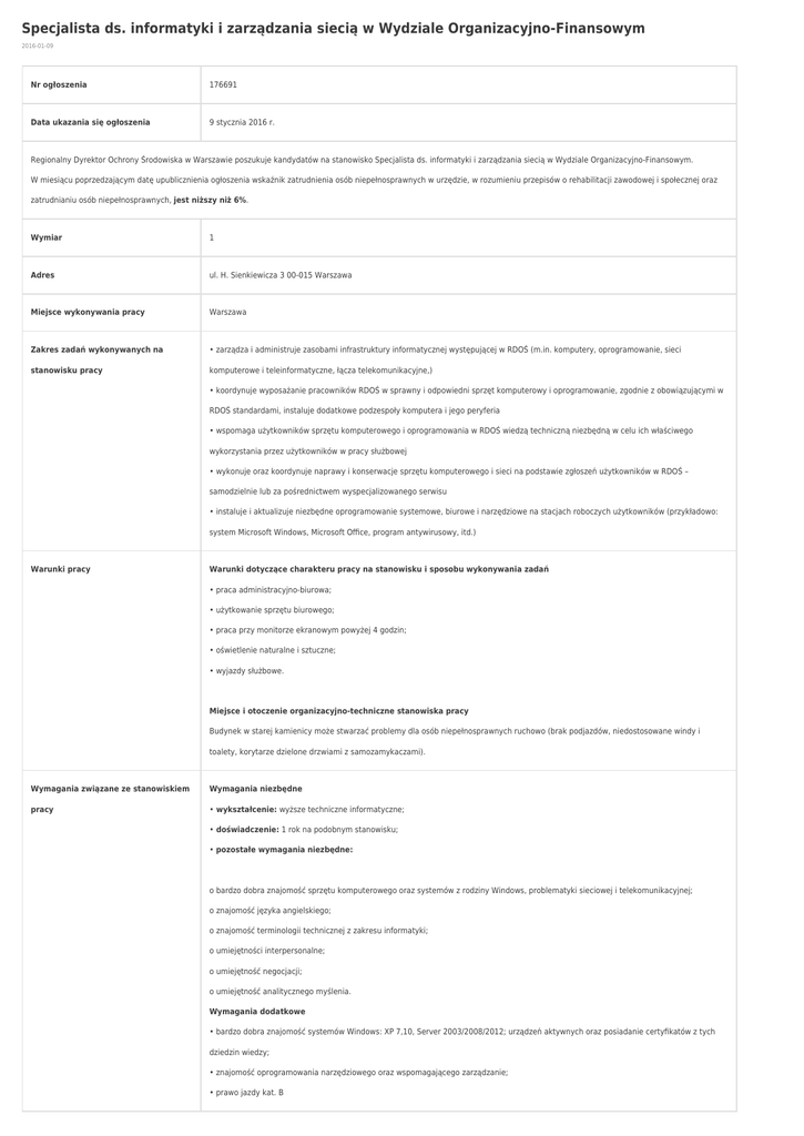 Specjalista ds. informatyki i zarządzania siecią w Wydziale Organizacyjno-Finansowym 2016-01-09 Nr ogłoszenia 176691 Data ukazania się ogłoszenia 9 stycznia 2016 r. Regionalny Dyrektor Ochrony Środowiska w Warszawie poszukuje kandydatów na stanowisko Specjalista ds. informatyki i zarządzania siecią w Wydziale Organizacyjno-Finansowym. W miesiącu poprzedzającym datę upublicznienia ogłoszenia wskaźnik zatrudnienia osób niepełnosprawnych w urzędzie, w rozumieniu przepisów o rehabilitacji zawodowej i społecznej oraz zatrudnianiu osób niepełnosprawnych, jest niższy niż 6%. Wymiar 1 Adres ul. H. Sienkiewicza 3 00-015 Warszawa Miejsce wykonywania pracy Warszawa Zakres zadań wykonywanych na • zarządza i administruje zasobami infrastruktury informatycznej występującej w RDOŚ (m.in. komputery, oprogramowanie, sieci stanowisku pracy komputerowe i teleinformatyczne, łącza telekomunikacyjne,) • koordynuje wyposażanie pracowników RDOŚ w sprawny i odpowiedni sprzęt komputerowy i oprogramowanie, zgodnie z obowiązującymi w RDOŚ standardami, instaluje dodatkowe podzespoły komputera i jego peryferia • wspomaga użytkowników sprzętu komputerowego i oprogramowania w RDOŚ wiedzą techniczną niezbędną w celu ich właściwego wykorzystania przez użytkowników w pracy służbowej • wykonuje oraz koordynuje naprawy i konserwacje sprzętu komputerowego i sieci na podstawie zgłoszeń użytkowników w RDOŚ – samodzielnie lub za pośrednictwem wyspecjalizowanego serwisu • instaluje i aktualizuje niezbędne oprogramowanie systemowe, biurowe i narzędziowe na stacjach roboczych użytkowników (przykładowo: system Microsoft Windows, Microsoft Office, program antywirusowy, itd.) Warunki pracy Warunki dotyczące charakteru pracy na stanowisku i sposobu wykonywania zadań • praca administracyjno-biurowa; • użytkowanie sprzętu biurowego; • praca przy monitorze ekranowym powyżej 4 godzin; • oświetlenie naturalne i sztuczne; • wyjazdy służbowe. Miejsce i otoczenie organizacyjno-techniczne stanowiska pracy Budynek w starej kamienicy może stwarzać problemy dla osób niepełnosprawnych ruchowo (brak podjazdów, niedostosowane windy i toalety, korytarze dzielone drzwiami z samozamykaczami). Wymagania związane ze stanowiskiem Wymagania niezbędne pracy • wykształcenie: wyższe techniczne informatyczne; • doświadczenie: 1 rok na podobnym stanowisku; • pozostałe wymagania niezbędne: o bardzo dobra znajomość sprzętu komputerowego oraz systemów z rodziny Windows, problematyki sieciowej i telekomunikacyjnej; o znajomość języka angielskiego; o znajomość terminologii technicznej z zakresu informatyki; o umiejętności interpersonalne; o umiejętność negocjacji; o umiejętność analitycznego myślenia. Wymagania dodatkowe • bardzo dobra znajomość systemów Windows: XP 7,10, Server 2003/2008/2012; urządzeń aktywnych oraz posiadanie certyfikatów z tych dziedzin wiedzy; • znajomość oprogramowania narzędziowego oraz wspomagającego zarządzanie; • prawo jazdy kat. B Wymagane dokumenty i oświadczenia • życiorys i list motywacyjny; • oświadczenie kandydata o wyrażeniu zgody na przetwarzanie danych osobowych do celów rekrutacji; • oświadczenie kandydata o korzystaniu z pełni praw publicznych; • oświadczenie kandydata o nieskazaniu prawomocnym wyrokiem za umyślne przestępstwo lub umyślne przestępstwo skarbowe; • kopie dokumentów potwierdzających wykształcenie; • kopia dokumentu potwierdzającego posiadanie polskiego obywatelstwa lub oświadczenie o posiadaniu obywatelstwa polskiego; • kopie dokumentów potwierdzających doświadczenie zawodowe; • kopie innych dokumentów potwierdzających dodatkowe kwalifikacje lub umiejętności. Inne dokumenty i oświadczenia • kopia dokumentu potwierdzającego niepełnosprawność - w przypadku kandydatów, którzy zamierzają skorzystać z pierwszeństwa w zatrudnieniu w przypadku, gdy znajdą się w gronie najlepszych kandydatów. Termin składania dokumentów 19 stycznia 2016 r. Miejsce składania dokumentów Regionalna Dyrekcja Ochrony Środowiska w Warszawie H. Sienkiewicza 3 00-015 Warszawa (z dopiskiem na kopercie: numer ogłoszenia). Inne informacje • proponowane wynagrodzenie miesięczne brutto na stanowisku 3.500 zł. brutto.; • dokumenty należy składać lub przesyłać w zamkniętej kopercie z dopiskiem numer ogłoszenia i nazwa stanowiska; • oferty złożone po terminie oraz oferty rozpatrzone negatywnie zostaną komisyjne zniszczone (za termin złożenia dokumentów uznaje się datę stempla pocztowego – placówki krajowej lub termin złożenia do kancelarii RDOŚ); • wszystkie oświadczenia muszą być opatrzone datą i własnoręcznym podpisem; • do dokumentów sporządzonych w języku obcym należy dołączyć tłumaczenie tych dokumentów, sporządzone lub poświadczone przez tłumacza przysięgłego; • informacja o wyniku naboru zostanie umieszczona na stronie Urzędu w zakładce „Praca”; • kandydaci zakwalifikowani do dalszych etapów rekrutacji zostaną powiadomieni telefonicznie; • dodatkowe informacje można uzyskać pod numerem telefonu (22) 556-56-15. UWAGA Do składania dokumentów zachęcamy również osoby niepełnosprawne, spełniające wymagania określone w niniejszym ogłoszeniu. Autorzy Wprowadził: Zmodyfikował: Agata Badowska Agata Badowska Data wprowadzenia: Data ostatniej modyfikacji: 2016-01-08 14:50:28 2016-01-08 14:54:50 Ilość odsłon artykułu: 360