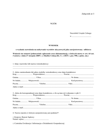 Załącznik nr 3 WZÓR Naczelnik Urzędu Celnego w ....................................... WNIOSEK o wydanie zezwolenia na nabywanie wyrobów akcyzowych jako zarejestrowany odbiorca Wniosek ten stanowi jednocześnie zgłoszenie oraz dokumentację, o których mowa w art. 64 ust. 3 ustawy z dnia 27 sierpnia 2009 r. o Służbie Celnej (Dz. U. z 2015 r. poz. 990, z późn. zm.) 1. Imię i nazwisko lub nazwa wnioskodawcy: .................................................................................................................................................................... ................................................................................................................................................................... 2. Adres zamieszkania lub adres siedziby wnioskodawcy oraz dane kontaktowe: Kraj................................. Województwo..................................... Powiat.................................................. Gmina.................................... Ulica............................................................. Nr domu............................... Nr lokalu............... Miejscowość............................................................... Kod pocztowy...................... Poczta.......................................... .Telefon............................................. Faks............................................ Adres e-mail.............................................................................................................................................. 3. Adres do korespondencji oraz dane kontaktowe, o ile są inne niż wskazane w pkt 2: Kraj................................. Województwo..................................... Powiat.................................................. Gmina.................................... Ulica............................................................. Nr domu............................... Nr lokalu............... Miejscowość............................................................... Kod pocztowy...................... Poczta.......................................... .Telefon............................................. Faks............................................ Adres e-mail............................................................................................................................................. 4. Nazwa rejestru w którym zarejestrowany jest podmiot*: □ Krajowy Rejestr Sądowy Numer wpisu................................................... □ Centralna Ewidencja i Informacja o Działalności Gospodarczej 5. Formy identyfikacji wnioskodawcy: □ Numer Identyfikacji Podatkowej NIP............................................. □ Numer identyfikacyjny REGON .................................................... 6. Adres planowanej lokalizacji miejsca odbioru wyrobów akcyzowych: Kraj................................. Województwo..................................... Powiat.................................................. Gmina.................................... Ulica............................................................. Nr domu............................... Nr lokalu............... Miejscowość........................................................... Kod pocztowy......................... Poczta.......................................................................................................................................................... 7. Rodzaje wyrobów akcyzowych, które będą nabywane wewnątrzwspólnotowo*: L.p. Szacunkowe dane dotyczące ilości wyrobów akcyzowych będących przedmiotem nabycia wewnątrzwspólnotowego w okresie jednego miesiąca* Wyroby akcyzowe WYROBY ENERGETYCZNE: 1. Oleje roślinne i zwierzęce o kodach CN od 1507 do 1518, jeśli są przeznaczone do celów napędowych lub opałowych (art. 20 ust. 1 lit. a dyrektywy 2003/96/WE) Szacunkowa ilość 2. Oleje mineralne o kodach CN 2707 10, 2707 20, 2707 30 i 2707 50 (art. 20 ust. 1 lit. b dyrektywy 2003/96/WE) Szacunkowa ilość 3. Benzyna ołowiowa o kodach CN 2710 11 31, 2710 11 51 i 2710 11 59 (art. 20 ust. 1 lit. c; załącznik 1 tabela A rząd pierwszy dyrektywy 2003/96/WE) Szacunkowa ilość 4. Benzyna bezołowiowa o kodach CN 2710 11 31, 2710 11 41, 2710 11 45 i 2710 11 49 (art. 20 ust. 1 lit. c; załącznik 1 tabela A rząd drugi dyrektywy 2003/96/WE) Szacunkowa ilość 5. Olej napędowy o kodach CN od 2710 19 41 do 2710 19 49 (art. 20 ust. 1 lit. c; załącznik 1 tabela A rząd trzeci dyrektywy 2003/96/WE) Szacunkowa ilość 6. Olej opałowy o kodach CN od 2710 19 41 do 2710 19 49 (art. 20 ust. 1 lit. c; załącznik nr 1 tabela C rząd pierwszy dyrektywy 2003/96/WE) Szacunkowa ilość 7. Nafta do celów napędowych o kodach CN 2710 19 21 i 2710 19 25 (art. 20 ust. 1 lit. c; załącznik 1 tabela A rząd czwarty dyrektywy 2003/96/WE) Szacunkowa ilość 8. Nafta do celów opałowych o kodach CN 2710 19 21 i 2710 19 25 (art. 20 ust. 1 lit. c; załącznik 1 tabela C rząd trzeci dyrektywy 2003/96/WE) Szacunkowa ilość 9. Ciężki olej opałowy o kodach CN od 2710 19 61 do 2710 19 69 (art. 20 ust. 1 lit. c; załącznik 1 tabela C rząd drugi dyrektywy 2003/96/WE) Szacunkowa ilość 10. Wyroby o kodach CN 2710 11 21, 2710 11 25 i 2710 19 29, o ile wyroby te są przemieszczane luzem (art. 20 ust. 1 lit. c dyrektywy 2003/96/WE) Szacunkowa ilość 11. Wyroby o kodach CN od 2710 11 do 2710 19 69, wyżej niewymienione (art. 20 ust. 1 lit. c dyrektywy 2003/96/WE) Szacunkowa ilość 12. Gaz płynny i inne węglowodory gazowe (LPG) o kodzie CN 2711 z wyjątkiem 2711 11, 2711 21 i 2711 29 (art. 20 ust. 1 lit. d; załącznik 1 tabela A rząd piąty; załącznik 1 tabela C rząd czwarty dyrektywy 2003/96/WE) Szacunkowa ilość 13. Nasycone węglowodory acykliczne o kodzie CN 2901 10 (art. 20 ust. 1 lit. e dyrektywy 2003/96/WE) Szacunkowa ilość 14. Węglowodory cykliczne o kodach CN 2902 20, 2902 30, 2902 41, 2902 42, 2902 43 i 2902 44 (art. 20 ust. 1 li