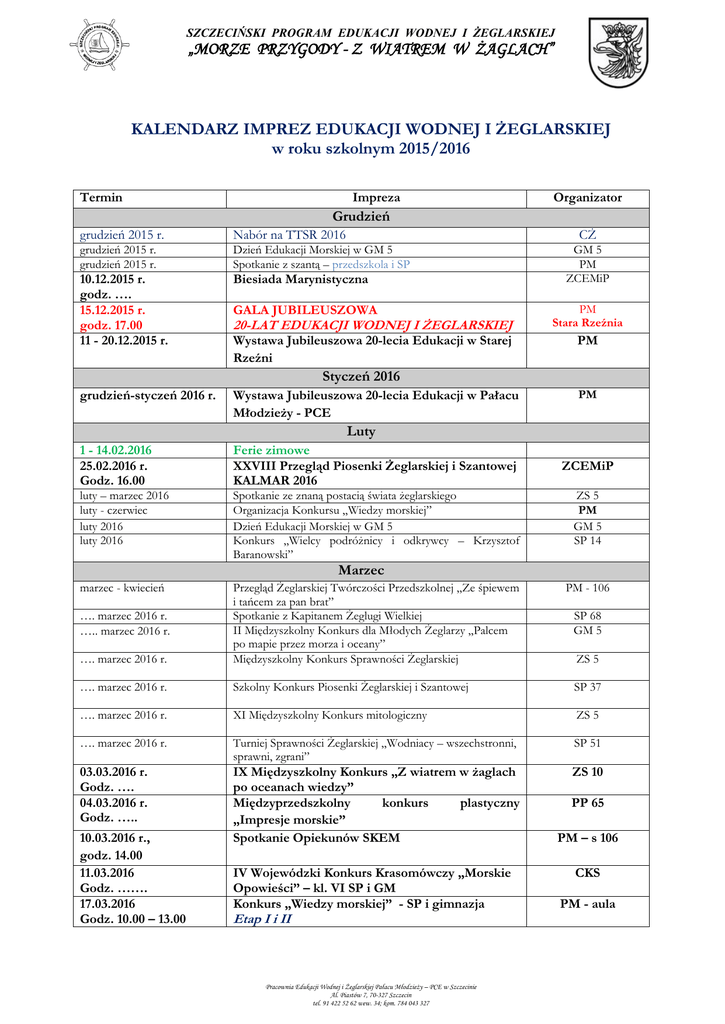 SZCZECIŃSKI PROGRAM EDUKACJI WODNEJ I ŻEGLARSKIEJ „MORZE PRZYGODY - Z WIATREM W ŻAGLACH” KALENDARZ IMPREZ EDUKACJI WODNEJ I ŻEGLARSKIEJ w roku szkolnym 2015/2016 Termin Impreza Organizator Grudzień grudzień 2015 r. Nabór na TTSR 2016 grudzień 2015 r. grudzień 2015 r. Dzień Edukacji Morskiej w GM 5 Spotkanie z szantą – przedszkola i SP CŻ 10.12.2015 r. godz. …. 15.12.2015 r. godz. 17.00 11 - 20.12.2015 r. Biesiada Marynistyczna GALA JUBILEUSZOWA 20-LAT EDUKACJI WODNEJ I ŻEGLARSKIEJ Wystawa Jubileuszowa 20-lecia Edukacji w Starej Rzeźni GM 5 PM ZCEMiP PM Stara Rzeźnia PM Styczeń 2016 grudzień-styczeń 2016 r. Wystawa Jubileuszowa 20-lecia Edukacji w Pałacu Młodzieży - PCE PM Luty 1 - 14.02.2016 25.02.2016 r. Godz. 16.00 Ferie zimowe XXVIII Przegląd Piosenki Żeglarskiej i Szantowej KALMAR 2016 luty – marzec 2016 luty - czerwiec luty 2016 luty 2016 Spotkanie ze znaną postacią świata żeglarskiego Organizacja Konkursu „Wiedzy morskiej” Dzień Edukacji Morskiej w GM 5 Konkurs „Wielcy podróżnicy i odkrywcy – Krzysztof Baranowski” marzec - kwiecień …. marzec 2016 r. Przegląd Żeglarskiej Twórczości Przedszkolnej „Ze śpiewem i tańcem za pan brat” Spotkanie z Kapitanem Żeglugi Wielkiej II Międzyszkolny Konkurs dla Młodych Żeglarzy „Palcem po mapie przez morza i oceany” Międzyszkolny Konkurs Sprawności Żeglarskiej …. marzec 2016 r. Szkolny Konkurs Piosenki Żeglarskiej i Szantowej SP 37 …. marzec 2016 r. XI Międzyszkolny Konkurs mitologiczny ZS 5 …. marzec 2016 r. Turniej Sprawności Żeglarskiej „Wodniacy – wszechstronni, sprawni, zgrani” SP 51 03.03.2016 r. Godz. …. 04.03.2016 r. Godz. ….. IX Międzyszkolny Konkurs „Z wiatrem w żaglach po oceanach wiedzy” Międzyprzedszkolny konkurs plastyczny „Impresje morskie” Spotkanie Opiekunów SKEM ZS 10 ZCEMiP ZS 5 PM GM 5 SP 14 Marzec …. marzec 2016 r. ….. marzec 2016 r. 10.03.2016 r., godz. 14.00 11.03.2016 Godz. ……. 17.03.2016 Godz. 10.00 – 13.00 IV Wojewódzki Konkurs Krasomówczy „Morskie Opowieści” – kl. VI SP i GM Konkurs „Wiedzy morskiej” - SP i gimnazja Etap I i II Pracownia Edukacji Wodnej i Żeglarskiej Pałacu Młodzieży – PCE w Szczecinie Al. Piastów 7, 70-327 Szczecin tel. 91 422 52 62 wew. 34; kom. 784 043 327 PM - 106 SP 68 GM 5 ZS 5 PP 65 PM – s 106 CKS PM - aula SZCZECIŃSKI PROGRAM EDUKACJI WODNEJ I ŻEGLARSKIEJ „MORZE PRZYGODY - Z WIATREM W ŻAGLACH” Kwiecień …. kwiecień 2016 r. II Międzyszkolny Konkurs plastyczny „Podwodny Świat” SP 42 …. kwiecień 2016 r. Konkurs wiedzy i umiejętności marynistycznych „Aleja Żeglarzy i Wały Chrobrego – nieznane okolice Szczecina Morskie oblicze kompleksu portowego Szczecin – Świnoujście ZSZS 16 …. kwiecień 2016 r. ..... 04.2016 r. godz. 10.00 7.04.2016 Godz. 10.00 14.04.2016 r. Godz. 13.00 14.04.2016 r. Godz. ….. 23.04.2016 r. Godz. ….. XVII Konkurs Piosenki Żeglarskiej i Szantowej „Zdroje 2016” Przegląd Żeglarskiej Twórczości Przedszkolnej „Ze śpiewem i tańcem za pan brat” Sesja Morska „Nasze rejsy 2015 – Baltic Regats i TTSR 2015” V Wyprawa dookoła świata – Ameryka Południowa Międzyprzedszkolny Quiz wiedzy o Szczecinie ZS 8 SP 65 i Gim 23 w ZS 1 PM - 106 PM - aula SP 23 PP 65 Maj …. maj 2016 r. IV Międzyszkolny Konkurs Informatyczny SP 42 …. maj 2016 r. Szkolny przegląd talentów „9ma talent” ZS 9 …. maj 2016 r. Miejski Konkurs plastyczny i fotograficzny „Morskie Impresje” Warsztaty marynistyczne „Historia zapisana w drewnie – renowacja wraku łodzi” ZS 9 …. maj 2016 r. ZSS 9 12.05.2016 r. Godz. 14.00 18.05.2016 r. Godz. 9.30 Spotkanie Opiekunów SKEM Przegląd tańca morskiego „Z wiatrem w żaglach” PP 27 27.05.2016 r. Godz. 11.00 IV Ogólnopolski Konkurs poezji i Fotografii Marynistycznej „Impresje Morskie 2016” Czerwiec SP 68 …. czerwiec 2016 r. Wyjazdowe warsztaty edukacyjne „Spotkanie z Maszoperią” SP 68 …. czerwiec 2016 r. Dni Morza, impreza organizowana w ramach obchodów Święta Szkoły Tydzień matematyczno-przyrodniczy SP 1 ZS 9 Rejs statkiem po porcie (Dzień Dziecka) – PP PM Konkursu „Wiedzy morskiej” w CŻ - Etap III - wręczenie nagród w konkursie Lipiec - sierpień Rejsy programowe – doprowadzające, TTSR 2016 PM/CŻ …. czerwiec 2016 r. 02.06.2016 r. w godz. 9.30 – 12.00 09.06.2016 r., godz. 11.30 Pracownia Edukacji Wodnej i Żeglarskiej Pałacu Młodzieży – PCE w Szczecinie Al. Piastów 7, 70-327 Szczecin tel. 91 422 52 62 wew. 34; kom. 784 043 327 PM – s. 106 PM
