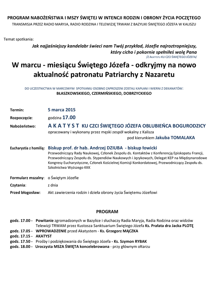 PROGRAM NABOŻEŃSTWA I MSZY ŚWIĘTEJ W INTENCJI RODZIN I OBRONY ŻYCIA POCZĘTEGO TRANSMISJA PRZEZ RADIO MARYJA, RADIO RODZINA I TELEWIZJĘ TRWAM Z BAZYLIKI ŚWIĘTEGO JÓZEFA W KALISZU Temat spotkania: Jak najjaśniejszy kandelabr świeci nam Twój przykład, Józefie najroztropniejszy, który cicho i pokornie spełniłeś wolę Pana /Z AKATYSTU KU CZCI ŚWIĘTEGO JÓZEFA/ W marcu - miesiącu Świętego Józefa - odkryjmy na nowo aktualność patronatu Patriarchy z Nazaretu DO UCZESTNICTWA W MARCOWYM SPOTKANIU OSOBNO ZAPROSZENI ZOSTALI KAPŁANI I WIERNI Z DEKANATÓW: BŁASZKOWSKIEGO, CZERMIŃSKIEGO, DOBRZYCKIEGO Termin: 5 marca 2015 Rozpoczęcie: godzina 17.00 Nabożeństwo: A K A T Y S T KU CZCI ŚWIĘTEGO JÓZEFA OBLUBIEŃCA BOGURODZICY opracowany i wykonany przez męski zespół wokalny z Kalisza pod kierunkiem Jakuba TOMALAKA Eucharystia z homilią: Biskup prof. dr hab. Andrzej DZIUBA - biskup łowicki Przewodniczący Rady Naukowej, Członek Zespołu ds. Kontaktów z Konferencją Episkopatu Francji, Przewodniczący Zespołu ds. Stypendiów Naukowych i Językowych, Delegat KEP na Międzynarodowe Kongresy Eucharystyczne, Członek Kościelnej Komisji Konkordatowej, Przewodniczący Zespołu ds. Szkolnictwa Wyższego KKK Formularz mszalny: o Świętym Józefie Czytania: z dnia Przed błogosław: Akt zawierzenia rodzin i dzieła obrony życia Świętemu Józefowi PROGRAM godz. 17.00 - Powitanie zgromadzonych w Bazylice i słuchaczy Radia Maryja, Radia Rodzina oraz widzów Telewizji TRWAM przez Kustosza Sanktuarium Świętego Józefa Ks. Prałata dra Jacka PLOTĘ godz. 17.05 - WPROWADZENIE przed Akatystem - Ks. Grzegorz MĄCZKA godz. 17.15 - AKATYST godz. 17.50 - Prośby i podziękowania do Świętego Józefa - Ks. Szymon RYBAK godz. 18.00 - Uroczysta MSZA ŚWIĘTA koncelebrowana - przy głównym ołtarzu