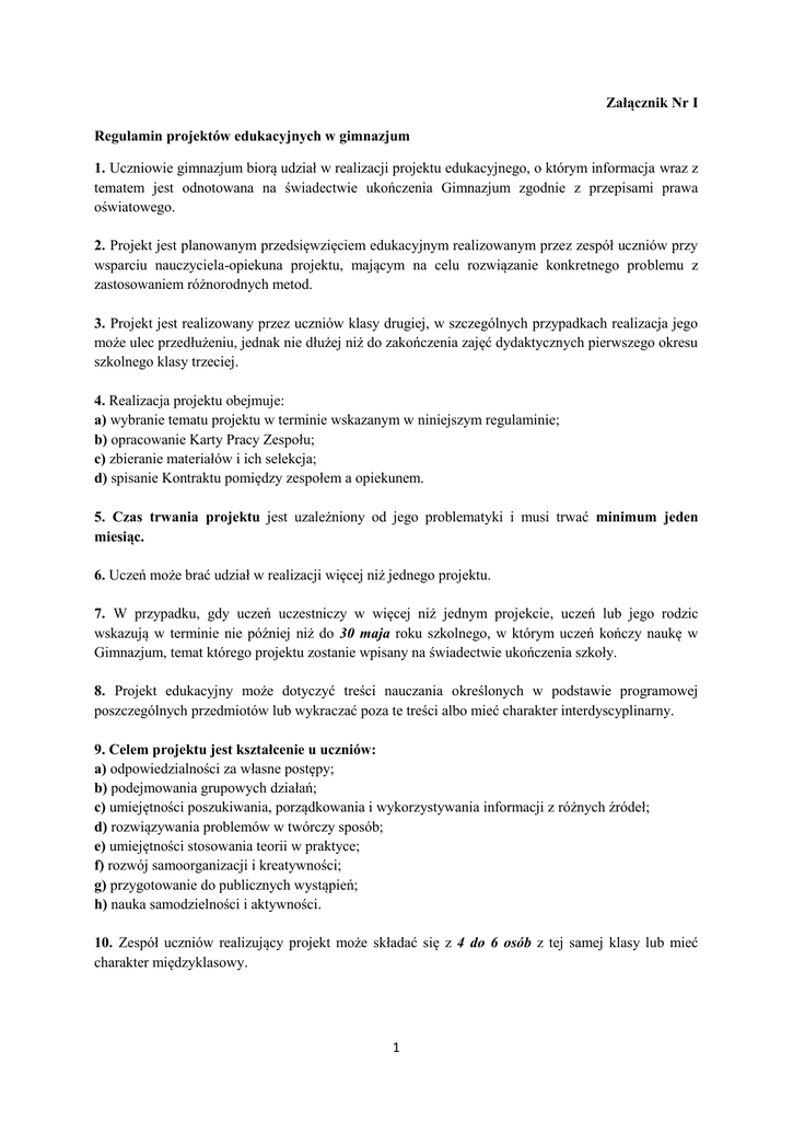 Załącznik Nr I Regulamin projektów edukacyjnych w gimnazjum 1. Uczniowie gimnazjum biorą udział w realizacji projektu edukacyjnego, o którym informacja wraz z tematem jest odnotowana na świadectwie ukończenia Gimnazjum zgodnie z przepisami prawa oświatowego. 2. Projekt jest planowanym przedsięwzięciem edukacyjnym realizowanym przez zespół uczniów przy wsparciu nauczyciela-opiekuna projektu, mającym na celu rozwiązanie konkretnego problemu z zastosowaniem różnorodnych metod. 3. Projekt jest realizowany przez uczniów klasy drugiej, w szczególnych przypadkach realizacja jego może ulec przedłużeniu, jednak nie dłużej niż do zakończenia zajęć dydaktycznych pierwszego okresu szkolnego klasy trzeciej. 4. Realizacja projektu obejmuje: a) wybranie tematu projektu w terminie wskazanym w niniejszym regulaminie; b) opracowanie Karty Pracy Zespołu; c) zbieranie materiałów i ich selekcja; d) spisanie Kontraktu pomiędzy zespołem a opiekunem. 5. Czas trwania projektu jest uzależniony od jego problematyki i musi trwać minimum jeden miesiąc. 6. Uczeń może brać udział w realizacji więcej niż jednego projektu. 7. W przypadku, gdy uczeń uczestniczy w więcej niż jednym projekcie, uczeń lub jego rodzic wskazują w terminie nie później niż do 30 maja roku szkolnego, w którym uczeń kończy naukę w Gimnazjum, temat którego projektu zostanie wpisany na świadectwie ukończenia szkoły. 8. Projekt edukacyjny może dotyczyć treści nauczania określonych w podstawie programowej poszczególnych przedmiotów lub wykraczać poza te treści albo mieć charakter interdyscyplinarny. 9. Celem projektu jest kształcenie u uczniów: a) odpowiedzialności za własne postępy; b) podejmowania grupowych działań; c) umiejętności poszukiwania, porządkowania i wykorzystywania informacji z różnych źródeł; d) rozwiązywania problemów w twórczy sposób; e) umiejętności stosowania teorii w praktyce; f) rozwój samoorganizacji i kreatywności; g) przygotowanie do publicznych wystąpień; h) nauka samodzielności i aktywności. 10. Zespół uczniów realizujący projekt może składać się z 4 do 6 osób z tej samej klasy lub mieć charakter międzyklasowy. 1 11. O czasie trwania projektu decyduje opiekun projektu w uzgodnieniu z uczniami realizującymi projekt. 12. Koordynatorem projektów edukacyjnych jest nauczyciel powołany przez dyrektora Gimnazjum, którego zadaniem jest: a) zebranie od przewodniczących zespołów przedmiotowych propozycji tematów projektu, sporządzenie ich listy zbiorczej i przedstawienie jej dyrektorowi i radzie pedagogicznej oraz upowszechnienie jej na stronie internetowej szkoły; b) monitorowanie stanu realizacji projektów; c) upowszechnienie informacji na temat realizowanych projektów; d) organizację publicznej prezentacji projektów; e) podsumowanie realizacji projektów i przedstawienie radzie pedagogicznej sprawozdania zbiorczego na koniec roku szkolnego. 13. Opiekun projektu edukacyjnego odpowiada w szczególności za: a) wskazanie tematyki realizowanych projektów z uwzględnieniem zainteresowań uczniów i treści podstawy programowej; b) omówienie z uczniami zakresu tematycznego oraz celów projektu i koordynowanie podziału uczniów na poszczególne zespoły projektowe; c) komunikację z wychowawcą ucznia na temat jego udziału w projekcie; d) sporządzenie karty projektu i innych dokumentów /kontrakt dla uczniów, arkusz oceny projektu, narzędzia do ewaluacji, kryteria oceny projektu oraz instrukcja realizacji projektu/ o ile taka potrzeba zachodzi; e) prowadzenie konsultacji dla uczniów realizujących projekt; f) monitorowanie projektu i jego realizacji; g) ocenę projektu we współpracy z nauczycielami, którzy wspomagali jego realizację; h) złożenie koordynatorowi sprawozdania z projektów w ustalonym terminie; wzór sprawozdania jest załącznikiem nr 1 do Regulaminu. 14. Zadania wychowawcy klasy związane z realizacją projektu: a) poinformowanie uczniów i ich rodziców /prawnych opiekunów/ o warunkach i zasadach realizacji projektu edukacyjnego oraz zapoznanie z niniejszym Regulaminem w terminie nie później niż do 30 września; b) prowadzenie działań organizacyjnych, związanych z realizacją projektu przez wszystkich uczniów klasy, dotyczących w szczególności: - wyboru tematu i grupy projektowej dla każdego ucznia klasy, - monitorowania udziału uczniów w pracach zespołu poprzez kontakt z opiekunem projektu, - przekazywania informacji o wynikach monitorowania rodzicom; c) komunikowanie się z opiekunami projektów w sprawie oceniania zachowania. 15. Nauczyciele w terminie do końca października każdego roku szkolnego zgłaszają za pomocą poczty elektronicznej do szkolnego koordynatora projektów tematy projektów edukacyjnych. 16. Zgłoszenie tematu projektu dokonywane jest na Karcie Projektu wg wzoru, który jest załącznikiem nr 2 do Regulaminu. Tematyka może uwzględniać również propozycje złożone przez uczniów. 2 17. W terminie do 15 listopada dyrektor szkoły zatwierdza projekty edukacyjne do realizacji w danym roku szkolnym, tworząc (przy współudziale koordynatora) szkolną bazę projektów szkolnych. 18. Informacje o dopuszczonych do realizacji projektach umieszcza się na stronie internetowej Gimnazjum i w bibliotece szkolnej. 19. Wyboru określonego tematu dokonują uczniowie do 30 listopada, składając wspólną pisemną deklarację opiekunowi projektu ze wskazaniem wszystkich członków zespołu realizującego projekt. Wzór deklaracji jest załącznikiem nr 3 do Regulaminu. 20. Ten sam temat projektu może być wybrany za zgodą opiekuna projektu przez kilka zespołów. 21. Skład zespołu ustala opiekun projektu w porozumieniu z wychowawcą klasy, uwzględniając możliwości i zainteresowania uczniów. 22. Nauczyciel - opiekun wraz z zespołem uczniowskim opracowuje kartę pracy zespołu wg wzoru – załącznik nr 4 do Regulaminu w terminie do końca kwietnia roku