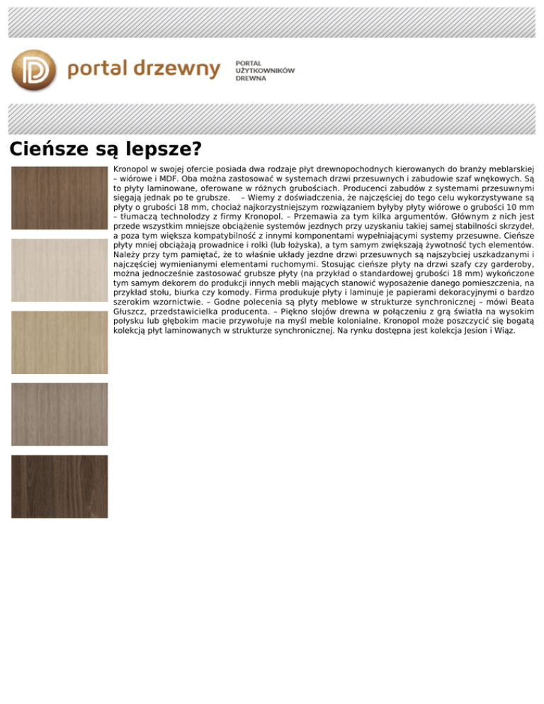 Cieńsze są lepsze? Kronopol w swojej ofercie posiada dwa rodzaje płyt drewnopochodnych kierowanych do branży meblarskiej – wiórowe i MDF. Oba można zastosować w systemach drzwi przesuwnych i zabudowie szaf wnękowych. Są to płyty laminowane, oferowane w różnych grubościach. Producenci zabudów z systemami przesuwnymi sięgają jednak po te grubsze. – Wiemy z doświadczenia, że najczęściej do tego celu wykorzystywane są płyty o grubości 18 mm, chociaż najkorzystniejszym rozwiązaniem byłyby płyty wiórowe o grubości 10 mm – tłumaczą technolodzy z firmy Kronopol. – Przemawia za tym kilka argumentów. Głównym z nich jest przede wszystkim mniejsze obciążenie systemów jezdnych przy uzyskaniu takiej samej stabilności skrzydeł, a poza tym większa kompatybilność z innymi komponentami wypełniającymi systemy przesuwne. Cieńsze płyty mniej obciążają prowadnice i rolki (lub łożyska), a tym samym zwiększają żywotność tych elementów. Należy przy tym pamiętać, że to właśnie układy jezdne drzwi przesuwnych są najszybciej uszkadzanymi i najczęściej wymienianymi elementami ruchomymi. Stosując cieńsze płyty na drzwi szafy czy garderoby, można jednocześnie zastosować grubsze płyty (na przykład o standardowej grubości 18 mm) wykończone tym samym dekorem do produkcji innych mebli mających stanowić wyposażenie danego pomieszczenia, na przykład stołu, biurka czy komody. Firma produkuje płyty i laminuje je papierami dekoracyjnymi o bardzo szerokim wzornictwie. – Godne polecenia są płyty meblowe w strukturze synchronicznej – mówi Beata Głuszcz, przedstawicielka producenta. – Piękno słojów drewna w połączeniu z grą światła na wysokim połysku lub głębokim macie przywołuje na myśl meble kolonialne. Kronopol może poszczycić się bogatą kolekcją płyt laminowanych w strukturze synchronicznej. Na rynku dostępna jest kolekcja Jesion i Wiąz.