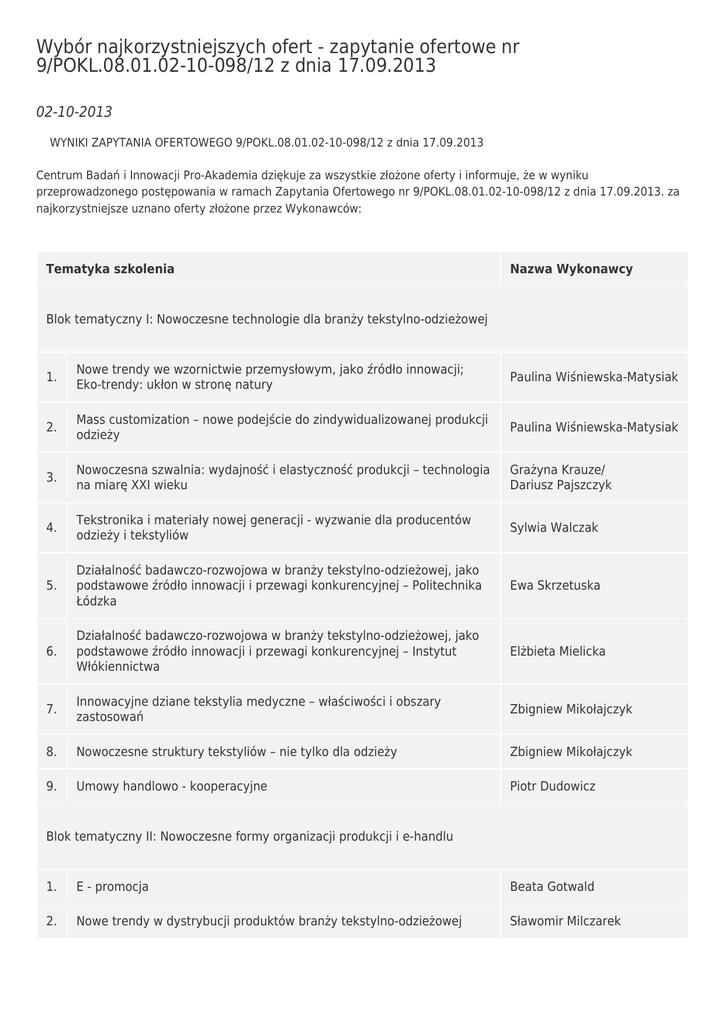 Wybór najkorzystniejszych ofert - zapytanie ofertowe nr 9/POKL.08.01.02-10-098/12 z dnia 17.09.2013 02-10-2013 WYNIKI ZAPYTANIA OFERTOWEGO 9/POKL.08.01.02-10-098/12 z dnia 17.09.2013 Centrum Badań i Innowacji Pro-Akademia dziękuje za wszystkie złożone oferty i informuje, że w wyniku przeprowadzonego postępowania w ramach Zapytania Ofertowego nr 9/POKL.08.01.02-10-098/12 z dnia 17.09.2013. za najkorzystniejsze uznano oferty złożone przez Wykonawców: Tematyka szkolenia Nazwa Wykonawcy Blok tematyczny I: Nowoczesne technologie dla branży tekstylno-odzieżowej 1. Nowe trendy we wzornictwie przemysłowym, jako źródło innowacji; Eko-trendy: ukłon w stronę natury Paulina Wiśniewska-Matysiak 2. Mass customization – nowe podejście do zindywidualizowanej produkcji odzieży Paulina Wiśniewska-Matysiak 3. Nowoczesna szwalnia: wydajność i elastyczność produkcji – technologia na miarę XXI wieku Grażyna Krauze/ Dariusz Pajszczyk 4. Tekstronika i materiały nowej generacji - wyzwanie dla producentów odzieży i tekstyliów Sylwia Walczak 5. Działalność badawczo-rozwojowa w branży tekstylno-odzieżowej, jako podstawowe źródło innowacji i przewagi konkurencyjnej – Politechnika Łódzka Ewa Skrzetuska 6. Działalność badawczo-rozwojowa w branży tekstylno-odzieżowej, jako podstawowe źródło innowacji i przewagi konkurencyjnej – Instytut Włókiennictwa Elżbieta Mielicka 7. Innowacyjne dziane tekstylia medyczne – właściwości i obszary zastosowań Zbigniew Mikołajczyk 8. Nowoczesne struktury tekstyliów – nie tylko dla odzieży Zbigniew Mikołajczyk 9. Umowy handlowo - kooperacyjne Piotr Dudowicz Blok tematyczny II: Nowoczesne formy organizacji produkcji i e-handlu 1. E - promocja Beata Gotwald 2. Nowe trendy w dystrybucji produktów branży tekstylno-odzieżowej Sławomir Milczarek 3. Formy i analiza opłacalności handlu internetowego Rafał Hanzl 4. Franchising – sposób na aktywizację sprzedaży Sławomir Milczarek Blok tematyczny III: Finansowanie zmian profilu działalności przedsiębiorstwa 1. Jak zamienić koszty w zyski? Zagospodarowanie odpadów i ścieków poprodukcyjnych Katarzyna Dziedziczak Uzasadnienie wyboru: Oferty Wykonawców uzyskały najwyższą liczbę punktów, obliczonych zgodnie z kryteriami umieszczonymi w Zapytaniu Ofertowym oraz spełniły wszystkie warunki określone w Zapytaniu Ofertowym. Pani Grażyna Krauze oraz Pan Dariusz Pajszczyk z powodu uzyskania tej samej ilości punktów zostali wezwani do negocjacji cenowych. Strona CBI Pro-Akademia używa ciasteczek (cookies), dzięki którym nasz serwis może działać lepiej. Zobacz