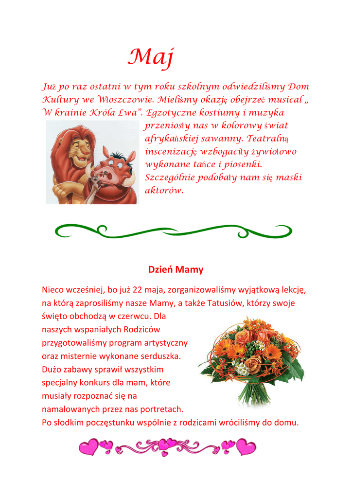 Maj Już po raz ostatni w tym roku szkolnym odwiedziliśmy Dom Kultury we Włoszczowie. Mieliśmy okazję obejrzeć musical „ W krainie Króla Lwa”. Egzotyczne kostiumy i muzyka przeniosły nas w kolorowy świat afrykańskiej sawanny. Teatralną inscenizację wzbogaciły żywiołowo wykonane tańce i piosenki. Szczególnie podobały nam się maski aktorów. Dzień Mamy Nieco wcześniej, bo już 22 maja, zorganizowaliśmy wyjątkową lekcję, na którą zaprosiliśmy nasze Mamy, a także Tatusiów, którzy swoje święto obchodzą w czerwcu. Dla naszych wspaniałych Rodziców przygotowaliśmy program artystyczny oraz misternie wykonane serduszka. Dużo zabawy sprawił wszystkim specjalny konkurs dla mam, które musiały rozpoznać się na namalowanych przez nas portretach. Po słodkim poczęstunku wspólnie z rodzicami wróciliśmy do domu. Wycieczka do JuraParku 27 maja spotkało nas niesamowite, mrożące krew w żyłach przeżycie – stanęliśmy oko w oko z ogromnymi dinozaurami! Nie musieliśmy nawet cofać się do czasów prehistorycznych. Tę ekscytującą atrakcję zapewnił nam JuraPark w Krasiejowie. Mogliśmy tam nie tylko spacerować pośród przerażających bestii, ale także odwiedzić Multimedialny Tunel Czasu oraz prehistoryczne oceanarium. Dinozaury okazały się być odrobinę leniwe – wciąż tkwiły nieruchomo w jednym miejscu i nie reagowały na nasze zaczepki. Musiały być już najedzone.
