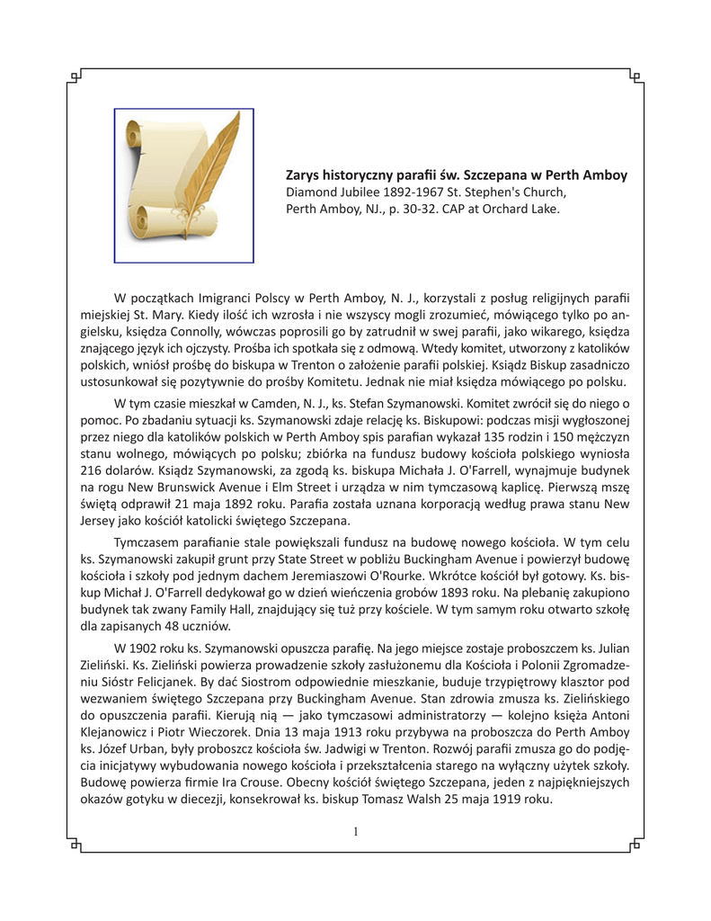 Zarys historyczny parafii św. Szczepana w Perth Amboy Diamond Jubilee 1892-1967 St. Stephen's Church, Perth Amboy, NJ., p. 30-32. CAP at Orchard Lake. W początkach Imigranci Polscy w Perth Amboy, N. J., korzystali z posług religijnych parafii miejskiej St. Mary. Kiedy ilość ich wzrosła i nie wszyscy mogli zrozumieć, mówiącego tylko po angielsku, księdza Connolly, wówczas poprosili go by zatrudnił w swej parafii, jako wikarego, księdza znającego język ich ojczysty. Prośba ich spotkała się z odmową. Wtedy komitet, utworzony z katolików polskich, wniósł prośbę do biskupa w Trenton o założenie parafii polskiej. Ksiądz Biskup zasadniczo ustosunkował się pozytywnie do prośby Komitetu. Jednak nie miał księdza mówiącego po polsku. W tym czasie mieszkał w Camden, N. J., ks. Stefan Szymanowski. Komitet zwrócił się do niego o pomoc. Po zbadaniu sytuacji ks. Szymanowski zdaje relację ks. Biskupowi: podczas misji wygłoszonej przez niego dla katolików polskich w Perth Amboy spis parafian wykazał 135 rodzin i 150 mężczyzn stanu wolnego, mówiących po polsku; zbiórka na fundusz budowy kościoła polskiego wyniosła 216 dolarów. Ksiądz Szymanowski, za zgodą ks. biskupa Michała J. O'Farrell, wynajmuje budynek na rogu New Brunswick Avenue i Elm Street i urządza w nim tymczasową kaplicę. Pierwszą mszę świętą odprawił 21 maja 1892 roku. Parafia została uznana korporacją według prawa stanu New Jersey jako kościół katolicki świętego Szczepana. Tymczasem parafianie stale powiększali fundusz na budowę nowego kościoła. W tym celu ks. Szymanowski zakupił grunt przy State Street w pobliżu Buckingham Avenue i powierzył budowę kościoła i szkoły pod jednym dachem Jeremiaszowi O'Rourke. Wkrótce kościół był gotowy. Ks. biskup Michał J. O'Farrell dedykował go w dzień wieńczenia grobów 1893 roku. Na plebanię zakupiono budynek tak zwany Family Hall, znajdujący się tuż przy kościele. W tym samym roku otwarto szkołę dla zapisanych 48 uczniów. W 1902 roku ks. Szymanowski opuszcza parafię. Na jego miejsce zostaje proboszczem ks. Julian Zieliński. Ks. Zieliński powierza prowadzenie szkoły zasłużonemu dla Kościoła i Polonii Zgromadzeniu Sióstr Felicjanek. By dać Siostrom odpowiednie mieszkanie, buduje trzypiętrowy klasztor pod wezwaniem świętego Szczepana przy Buckingham Avenue. Stan zdrowia zmusza ks. Zielińskiego do opuszczenia parafii. Kierują nią — jako tymczasowi administratorzy — kolejno księża Antoni Klejanowicz i Piotr Wieczorek. Dnia 13 maja 1913 roku przybywa na proboszcza do Perth Amboy ks. Józef Urban, były proboszcz kościoła św. Jadwigi w Trenton. Rozwój parafii zmusza go do podjęcia inicjatywy wybudowania nowego kościoła i przekształcenia starego na wyłączny użytek szkoły. Budowę powierza firmie Ira Crouse. Obecny kościół świętego Szczepana, jeden z najpiękniejszych okazów gotyku w diecezji, konsekrował ks. biskup Tomasz Walsh 25 maja 1919 roku. 1 Mając ukończony kościół, ks. Urban przystępuje do budowy nowej szkoły. Stara szkoła została przesunięta na tył posiadłością a na jej miejscu stanął nowy gmach szkolny, poświęcony przez ks. biskupa Tomasza Walsh 4 września 1922 roku. Teraz — już wszystko Parafia św. Szczepana miała w najlepszym stanie i porządku, a zasłużony jej budowniczy mógł zająć się działalnością wewnętrzną. Zajmował się więc pilnie ks. J. Urban i szczególnie serdecznie młodzieżą, dbał o jej oświatę i wykształcenie, popierał powołania kapłańskie i zakonne, założył w Perth Amboy w 1919 gazetę tygodniową, „Polak Amerykański." W uznaniu wielkich i mnogich zasług został ks. Józef Urban wyniesiony do godności Prałata Domowego Ojca Św. Inwestytura prałacka odbyła się, I września, 1930 r., z której to okazji był Ks. Prałat Urban przedmiotem gratulacji nadesłanych z całego kraju, jakie urządziła mu uradowana i zaszczycona tern samem Parafia i Polonia w Perth Amboy. W r. 1933 we wrześniu obchodził Ks. Prałat J. Urban Srebrny Jubileusz swego kapłaństwa. Parafia urządziła mu wspaniały obchód jubileuszowy. Niestety niedługo potem zamknął Ks. Prałat J. Urban oczy na zawsze, zmarł mianowicie 10-go stycznia 1935 r. Pogrzeb jego przy udziale J. E. ks. Biskupa i wielkiej liczby księży i prałatów — był wielką manifestacją czci dla zasłużonego znakomicie kapłana-obywatela, Patrioty pierwszorzędnego Działacza i zacnego dobrego człowieka; pochowano go na naszym cmentarzu, gdzie grób jego oznacza płyta kamienna. Następcą ś.p. ks. Prałata J. Urbana—został Ks. Zenon Lesniowski, który przybył do Parafii Św. Szczepana, 3-go maja 1935 r. Zamianowany przez ówczesnego Ordynarjusza Trentonu, J. E. Ks. biskupa Mojżesza E. Kiley'go. Ks. Proboszcz Z. Lesniowski zajął się najpierw sprawami organizacyjnymi i finansowymi. Równocześnie zajął się uporządkowaniem potrzebnych napraw w zabudowaniach parafialnych: więc naprawił wielkie i ciężkie dachy kościoła, w kościele i zakrystiach pokryto nowe podłogi; odnowiono wielki i potężny organ, odświeżono i odzłocono sprzęty i naczynia kościelne. Odrestaurował również gruntownie Ks. Z. Lesniowski i odmalować polecił budynki szkolne, wreszcie odnowił Dom Sióstr i jego kaplice którą pięknie odmalowano. W szkole zaprowadzono tzw. „przedszkole" dla najmniejszych dzieci; dla starszych Ks. Proboszcz założył bibliotekę i czytelnię, postarał się o utworzenie „kafeterii" ażeby dzieci miały w szkole potrzebny posiłek, ciepły i zdrowy. Za jego urzędowania zakupiono plac i budynek na rogu Buckingham Ave. i Mechanic ul. i kilka placów przylegających do posesji parafialnych, zamieniając je na miejsce parkowanie samochodów. Również rozbudowano parter plebanii, osiągając przez to dogodniejsze biura parafialne. Pod baczną opieką zacnego pasterza, parafia wzorowo się rozwijała, a troska proboszcza
