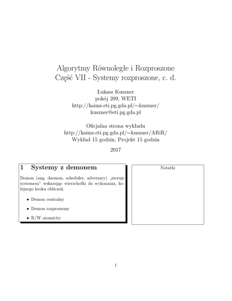 Algorytmy Równoległe i Rozproszone Część VII - Systemy rozproszone, c. d. Łukasz Kuszner pokój 209, WETI http://kaims.eti.pg.gda.pl/∼kuszner/ [email protected] Oficjalna strona wykładu http://kaims.eti.pg.gda.pl/∼kuszner/ARiR/ Wykład 15 godzin, Projekt 15 godzin 2017 1 Systemy z demonem Notatki Demon (ang. daemon, scheduler, adversary) „steruje systemem” wskazując wierzchołki do wykonania, kolejnego kroku obliczeń. • Demon centralny • Demon rozproszony • R/W atomicity 1 Algorytmy w modelu ze zmiennymi współdzielonymi i demonem Notatki Niech p będzie warunkiem, a M akcją. Algorytm dla każdego wierzchołka u jest dany za pomocą reguł postaci: R: if p(u) then M, Warunek p może dotyczyć stanu wierzchołka u oraz stanów wierzchołków z sąsiedztwa wierzchołka u, N (u) = {v | {v, u} ∈ E}. Jeśli warunek p dla wierzchołka u jest spełniony, to mówimy, że wierzchołek jest aktywny. Demon centralny Notatki Demon centralny spośród wierzchołków aktywnych wybiera jeden, który jako kolejny wykona ruch, w ten sposób żadne dwa ruchy nie są wykonywane w tym samym czasie. Demon rozproszony Notatki Demon rozproszony spośród wierzchołków aktywnych wybiera dowolny podzbiór tych, które jako kolejne wykonają ruch. R/W atomicity Notatki Przy konstruowaniu reguł pozwalaliśmy odczytać stany lokalne wszystkich wierzchołków w jednym kroku. Tu wprowadzamy ograniczenie do stanu tylko jednego sąsiada na ruch. 2 2 Problem łamania symetrii Notatki Rozpatrzmy graf jak na rysunku, w którym każdy wierzchołek v ma jedną zmienną lokalną f , inicjalnie f (v) = 0. Algorytm 1: color R1: if ∃u∈N (v) f (u) = f (v) then f(v)+=1 Notatki Ćwiczenie 1 Porównaj działanie algorytmu w modelu z demonem centralnym i rozproszonym. Ćwiczenie 2 Napisz odpowiedni algorytm dla modelu z przesyłaniem komunikatów. 3 3 Problem Bizantyjskich generałów Notatki (ang. coordinated attack problem) Dla dwóch procesorów pi , jednobitowego wejścia: xi oraz jednobitowego wyjścia yi , gdzie i = 1, 2; nie istnieje algorytm, który komunikując się przez zawodne medium (wiadomość może być dostarczona w całości poprawnie, lub wcale) i spełnia trzy warunki • Zgodność: y1 = y2 ; • Poprawność: jeśli x1 = x2 = 0, to y1 = y2 = 0; • Nietrywialność: istnieje wykonanie, dla którego y1 = y2 = 1; 4 Notatki Dowód nie wprost. Przypuśćmy, że taki algorytm istnieje. Rozpatrzmy wykonania, które prowadzą do zgodnej odpowiedzi y1 = y2 = 1 (nietrywialność). Spośród nich wybierzmy, te w której odebrano najmniej wiadomości. Odebrano co najmniej 1 wiadomość (poprawność i zgodność). Bez utraty ogólności możemy przyjąć, że ostatnią wiadomość otrzymał p1 . Rozpatrzmy wykonanie, w którym ostatnia wiadomość zaginęła. Wtedy również y1 = y2 = 1 (zgodność). Sprzeczność. 5 Notatki