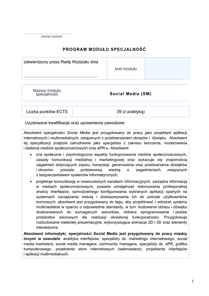 ............................................................ pieczęć wydziału PROGRAM MODUŁU SPECJALNOŚĆ zatwierdzony przez Radę Wydziału dnia kod modułu …………………………………………….. Nazwa modułu specjalność Social Media (SM) Liczba punktów ECTS 39 (z praktyką) Uzyskiwane kwalifikacje oraz uprawnienia zawodowe: Absolwent specjalności Social Media jest przygotowany do pracy jako projektant aplikacji internetowych i multimedialnych, związanych z przetwarzaniem obrazów i dźwięku. Absolwent tej specjalizacji znajdzie zatrudnienie jako specjalista z zakresu tworzenia, moderowania i badania mediów społecznościowych oraz ePR-u. Absolwent: • zna społeczne i psychologiczne aspekty funkcjonowania mediów społecznościowych, zasady komunikacji medialnej i marketingowej oraz wykazuje się znajomością zagadnień dotyczących zapisu, kompresji, generowania oraz przetwarzania dźwięków i obrazów; posiada podstawową wiedzę o zagadnieniach związanych z bezpieczeństwem systemów informatycznych; • projektuje komunikację w nowoczesnych kanałach informacyjnych, zarządza informacją w mediach społecznościowych, posiada umiejętność dokonywania profesjonalnej analizy interfejsów, samodzielnego konfigurowania wybranych aplikacji opartych na systemach zarządzania treścią i dostosowywania ich do potrzeb użytkowników końcowych; absolwent jest przygotowany do tego, aby projektować i wdrażać systemy multimedialne w oparciu o odpowiednie standardy, w tym: kodowania obrazu i dźwięku dostosowanych do wymaganych warunków, dobiera oprogramowanie i zestaw protokołów sieciowych dla realizacji określonej funkcjonalności. Przygotowuje rozbudowane materiały prezentacyjne, wykorzystujące animacje 2D i 3D oraz elementy interaktywne. Absolwent informatyki, specjalności Social Media jest przygotowany do pracy między innymi w zawodzie: analityka interfejsów, specjalisty ds. marketingu internetowego, social media marketera, social media managera, community managera, specjalisty ds. ePR, grafika komputerowego, projektanta stron internetowych (webmastera), projektanta interfejsów i aplikacji multimedialnych. 1 Efekty kształcenia dla modułu specjalności WIEDZA S3_W01 Ma wiedzę na temat zagadnień dotyczących zapisu, kompresji i generowania dźwięków i obrazów. S3_W02 Ma wiedzę dotyczącą społecznych i psychologicznych aspektów komunikacji w sieci internetowej. S3_W03 Posiada wiedzę na temat badań marketingowych. S3_W04 Ma uporządkowaną wiedzę na temat zarządzania kulturą w mediach społecznościowych. S3_W05 Posiada wiedzę z zakresu protokołów sieciowych wykorzystywanych przy transmisji danych, w tym - danych multimedialnych. S3_W06 Ma wiedzę na temat komunikacji marketingowej i e-PR. UMIEJĘTNOŚCI S3_U01 Potrafi samodzielnie konfigurować wybrane aplikacje oparte na systemach zarządzania treścią i dostosowywać je do potrzeb użytkowników końcowych. S3_U02 Umie projektować i wdrażać sieciowy system multimedialny w oparciu o odpowiednie standardy, w tym: kodowania obrazu i dźwięku dostosowanych do wymaganych warunków, dobiera oprogramowanie i zestaw protokołów sieciowych dla realizacji określonej funkcjonalności, projektuje graficzny interfejs dla systemów sieciowych, z uwzględnieniem aspektów ergonomii i funkcjonalności serwisów zdalnych. S3_ U03 Opracowuje strategię kampanii wizerunkowej w sieci internetowej (e-PR) oraz plan marketingu społecznościowego. S3_ U04 Przygotowuje rozbudowane materiały prezentacyjne, wykorzystujące animacje 2D i 3D oraz elementy interaktywne. S3_ U05 Potrafi zaplanować i przeprowadzić badania realizowane za pośrednictwem mediów społecznościowych i z użyciem narzędzi technicznych. S3_ U06 Stosuje wiedzę z zakresu komunikacji medialnej, psychologii społecznej i kulturoznawstwa do praktyki komunikacyjnej w jej różnych aspektach. KOMPETENCJE SPOŁECZNE S3_ K01 Korzysta z technik kształcenia zdalnego (w tym w systemie blended learning) do uzupełniania wiedzy i jej aktualizowania. S3_ K02 Potrafi formułować opinie na temat podstawowych zagadnień związanych z branżą informatyczną. S3_ K03 Potrafi pracować zespołowo i rozumie konieczność systematycznej pracy nad projektami, które są realizowane wieloetapowo. S3_ K04 Posiada umiejętność planowania swojego rozwoju zawodowego i podejmowania działań podnoszących kompetencje zawodowe. 2 X X X X X X X X X X X X X X X X X X X X X X X X Pokaz z objaśnieniem Egzamin pisemny Egzamin ustny X X X X X X Praca pisemna (esej) X X X X X X X X X Referat X X X X X X X X Udział w dyskusji X Projekt grupowy Zajęcia terenowe Ćwiczenia Projekt indywidualny X Praca laboratoryjna S3_W01 S3_W02 S3_W03 S3_W04 S3_W05 S3_W06 S3_U01 S3_U02 S3_U03 S3_U04 S3_U05 S3_U06 S3_K01 S3_K02 S3_K03 S3_K04 Gry dydaktyczne E – learning Formy sprawdzania efektów kształcenia X ................................................... pieczęć i podpis Dziekana 3