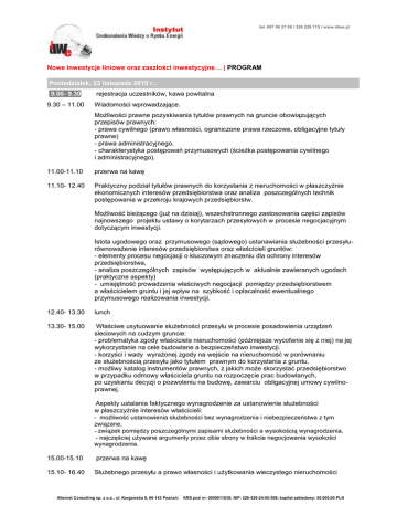 tel. 607 06 27 00 / 226 226 715 / www.idwe.pl Nowe inwestycje liniowe oraz zaszłości inwestycyjne… | PROGRAM Poniedziałek, 23 listopada 2015 r.: 9.00- 9.30 9.30 – 11.00 rejestracja uczestników, kawa powitalna Wiadomości wprowadzające. Możliwości prawne pozyskiwania tytułów prawnych na gruncie obowiązujących przepisów prawnych: - prawa cywilnego (prawo własności, ograniczone prawa rzeczowe, obligacyjne tytuły prawne) - prawa administracyjnego, - charakterystyka postępowań przymusowych (ścieżka postępowania cywilnego i administracyjnego). 11.00-11.10 przerwa na kawę 11.10- 12.40 Praktyczny podział tytułów prawnych do korzystania z nieruchomości w płaszczyźnie ekonomicznych interesów przedsiębiorstwa oraz analiza poszczególnych technik postępowania w przekroju krajowych przedsiębiorstw. Możliwość bieżącego (już na dzisiaj), wszechstronnego zastosowania części zapisów najnowszego projektu ustawy o korytarzach przesyłowych w procesie negocjacyjnym dotyczącym inwestycji. Istota ugodowego oraz przymusowego (sądowego) ustanawiania służebności przesyłurównoważenie interesów przedsiębiorstwa oraz właścicieli gruntów: - elementy procesu negocjacji o kluczowym znaczeniu dla ochrony interesów przedsiębiorstwa, - analiza poszczególnych zapisów występujących w aktualnie zawieranych ugodach (praktyczne aspekty) - umiejętność prowadzenia właściwych negocjacji pomiędzy przedsiębiorstwem a właścicielem gruntu i jej wpływ na szybkość i opłacalność ewentualnego przymusowego realizowania inwestycji. 12.40- 13.30 lunch 13.30- 15.00 Właściwe usytuowanie służebności przesyłu w procesie posadowienia urządzeń sieciowych na cudzym gruncie: - problematyka zgody właściciela nieruchomości (późniejsze wycofanie się z niej) na jej wykorzystanie na cele budowlane a bezpieczeństwo inwestycji. - korzyści i wady wyrażonej zgody na wejście na nieruchomość w porównaniu ze służebnością przesyłu jako tytułem prawnym do korzystania z gruntu, - możliwy katalog instrumentów prawnych, z jakich może skorzystać przedsiębiorstwo w przypadku odmowy właściciela gruntu na rozpoczęcie prac budowlanych, po uzyskaniu decyzji o pozwoleniu na budowę, zawarciu obligacyjnej umowy cywilnoprawnej. Aspekty ustalania faktycznego wynagrodzenie za ustanowienie służebności w płaszczyźnie interesów właścicieli: - możliwość ustanowienia służebności bez wynagrodzenia i niebezpieczeństwa z tym związane, - związek pomiędzy poszczególnymi zapisami służebności a wysokością wynagrodzenia, - najczęściej używane argumenty przez obie strony w trakcie negocjowania wysokości wynagrodzenia. 15.00-15.10 przerwa na kawę 15.10- 16.40 Służebnego przesyłu a prawo własności i użytkowania wieczystego nieruchomości Alternet Consulting sp. z o.o., ul. Kargowska 8, 60-143 Poznań; KRS pod nr: 0000011638; NIP: 526-526-24-85-509; kapitał zakładowy: 50.000,00 PLN tel. 607 06 27 00 / 226 226 715 / www.idwe.pl Praktyczne aspekty zagadnienia związanego z pozyskiwaniem tytułów prawnych na podstawie decyzji administracyjnej z art. 124 ustawy o gospodarce nieruchomościami: - umiejętność właściwego wyboru przez przedsiębiorstwo pomiędzy służebnością przesyłu a decyzją administracyjną, - niebezpieczeństwa związane z określaniem decyzji z art. 124 „ służebnością publiczną”, - czasowe możliwości zastosowania regulacji w odniesieniu do poszczególnych etapów inwestycji, - sposób dokumentowania prowadzonych negocjacji, zwłaszcza przy niechęci właścicieli do prowadzenia pisemnych negocjacji lub ich następczego potwierdzania, ćwiczenia w sporządzaniu wymaganej przez Starostę dokumentacji z przeprowadzonych rokowań, przy całkowitym braku możliwości współdziałania z właścicielem gruntu, a nawet przy jego wrogości bądź niechęci, - umiejętność skutecznego wykazywania w postępowaniu przed Starostą zasadności złożonego wniosku i załączonych do niego dokumentów z przeprowadzonych rokowań, najczęstsze błędy popełniane w tym zakresie przez wnioskodawcę, - wzajemne zależności pomiędzy ustanowieniem służebności a decyzją administracyjną z art.124 ustawy o gospodarce nieruchomościami, w szczególności analiza tego, czy się wzajemnie wykluczają oraz czy wybór i uzyskanie jednego z nich zamyka drogę do uzyskania drugiego tytułu prawnego. 16.40- 16.50 przerwa na kawę 16.50- 18.20 Możliwe sposoby działania w sytuacji braku właściwej regulacji stanu prawnego nieruchomości, przez które ma przebiegać inwestycja sieciowa: - technika postępowania w razie niezgodności między stanem prawnym nieruchomości ujawnionym w księdze wieczystej a rzeczywistym stanem prawnym, - problematyka znaczenia ustawowego pojęcia nieruchomości o nieuregulowanym stanie prawnym, - niemożność ustalenia osób, którym przysługują prawa własności do nieruchomości (brak aktualnego wpisu do KW), - metody działania w sytuacji nieustalenia (oraz braku takich możliwości) aktualnego miejsca pobytu (zamieszkania) właściciela gruntu. Analiza najnowszego orzecznictwa Sądu Najwyższego i sądów powszechnych pod kątem inwestycji sieciowych przez cudze grunty. 18.30 kolacja Wtorek, 24 listopada 2015 r: Zaszłości 8.00- 9.30 Przybliżenie znaczenia pojęcia zaszłości i jego podziały na różne okresy czasowe; - odniesienie okresu zrealizowania inwestycji liniowej do roszczeń finansowych właścicieli gruntów, - konieczność równoważenia interesów właścicieli nieruchomości i urządzeń sieciowych. . Podział roszczeń właścicieli gruntów na majątkowe i niemajątkowe; - wpływ rodzaju żądań na sytuację ekonomiczną przedsiębiorstwa i niezawodność świadczonych przez niego usług, - żądania właścicieli nieruchomości prawa pełnego dostępu do dokumentacji zaszłości Alternet Consulting sp. z o.o., ul. Kargowska 8, 60-143 Poznań; KRS pod nr: 0000011638; NIP: