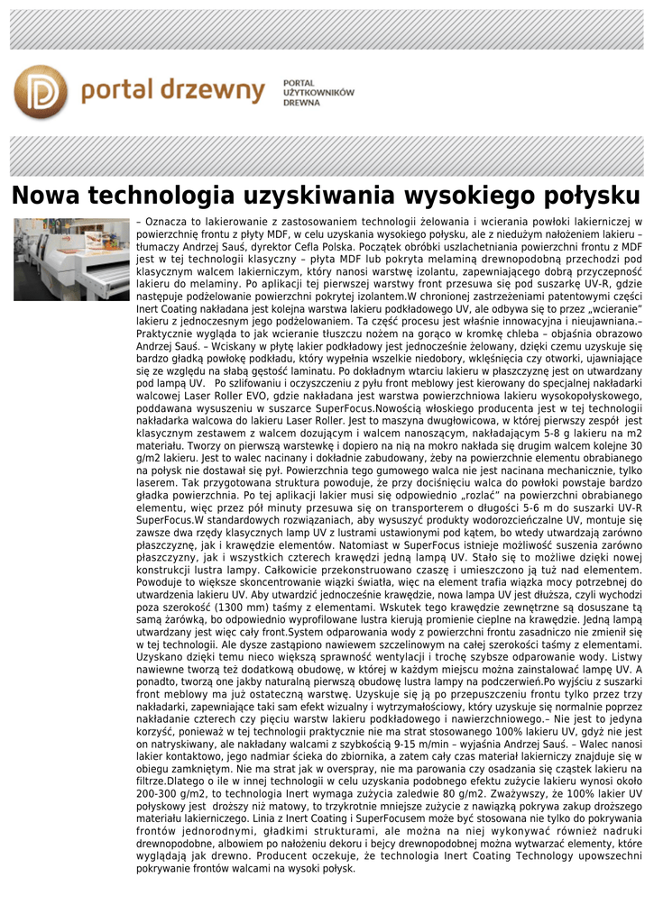 Nowa technologia uzyskiwania wysokiego połysku – Oznacza to lakierowanie z zastosowaniem technologii żelowania i wcierania powłoki lakierniczej w powierzchnię frontu z płyty MDF, w celu uzyskania wysokiego połysku, ale z niedużym nałożeniem lakieru – tłumaczy Andrzej Sauś, dyrektor Cefla Polska. Początek obróbki uszlachetniania powierzchni frontu z MDF jest w tej technologii klasyczny – płyta MDF lub pokryta melaminą drewnopodobną przechodzi pod klasycznym walcem lakierniczym, który nanosi warstwę izolantu, zapewniającego dobrą przyczepność lakieru do melaminy. Po aplikacji tej pierwszej warstwy front przesuwa się pod suszarkę UV-R, gdzie następuje podżelowanie powierzchni pokrytej izolantem.W chronionej zastrzeżeniami patentowymi części Inert Coating nakładana jest kolejna warstwa lakieru podkładowego UV, ale odbywa się to przez „wcieranie” lakieru z jednoczesnym jego podżelowaniem. Ta część procesu jest właśnie innowacyjna i nieujawniana.– Praktycznie wygląda to jak wcieranie tłuszczu nożem na gorąco w kromkę chleba – objaśnia obrazowo Andrzej Sauś. – Wciskany w płytę lakier podkładowy jest jednocześnie żelowany, dzięki czemu uzyskuje się bardzo gładką powłokę podkładu, który wypełnia wszelkie niedobory, wklęśnięcia czy otworki, ujawniające się ze względu na słabą gęstość laminatu. Po dokładnym wtarciu lakieru w płaszczyznę jest on utwardzany pod lampą UV. Po szlifowaniu i oczyszczeniu z pyłu front meblowy jest kierowany do specjalnej nakładarki walcowej Laser Roller EVO, gdzie nakładana jest warstwa powierzchniowa lakieru wysokopołyskowego, poddawana wysuszeniu w suszarce SuperFocus.Nowością włoskiego producenta jest w tej technologii nakładarka walcowa do lakieru Laser Roller. Jest to maszyna dwugłowicowa, w której pierwszy zespół jest klasycznym zestawem z walcem dozującym i walcem nanoszącym, nakładającym 5-8 g lakieru na m2 materiału. Tworzy on pierwszą warstewkę i dopiero na nią na mokro nakłada się drugim walcem kolejne 30 g/m2 lakieru. Jest to walec nacinany i dokładnie zabudowany, żeby na powierzchnie elementu obrabianego na połysk nie dostawał się pył. Powierzchnia tego gumowego walca nie jest nacinana mechanicznie, tylko laserem. Tak przygotowana struktura powoduje, że przy dociśnięciu walca do powłoki powstaje bardzo gładka powierzchnia. Po tej aplikacji lakier musi się odpowiednio „rozlać” na powierzchni obrabianego elementu, więc przez pół minuty przesuwa się on transporterem o długości 5-6 m do suszarki UV-R SuperFocus.W standardowych rozwiązaniach, aby wysuszyć produkty wodorozcieńczalne UV, montuje się zawsze dwa rzędy klasycznych lamp UV z lustrami ustawionymi pod kątem, bo wtedy utwardzają zarówno płaszczyznę, jak i krawędzie elementów. Natomiast w SuperFocus istnieje możliwość suszenia zarówno płaszczyzny, jak i wszystkich czterech krawędzi jedną lampą UV. Stało się to możliwe dzięki nowej konstrukcji lustra lampy. Całkowicie przekonstruowano czaszę i umieszczono ją tuż nad elementem. Powoduje to większe skoncentrowanie wiązki światła, więc na element trafia wiązka mocy potrzebnej do utwardzenia lakieru UV. Aby utwardzić jednocześnie krawędzie, nowa lampa UV jest dłuższa, czyli wychodzi poza szerokość (1300 mm) taśmy z elementami. Wskutek tego krawędzie zewnętrzne są dosuszane tą samą żarówką, bo odpowiednio wyprofilowane lustra kierują promienie cieplne na krawędzie. Jedną lampą utwardzany jest więc cały front.System odparowania wody z powierzchni frontu zasadniczo nie zmienił się w tej technologii. Ale dysze zastąpiono nawiewem szczelinowym na całej szerokości taśmy z elementami. Uzyskano dzięki temu nieco większą sprawność wentylacji i trochę szybsze odparowanie wody. Listwy nawiewne tworzą też dodatkową obudowę, w której w każdym miejscu można zainstalować lampę UV. A ponadto, tworzą one jakby naturalną pierwszą obudowę lustra lampy na podczerwień.Po wyjściu z suszarki front meblowy ma już ostateczną warstwę. Uzyskuje się ją po przepuszczeniu frontu tylko przez trzy nakładarki, zapewniające taki sam efekt wizualny i wytrzymałościowy, który uzyskuje się normalnie poprzez nakładanie czterech czy pięciu warstw lakieru podkładowego i nawierzchniowego.– Nie jest to jedyna korzyść, ponieważ w tej technologii praktycznie nie ma strat stosowanego 100% lakieru UV, gdyż nie jest on natryskiwany, ale nakładany walcami z szybkością 9-15 m/min – wyjaśnia Andrzej Sauś. – Walec nanosi lakier kontaktowo, jego nadmiar ścieka do zbiornika, a zatem cały czas materiał lakierniczy znajduje się w obiegu zamkniętym. Nie ma strat jak w overspray, nie ma parowania czy osadzania się cząstek lakieru na filtrze.Dlatego o ile w innej technologii w celu uzyskania podobnego efektu zużycie lakieru wynosi około 200-300 g/m2, to technologia Inert wymaga zużycia zaledwie 80 g/m2. Zważywszy, że 100% lakier UV połyskowy jest droższy niż matowy, to trzykrotnie mniejsze zużycie z nawiązką pokrywa zakup droższego materiału lakierniczego. Linia z Inert Coating i SuperFocusem może być stosowana nie tylko do pokrywania frontów jednorodnymi, gładkimi strukturami, ale można na niej wykonywać również nadruki drewnopodobne, albowiem po nałożeniu dekoru i bejcy drewnopodobnej można wytwarzać elementy, które wyglądają jak drewno. Producent oczekuje, że technologia Inert Coating Technology upowszechni pokrywanie frontów walcami na wysoki połysk.
