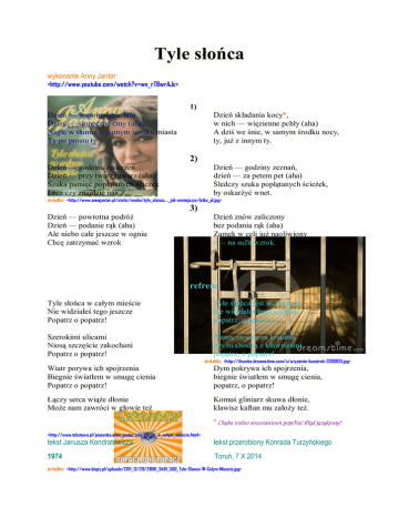 Tyle słońca wykonanie Anny Jantar: <http://www.youtube.com/watch?v=wn_rTBwrAJc> 1) Dzień — wspomnienie lata Dzień — słoneczne ćmy (aha) Nagle w tłumie w samym środku miasta Ty po prostu ty Dzień składania kocy*, w nich — więzienne pchły (aha) A dziś we śnie, w samym środku nocy, ty, już z innym ty. 2) Dzień — godzina zwierzeń Dzień — przy twarzy twarz (aha) Szuka pamięć poplątanych ścieżek Lecz czy znajdzie nas Dzień — godziny zeznań, dzień — za petem pet (aha) Śledczy szuka poplątanych ścieżek, by oskarżyć wnet. źródło: <http://www.annajantar.pl/static/media/tyle_slonca...._jak-zmniejszyc-fotke_pl.jpg> 3) Dzień — powrotna podróż Dzień — podanie rąk (aha) Ale niebo całe jeszcze w ogniu Chcę zatrzymać wzrok Dzień znów zaliczony bez podania rąk (aha) Zamek w celi już naoliwiony i — na sufit wzrok. refren: Tyle słońca w całym mieście Nie widziałeś tego jeszcze Popatrz o popatrz! Tyle słońca jest w areszcie, nie widziałaś tego jeszcze, popatrz, o popatrz! Szerokimi ulicami Niosą szczęście zakochani Popatrz o popatrz! Plamy światła za kratami, psy tu chodzą z klawiszami, popatrz, o popatrz! źródłó: <http://thumbs.dreamstime.com/x/więzienie-komórek-3280831.jpg> Wiatr porywa ich spojrzenia Biegnie światłem w smugę cienia Popatrz o popatrz! Dym pokrywa ich spojrzenia, biegnie światłem w smugę cienia, popatrz, o popatrz! Łączy serca wiąże dłonie Może nam zawróci w głowie też Komuś gliniarz skuwa dłonie, klawisz kaftan mu założy też. * Chyba wolno aresztantowi popełnić błąd językowy? <http://www.tekstowo.pl/piosenka,anna_jantar,tyle_slo_ca_w_calym_miescie.html> tekst Janusza Kondratowicza tekst przerobiony Konrada Turzyńskiego 1974 Toruń, 7 X 2014 źródło: <http://www.kiepy.pl/uploads/2011_12/29/21981_3481_500_Tyle-Slonca-W-Calym-Miescie.jpg>