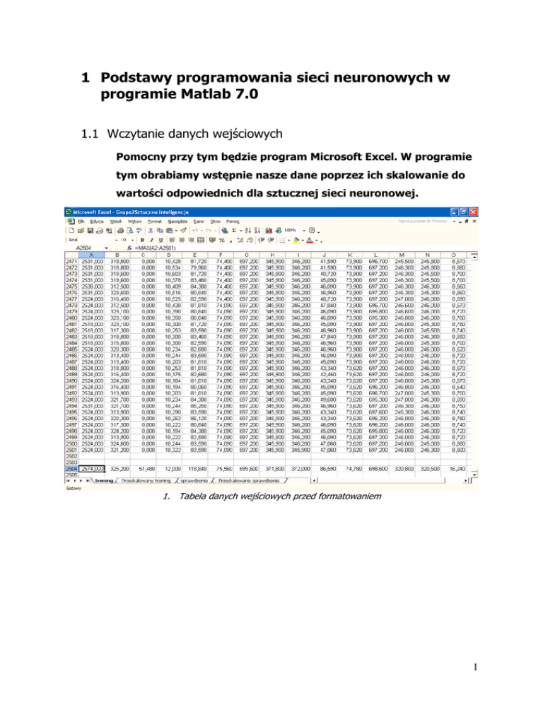 1 Podstawy programowania sieci neuronowych w programie Matlab 7.0 1.1 Wczytanie danych wejściowych Pomocny przy tym będzie program Microsoft Excel. W programie tym obrabiamy wstępnie nasze dane poprzez ich skalowanie do wartości odpowiednich dla sztucznej sieci neuronowej. 1. Tabela danych wejściowych przed formatowaniem 1 Wykonujemy to przez podzielenie kolumn wejściowych i wyjściowych przez element maksymalny danej kolumny. 2. Tabela w programie Excel po sformatowaniu 2 Widać dokładnie na powyŜszym zrzucie ekranu, iŜ wartości danych podawanych na wejścia i wyjście naszej sztucznej sieci neuronowej zawierają się w granicach 0-1. Wnioskiem jest to, iŜ wszystkie wejścia posiadają obecnie taką samą waŜność. Teraz moŜe nastąpić wklejenie danych do programu Matlab 7.0. W tym celu otwieramy tenŜe program i w linii poleceń edytujemy nowy skrypt dla poszczególnych danych, które chcemy zapamiętać do wykonania niezbędnych obliczeń. 3. Edycja skryptu 3 Wciskając klawisz [enter], otrzymujemy dostęp do okna edycji skryptu i tam deklarujemy tablicę wejściową i wyjściową dla treningu i symulacji w następujący sposób: nazwa zmiennej jest tablicą danych wejściowych po transponowaniu. 4. Wprowadzenie całej tablicy do skryptu 4 NaleŜy pamiętać przy tym, iŜ zapis liczb ułamkowych jest róŜny dla kaŜdego z programów. W programie Matlab jest to kropka dziesiętna, a w Excel jest to przecinek. Dlatego dokonujemy konwersji tych znaków na prawidłowe. Operację powtarzamy kolejno dla wejść i wyjść sieci, uzyskując w ten sposób cztery tablice. Dalej, wczytujemy zmienne, uruchamiając skrypty po kolei. 5. Wczytanie tablicy poprzez wybranie opcji RUN z listy rozwijanej 5 Otrzymujemy w ten sposób dostęp do tablic. 6. Tablice widoczne w lewym górnym oknie 6 1.2 Inicjalizacja narzędzia Neural Networks Tool oraz procedura wczytania danych, treningu sieci oraz symulacji Całą procedurę rozpoczynamy od wpisania komendy nntool w linii poleceń programu Matlab 7.0. Skutkować to będzie pojawieniem się okna przedstawionego poniŜej. 7. Okno narzędzia NNTOOL 7 Teraz wczytujemy wejścia i wyjścia naszej sieci uŜywając przycisku Import. Pojawi się okno przedstawione poniŜej, gdzie określamy, czy dane przez nas wybrane mają być przypisane do wejścia, czy wyjścia sieci (Inputs/Targets). 8. Wybór tablicy wejtrening jako wejściowa Po zadeklarowaniu naszych danych, naciskamy przycisk New Network… celem zaprojektowania naszej sieci neuronowej. Z waŜniejszych, po kolei moŜemy zmienić: ⇒ ⇒ ⇒ ⇒ ⇒ ⇒ Nazwę Rodzaj sieci Zakres danych wejściowych Liczbę warstw Liczbę neuronów w poszczególnej warstwie Funkcję przejścia 8 9. Deklarowanie wszelkich parametrów naszej sieci neuronowej 9 Po skonfigurowaniu naszej sieci następuje faza treningu. Rozpoczynamy ją naciskając przycisk Train… z dostępnych tym oknie. Pojawi się okno pokazane poniŜej. 10. Okno treningu z otwartą zakładką Training Info 10 Deklarujemy tutaj, które zmienne mają być danymi podawanymi na wejścia sieci neuronowej które mają być informacją przedstawianą sieci na wyjściu oraz mamy moŜliwość zmiany nazw zmiennych z wynikami treningu tzn. tablicy z wyjściami oraz tablicy z błędami. Po skonfigurowaniu wszelkich interesujących nas informacji w tej zakładce, przechodzimy do kolejnej, czyli parametrów treningu. Tu wybieramy liczbę epok (u mnie 233) oraz do jakiej wartości dąŜyć ma błąd lub, kiedy przerwać trening sieci (wyniki satysfakcjonujące). Pokazane jest to poniŜej na zrzucie ekranu. 11. Wybór liczby epok uczenia sieci Kliknięcie na przycisku Train Network powoduje rozpoczęcie fazy treningu sieci, co zobrazowane jest na dynamicznie zmieniającym się wykresie, dąŜącym do wykonania zadeklarowanych u nas dwustu trzydziestu trzech epok. Na zrzucie ekranu 11 przedstawionym poniŜej, doskonale widać, jak zmienia się błąd wraz z narastaniem epok. 12. Błąd generowany przez naszą sieć po 233 epokach 12 Okno to zamykamy i wybieramy zakładkę Simulate, gdzie wybieramy nasze dane sprawdzające, które mają zostać podane na wejście sieci neuronowej celem weryfikacji jej sprawności uczenia. Na zrzucie ekranu pokazanym niŜej widać wybrane dane. Naciśnięcie przycisku Simulate Network rozpocznie procedurę przedstawiania sieci próbek sprawdzających. 13. Sprawdzanie sieci 13 Aby móc wizualizować wyniki naszej pracy, musimy eksportować nasze dane do okna głównego programu Matlab 7.0. W tym celu klikamy na przycisku Export i wybieramy interesujące nas dane (w moim przypadku jest to tablica z danymi otrzymanymi na wyjściu sieci. Patrz zrzut ekranu niŜej. 14. Eksportowanie zmiennej wyjściowej 14 Po przełączeniu się do okna programu głównego, widzimy zmienną poŜądaną przez nas, w lewym górnym oknie programu. Jak widać, na zrzucie ekranu poniŜej, ma ta tablica wymiary 1x2500, czyli wymiar się zgadza z liczbą próbek przedstawianych wyjściu sieci w fazie treningu. 15. Okno główne i interesujące nas dane wynikowe 15 Ostatnią fazą jest przedstawienie porównania rzeczywistych próbek wyjściowych obiektu oraz próbek uzyskanych w procesie symulacji. Na poniŜszym zrzucie ekranu pokazuję juŜ ostateczny wynik procesu uczenia. 16. Wyniki uczenia Niebieski wykres, to próbki z rzeczywistego obiektu, natomiast czerwony, to sposób, w jaki sieć poradziła sobie z procesem uczenia. Dalej moŜna stosować proces obróbki statystycznej danych pod względem błędów, czego tu nie będę przedstawiał. 16 2 Wyniki otrzymanych symulacji poszczególnych sieci neuronowych 2.1 Sieci Feed-forward backpropagation Krótki opis sieci: 17. Przykładowa sieć jednokierunkowa feed-forward Jest to sieć jednokierunkowa Występuje tutaj propagacja wsteczna błędu Jedna z najczęściej wykorzystywanych sieci neuronowych Inaczej zwana perceptronem wielowarstwowym Zwykle uczenie odbywa się z nauczycielem, czyli jest nadzoro