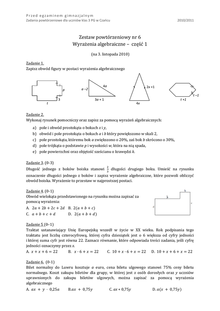 Przed egzaminem gimnazjalnym Zadania powtórzeniowe dla uczniów klas 3 PG w Czańcu 2010/2011 Zestaw powtórzeniowy nr 6 Wyrażenia algebraiczne – część 1 (na 3. listopada 2010) Zadanie 1. Zapisz obwód figury w postaci wyrażenia algebraicznego 4a p 2x +1 a –2 t –1 3 3a + 1 t +1 4x t Zadanie 2. Wykonaj rysunek pomocniczy oraz zapisz za pomocą wyrażeń algebraicznych: a) b) c) d) e) pole i obwód prostokąta o bokach x i y, obwód i pole prostokąta o bokach a i b który powiększono w skali 2, pole prostokąta, któremu bok a zwiększono o 20%, zaś bok b skrócono o 30%, pole trójkąta o podstawie p i wysokości w, która na nią spada, pole powierzchni oraz objętość sześcianu o krawędzi k. Zadanie 3. (0-3) Długość jednego z boków boiska stanowi długości drugiego boku. Umieść na rysunku oznaczenie długości jednego z boków i zapisz wyrażenie algebraiczne, które pozwoli obliczyć obwód boiska. Wyrażenie to przestaw w najprostszej postaci. Zadanie 4. (0-1) Obwód wielokąta przedstawionego na rysunku można zapisać za pomocą wyrażenia: A. 2 2 2 2 B. 2 C. D. 2 Zadanie 5 (0–1) Traktat ustanawiający Unię Europejską wszedł w życie w XX wieku. Rok podpisania tego traktatu jest liczbą czterocyfrową, której cyfra dziesiątek jest o 6 większa od cyfry jedności i której suma cyfr jest równa 22. Zaznacz równanie, które odpowiada treści zadania, jeśli cyfrę jedności oznaczymy przez x. A. 6 22 B. · 6 22 C. 10 · 6 22 D. 10 6 22 Zadanie 6. (0-1) Bilet normalny do Luwru kosztuje a euro, cena biletu ulgowego stanowi 75% ceny biletu normalnego. Koszt zakupu biletów dla grupy, w której jest x osób dorosłych oraz y uczniów uprawnionych do zakupu biletów ulgowych, można zapisać za pomocą wyrażenia algebraicznego A. 0,25 B. 0,75 C. ax + 0,75y D. 0,75 Przed egzaminem gimnazjalnym Zadania powtórzeniowe dla uczniów klas 3 PG w Czańcu 2010/2011 Zadanie 7. (0-1) W Wigierskim Parku Narodowym żyje 25 gatunków ryb, gadów o 8 gatunków mniej niż gatunków ryb i o 3 gatunki ssaków więcej niż gatunków ryb i gadów łącznie. Jeżeli wprowadzimy oznaczenia: g - liczba gatunków gadów, s - liczba gatunków ssaków, wówczas prawidłowa zależność to A. s > g B. s < g C. s = g + 3 D. g = s– 8 Zadanie 8. a) Zapisz obwód narysowanej figury w postaci wyrażenia algebraicznego, b) Która z odpowiedzi przedstawia wymiary tej figury jeżeli wiadomo, że x = 2 A. 12 x 24 B. 15 x 30 C. 10 x 20 D. 12 x 14 Zadanie 9. (0-1) Roczny koszt utrzymania rezerwatu można obliczyć ze wzoru , gdzie k- roczny koszt, d – liczba drzew będących pomnikami przyrody. Jeżeli w białowieskim Parku Narodowym rośnie 1565 pomników przyrody, to roczny koszt utrzymania takiego rezerwatu jest równy około A. 5000 zł B. 25000zł C. 50000zł D. 250000 zł Zadanie 10. (0-2) Dla patrzącego z góry płytka chodnika ma kształt ośmiokąta, w którym kolejne boki są prostopadłe. Na rysunkach przedstawiono jego kształt, sposób układania płytek oraz niektóre wymiary w centymetrach. Ułożono sześć płytek. Oblicz długość odcinka a. Napisz wyrażenie algebraiczne, odpowiadające długości analogicznego odcinka dla pasa złożonego z n płytek. W zestawie wykorzystano materiały opracowane przez OKE oraz CKE