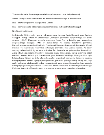 Temat wydarzenia: Pamiątka powstania listopadowego na ziemi świętokrzyskiej Nazwa szkoły: Szkoła Podstawowa im. Kornela Makuszyńskiego w Siesławicach Imię i nazwisko dyrektora szkoły: Beata Durnaś Imię i nazwisko osoby odpowiedzialnej merytorycznie za treść: Barbara Skrzypek Krótki opis wydarzenia: 26 listopada 2016 r. zuchy wraz z rodzicami, panią dyrektor Beatą Durnaś i panią Barbarą Skrzypek wzięły udział w uroczystości „Pamiątka powstania listopadowego na ziemi świętokrzyskiej”. Uroczyste obchody rozpoczęła Msza Św. w kościele pod wezwaniem Niepokalanego Poczęcia NMP w Busku-Zdroju w intencji bohaterów powstania listopadowego z terenu ziemi buskiej – Franciszka i Fortunata Rzewuskich, kawalerów Virtuti Militari. Tło historyczne wszystkim zebranym przybliżył pan Dariusz Kalina. Po mszy wszyscy zebrani udali się na teren kościółka Św. Leonarda na grób rodziny Rzewuskich, gdzie odbyło się złożenie kwiatów i zapalenie zniczy przez dzieci. Salwę honorową oddał oddział Żuawów Śmierci pod dowództwem pana Roberta Osińskiego. Uroczystość ta była kolejną lekcją historii nie tylko dla zuchów, ale i wszystkich zebranych. Dzielnym zuchom należą się słowa uznania i gorące podziękowania, ponieważ poświęcili swój wolny czas, aby zdobywać nowe wiadomości i godnie reprezentować naszą szkołę. Szczególne słowa uznania należą się najmłodszym dzieciom – Miłoszowi Skublikowskiemu z oddziału przedszkolnego i Michasi Korepcie z klasy pierwszej oraz naszym absolwentom – uczniom gimnazjum.