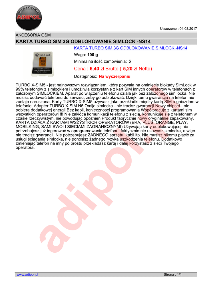 Utworzono : 04.03.2017 AKCESORIA GSM KARTA TURBO SIM 3G ODBLOKOWANIE SIMLOCK -NS14 KARTA TURBO SIM 3G ODBLOKOWANIE SIMLOCK -NS14 Waga: 100 g Minimalna ilość zamówienia: 5 Cena : 6,40 zł Brutto ( 5,20 zł Netto) Dostępność: Na wyczerpaniu ad ip ol .p l TURBO X-SIM5 - jest najnowszym rozwiązaniem, które pozwala na ominięcie blokady SimLock w 99% telefonów z simlockiem i umożliwia korzystanie z kart SIM innych operatorów w telefonach z założonym SIMLOCKIEM. Aparat po włączeniu telefonu działa jak bez założonego sim locka. Nie musisz oddawać telefonu do serwisu, żeby go odblokować. Dzięki temu gwarancja na telefon nie zostaje naruszona. Karty TURBO X-SIM5 używasz jako przekładki między kartą SIM a gniazdem w telefonie. Adapter TURBO X-SIM N5 Omija simlocka - nie tracisz gwarancji Nowy chipset - nie pobiera dodatkowej energii Bez kabli, konieczności programowania Współpracuje z kartami sim wszystkich operatorówi !!! Nie zakłóca komunikacji telefonu z siecią, komunikuje się z telefonem w czasie rzeczywistym, nie powodując opóźnień Produkt fabrycznie nowy oryginalnie zapakowany. KARTA DZIAŁA Z KARTAMI WSZYSTKICH OPERATORÓW (ERA, PLUS, ORANGE, PLAY, MOBILKING, SAMI SWOI I SIECIAMI ZAGRANICZNYMI) Używając karty odblokowującej nie potrzebujesz już ingerować w oprogramowanie telefonu, faktycznie nie usuwasz simlocka, a więc nie tracisz gwarancji. Nie potrzebujesz ŻADNEGO sprzętu, kabli itp. Nie musisz nikomu płacić za usługi ściągania simlocka, nie ponosisz żadnego ryzyka uszkodzenia telefonu. Dodatkowo zmieniając telefon na inny po prostu przekładasz kartę i dalej korzystasz z sieci Twojego operatora. www.adipol.pl Powered by TCPDF (www.tcpdf.org) Strona : 1/1