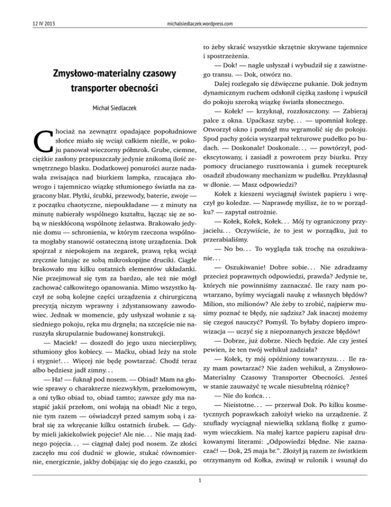 12 IV 2013 michalsiedlaczek.wordpress.com to żeby skraść wszystkie skrz˛etnie skrywane tajemnice i spostrzeżenia. — Dok! — nagle usłyszał i wybudził si˛e z zawistnego transu. — Dok, otwórz no. Dalej rozlegało si˛e dźwi˛eczne pukanie. Dok jednym dynamicznym ruchem odsłonił ci˛eżka˛ zasłon˛e i wpuścił do pokoju szeroka˛ wiazk˛ ˛ e światła słonecznego. — Kołek! — krzyknał, ˛ rozzłoszczony. — Zabieraj palce z okna. Upaćkasz szyb˛e. . . — upomniał koleg˛e. Otworzył okno i pomógł mu wgramolić si˛e do pokoju. Spod pachy gościa wyszarpał tekturowe pudełko po budach. — Doskonale! Doskonale. . . — powtórzył, podekscytowany, i zasiadł z powrotem przy biurku. Przy pomocy drucianego rusztowania i gumek recepturek osadził zbudowany mechanizm w pudełku. Przyklasnał ˛ w dłonie. — Masz odpowiedzi? Kołek z kieszeni wyciagn ˛ ał ˛ świstek papieru i wr˛eczył go koledze. — Naprawd˛e myślisz, że to w porzad˛ ku? — zapytał ostrożnie. — Kołek, Kołek, Kołek. . . Mój ty ograniczony przyjacielu. . . Oczywiście, że to jest w porzadku, ˛ już to przerabialiśmy. — No bo. . . To wyglada ˛ tak troch˛e na oszukiwanie. . . — Oszukiwanie! Dobre sobie. . . Nie zdradzamy przecież poprawnych odpowiedzi, prawda? Jedynie te, których nie powinniśmy zaznaczać. Ile razy nam powtarzano, byśmy wyciagali ˛ nauk˛e z własnych bł˛edów? Milion, sto milionów? Ale żeby to zrobić, najpierw musimy poznać te bł˛edy, nie sadzisz? ˛ Jak inaczej możemy si˛e czegoś nauczyć? Pomyśl. To byłaby dopiero improwizacja — uczyć si˛e z niepoznanych jeszcze bł˛edów! — Dobrze, już dobrze. Niech b˛edzie. Ale czy jesteś pewien, że ten twój wehikuł zadziała? — Kołek, ty mój opóźniony towarzyszu. . . Ile razy mam powtarzać? Nie żaden wehikuł, a ZmysłowoMaterialny Czasowy Transporter Obecności. Jesteś w stanie zauważyć t˛e wcale niesubtelna˛ różnic˛e? — Nie do końca. . . — Nieistotne. . . — przerwał Dok. Po kilku kosmetycznych poprawkach założył wieko na urzadzenie. ˛ Z szuflady wyciagn ˛ ał ˛ niewielka˛ szklana˛ fiolk˛e z gumowym wieczkiem. Na małej kartce papieru zapisał drukowanymi literami: „Odpowiedzi bł˛edne. Nie zaznaczać! — Dok, 25 maja br.”. Złożył ja˛ razem ze świstkiem otrzymanym od Kołka, zwinał ˛ w rulonik i wsunał ˛ do Zmysłowo-materialny czasowy transporter obecności Michał Siedlaczek C hociaż na zewnatrz ˛ opadajace ˛ popołudniowe słońce miało si˛e wciaż ˛ całkiem nieźle, w pokoju panował wieczorny półmrok. Grube, ciemne, ci˛eżkie zasłony przepuszczały jedynie znikoma˛ ilość zewn˛etrznego blasku. Dodatkowej ponurości aurze nadawała zwisajaca ˛ nad biurkiem lampka, rzucajaca ˛ złowrogo i tajemniczo wiazk˛ ˛ e stłumionego światła na zagracony blat. Płytki, śrubki, przewody, baterie, zwoje — z poczatku ˛ chaotyczne, niepoukładane — z minuty na minut˛e nabierały wspólnego kształtu, łacz ˛ ac ˛ si˛e ze soba˛ w nieskłócona˛ wspólnot˛e żelastwa. Brakowało jedynie domu — schronienia, w którym rzeczona wspólnota mogłaby stanowić ostateczna˛ istot˛e urzadzenia. ˛ Dok spojrzał z niepokojem na zegarek, prawa˛ r˛eka˛ wciaż ˛ zr˛ecznie lutujac ˛ ze soba˛ mikroskopijne druciki. Ciagle ˛ brakowało mu kilku ostatnich elementów układanki. Nie przejmował si˛e tym za bardzo, ale też nie mógł zachować całkowitego opanowania. Mimo wszystko ła˛ czył ze soba˛ kolejne cz˛eści urzadzenia ˛ z chirurgiczna˛ precyzja˛ niczym wprawny i zdystansowany zawodowiec. Jednak w momencie, gdy usłyszał wołanie z sa˛ siedniego pokoju, r˛eka mu drgn˛eła; na szcz˛eście nie naruszyła skrupulatnie budowanej konstrukcji. — Maciek! — doszedł do jego uszu niecierpliwy, stłumiony głos kobiecy. — Maćku, obiad leży na stole i stygnie!. . . Wi˛ecej nie b˛ed˛e powtarzać. Chodź teraz albo b˛edziesz jadł zimny. . . — Ha! — fuknał ˛ pod nosem. — Obiad! Mam na głowie sprawy o charakterze niezwykłym, przełomowym, a oni tylko obiad to, obiad tamto; zawsze gdy ma nastapić ˛ jakiś przełom, oni wołaja˛ na obiad! Nic z tego, nie tym razem — oświadczył przed samym soba˛ i zabrał si˛e za wkr˛ecanie kilku ostatnich śrubek. — Gdyby mieli jakiekolwiek poj˛ecie! Ale nie. . . Nie maja˛ żadnego poj˛ecia. . . — ciagn ˛ ał ˛ dalej pod nosem. Ze złości zacz˛eło mu coś dudnić w głowie, stukać równomiernie, energicznie, jakby dobijajac ˛ si˛e do jego czaszki, po 1 12 IV 2013 michalsiedlaczek.wordpress.com fiolki, która˛ zamknał ˛ przy pomocy gumowego wieczka. — Co to? — zapytał zmieszany Kołek. — Czy to nie oczywiste? To fiolka materializujaca. ˛ Pomyśl czasem przed zadaniem pytania. — Nie możemy po prostu włożyć kartek do kieszeni? — I co ja przed chwila˛ mówiłem o myśleniu? Przecież my nie b˛edziemy materializować si˛e w przeszłości. Przeniesiemy tam jedynie nasza˛ obecność zmysłowa. ˛ Przez czas działania urzadzenia ˛ b˛edzie tak, jakbyśmy byli tam naprawd˛e, ale w momencie naszego powrotu wszystko zniknie. Nikt o nas nie b˛edzie pami˛etał i nic, co ze soba˛ zabraliśmy, nie pozostanie materialne, wi˛ec nasza˛ kartk˛e papieru b˛edziemy mogli sobie co najwyżej włożyć w. . . — Maciek! — znowu rozległo si˛e wołanie. — Maciek, słyszysz? Jest obiad. . . Dok, zniesmaczony, złapał si˛e za czoło. Podszedł do drzwi i przekr˛ecił zamek. — Gotowa tu jeszcze wtargnać. ˛ . . — wyjaśnił w złości. — Nie powinieneś iść? To z odpowiedziami możemy zawsze załatwić później. . . — Po czyjej ty jesteś stronie, Kołek? Sa˛ pewne priorytety. Zreszta, ˛ jeśli wszystko pójdzie według planu, nawet nie zauważa, ˛ że mnie nie ma. Załatwimy to w trymiga. Podejdź no tutaj — polecił Dok, wziawszy ˛ urza˛ dzenie i włożywszy fiolk˛e materializujac ˛ a˛ do kieszeni. 