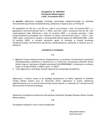 Zarządzenie Nr 328/2015 Prezydenta Miasta Sopotu z dnia 14 września 2015 r. w sprawie: ogłoszenia drugiego przetargu pisemnego nieograniczonego na sprzedaż nieruchomości gruntowej niezabudowanej, położonej w Sopocie przy ul. Polnej 64. Na podstawie art. 38 ust. 1, art. 40 ust. 1 pkt 3 i ust.3 ustawy z dnia 21 sierpnia 1997 r. o gospodarce nieruchomościami (Dz.U. z 2014r. poz.518 z późn. zmianami) oraz §3, §6 i §13 rozporządzenia Rady Ministrów z dnia 14 września 2004 r. w sprawie sposobu i trybu przeprowadzania przetargów oraz rokowań na zbycie nieruchomości (Dz.U. z 2014 r. poz. 1490 z póżn. zmianami) w związku z uchwałą Rady Miasta Sopotu Nr XXXIII/555/2005 z dnia 16 grudnia 2005r. w sprawie wyrażenia zgody na sprzedaż w drodze przetargu nieograniczonego nieruchomości gruntowej niezabudowanej, położonej w Sopocie przy ul. Polnej 64 zarządzam co następuje : § 1. 1. Ogłaszam drugi przetarg pisemny nieograniczony na sprzedaż nieruchomości gruntowej niezabudowanej, położonej w Sopocie przy ul. Polnej 64, stanowiącej własność Gminy Miasta Sopotu, zapisanej w księdze wieczystej GD1S/00003868/7, oznaczonej na arkuszu mapy nr 34 jako działka nr 198/2 o pow. 11.184m2. 2. Treść ogłoszenia o przetargu stanowi załącznik do niniejszego Zarządzenia. § 2. Ogłoszenie, o którym mowa w §1 podlega wywieszeniu na tablicy ogłoszeń w siedzibie Urzędu Miasta Sopotu przy ul. Kościuszki 25/27, ogłoszeniu w prasie codziennej ogólnokrajowej oraz na stronie internetowej miasta Sopotu, co najmniej na 2 miesiące przed wyznaczonym terminem przetargu. § 3. Wykonanie Zarządzenia powierzam Naczelnikowi Wydziału Strategii Rozwoju Miasta Urzędu Miasta Sopotu. § 4. Zarządzenie wchodzi w życie z dniem podpisania. PREZYDENT MIASTA Jacek Karnowski Załącznik do Zarządzenia Nr 328/2015 Prezydenta Miasta Sopotu z dnia 14.09.2015r. Prezydent Miasta Sopotu 81-704 Sopot, ul. Kościuszki 25/27, fax 058 551-01-33 ogłasza drugi przetarg pisemny nieograniczony na sprzedaż nieruchomości gruntowej niezabudowanej, stanowiącej własność Gminy Miasta Sopotu (strona internetowa www.sopot.pl) 1. Lokalizacja nieruchomości: Sopot, ul. Polna 64 2. Oznaczenie nieruchomości w ewidencji gruntów: nieruchomość gruntowa stanowiąca własność Gminy Miasta Sopotu, oznaczona na arkuszu mapy nr 34 jako działka nr 198/2, zapisana w księdze wieczystej KW GD1S/00003868/7. 3. Powierzchnia nieruchomości: 11.184m2. 4. Opis nieruchomości: Nieruchomość położona jest po zachodniej stronie ul. Bitwy pod Płowcami, w drugiej linii zabudowy ulicy Polnej. Jest to usługowo-mieszkaniowa część Sopotu. W zasięgu nieruchomości znajdują się wszystkie sieci uzbrojenia podziemnego. Działka nieogrodzona, porośnięta drzewami owocowymi i krzewami, ma kształt regularny, prostokątny, teren płaski. 5. Obciążenia nieruchomości i inne zobowiązania: nieruchomość wolna jest od obciążeń i innych zobowiązań. 6. Przeznaczenie nieruchomości i sposób jej zagospodarowania: Nieruchomość znajduje się w obszarze, dla którego obowiązuje miejscowy plan zagospodarowania przestrzennego rejonu zbiegu ulic Polnej i Bitwy pod Płowcami w mieście Sopocie (symbol planu M-6/02)- Uchwała Rady Miasta Sopotu Nr X/150/2003 z dnia 29 sierpnia 2003r, karta terenu 02. Przeznaczenie terenu: teren usług (U) – zakres dopuszczalnych funkcji usługowych: ochrona zdrowia, lecznictwo uzdrowiskowe i specjalistyczne. Warunki gestorów sieci oraz Wydziału Inżynierii i Ochrony Środowiska tut. Urzędu, bezwzględnie obowiązujące inwestora, znajdują się w Wydziale Strategii Rozwoju Miasta UM Sopotu - do wglądu i zapoznania się przed złożeniem oferty. Istniejące warunki nie zwalniają inwestora z obowiązku wystąpienia do gestorów sieci z wnioskiem o wydanie szczegółowych warunków technicznych podłączenia nieruchomości do infrastruktury podziemnej. 7. Ustalenia dodatkowe: Z uwagi na: - przebiegający przez teren działki posesyjny kanał kanalizacji deszczowej, stanowiący własność prywatną, zachodzi konieczność ustanowienia służebności gruntowej, - przebiegające przez teren działki linie energetyczne nN oraz złącze kablowe, zachodzi konieczność zawarcia umowy służebności przesyłu dla przedmiotowych urządzeń elektroenergetycznych z ENERGA-OPERATOR S.A, na podstawie art. 3051 Kodeksu cywilnego. 8. Cena wywoławcza nieruchomości: 8.200.000,-zł (słownie: osiem milionów dwieście tysięcy złotych), plus podatek VAT w wysokości 23% od wartości nieruchomości ustalonej w przetargu. Łączna cena sprzedaży nieruchomości wraz z podatkiem VAT, winna wpłynąć na konto Urzędu Miasta Sopotu nr 79116022020000000061948141, do dnia podpisania umowy sprzedaży w formie aktu notarialnego. W dniu podpisywania umowy w formie aktu notarialnego, cała wymagana należność musi znajdować się na w/w rachunku. 9. Termin i miejsce składania pisemnych ofert: pisemne oferty w zamkniętych kopertach z napisem: „Przetarg na sprzedaż nieruchomości gruntowej przy ul. Polnej 64 w Sopocie”, należy składać do dnia 14.12.2015r. do godz. 1800 w Kancelarii Ogólnej Urzędu Miasta Sopotu, pok. 16. 10. Pisemne oferty powinny zawierać: a) imię nazwisko i adres oferenta albo nazwę lub firmę oraz siedzibę, wpis do ewidencji działalności gospodarczej (dot. osoby fizycznej) b) odpis aktualny z KRS oraz zgodę organów statutowych na nabycie w/w nieruchomości (dot. osoby prawnej), c) datę sporządzenia oferty, d) oświadczenie, że oferent zapoznał się z warunkami i przedmiotem przetargu i przyjmuje je bez zastrzeżeń, e) oferowaną cenę, f) koncepcję funkcjonalno-przestrzenną z planem zagospodarowania działki w skali (1:500), z wizualizacją, g) program funkcjonalno-użytkowy określający charakter planowanej działalności, h) opis przedmiotu i zakresu prowadzonej dotychczas działalności, i) dokument posiadania środków finansowych na realizację inwestycj
