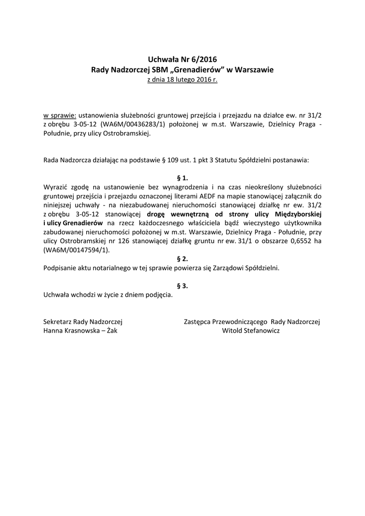 Uchwała Nr 6/2016 Rady Nadzorczej SBM „Grenadierów” w Warszawie z dnia 18 lutego 2016 r. w sprawie: ustanowienia służebności gruntowej przejścia i przejazdu na działce ew. nr 31/2 z obrębu 3-05-12 (WA6M/00436283/1) położonej w m.st. Warszawie, Dzielnicy Praga Południe, przy ulicy Ostrobramskiej. Rada Nadzorcza działając na podstawie § 109 ust. 1 pkt 3 Statutu Spółdzielni postanawia: § 1. Wyrazić zgodę na ustanowienie bez wynagrodzenia i na czas nieokreślony służebności gruntowej przejścia i przejazdu oznaczonej literami AEDF na mapie stanowiącej załącznik do niniejszej uchwały - na niezabudowanej nieruchomości stanowiącej działkę nr ew. 31/2 z obrębu 3-05-12 stanowiącej drogę wewnętrzną od strony ulicy Międzyborskiej i ulicy Grenadierów na rzecz każdoczesnego właściciela bądź wieczystego użytkownika zabudowanej nieruchomości położonej w m.st. Warszawie, Dzielnicy Praga - Południe, przy ulicy Ostrobramskiej nr 126 stanowiącej działkę gruntu nr ew. 31/1 o obszarze 0,6552 ha (WA6M/00147594/1). § 2. Podpisanie aktu notarialnego w tej sprawie powierza się Zarządowi Spółdzielni. § 3. Uchwała wchodzi w życie z dniem podjęcia. Sekretarz Rady Nadzorczej Hanna Krasnowska – Żak Zastępca Przewodniczącego Rady Nadzorczej Witold Stefanowicz