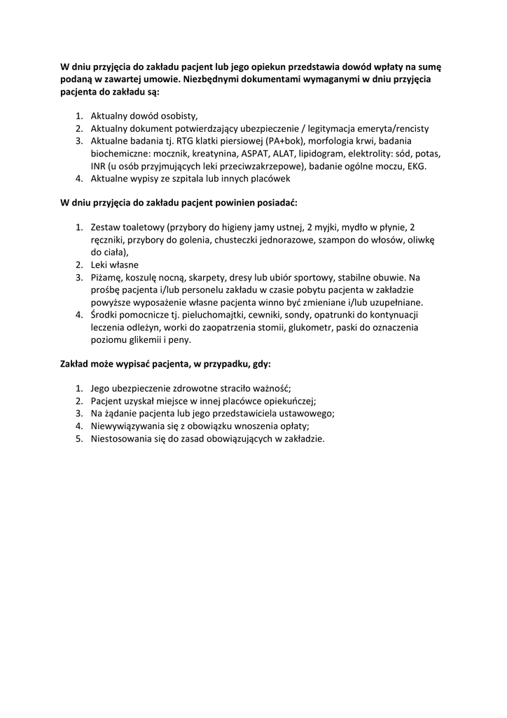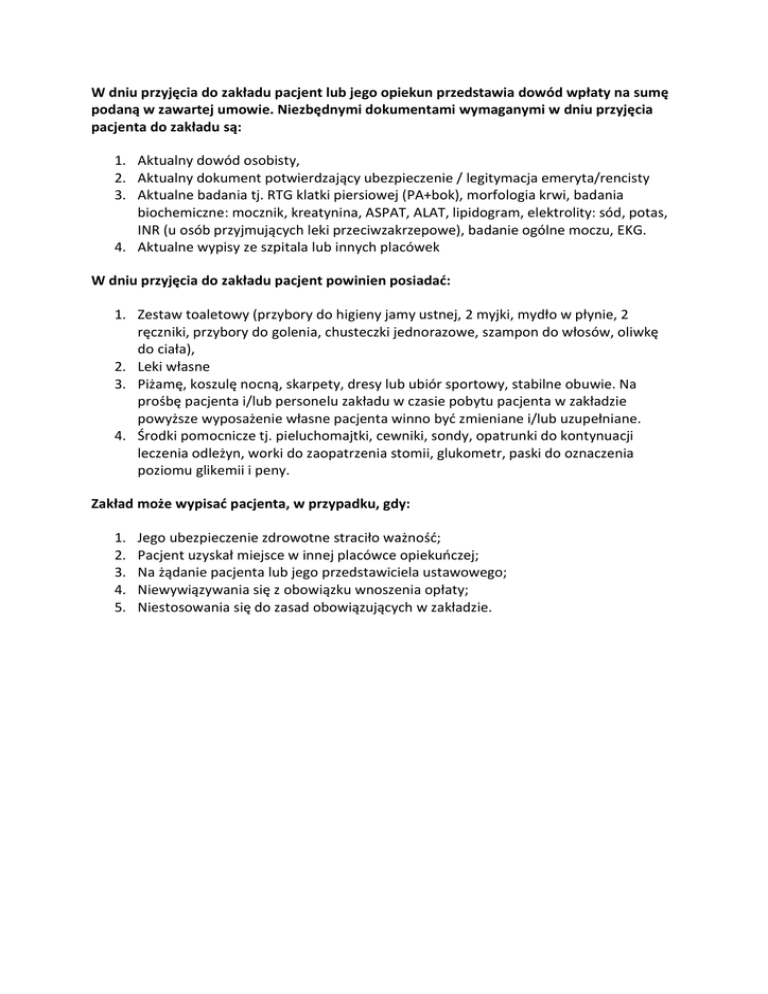 W dniu przyjęcia do zakładu pacjent lub jego opiekun przedstawia dowód wpłaty na sumę podaną w zawartej umowie. Niezbędnymi dokumentami wymaganymi w dniu przyjęcia pacjenta do zakładu są: 1. Aktualny dowód osobisty, 2. Aktualny dokument potwierdzający ubezpieczenie / legitymacja emeryta/rencisty 3. Aktualne badania tj. RTG klatki piersiowej (PA+bok), morfologia krwi, badania biochemiczne: mocznik, kreatynina, ASPAT, ALAT, lipidogram, elektrolity: sód, potas, INR (u osób przyjmujących leki przeciwzakrzepowe), badanie ogólne moczu, EKG. 4. Aktualne wypisy ze szpitala lub innych placówek W dniu przyjęcia do zakładu pacjent powinien posiadać: 1. Zestaw toaletowy (przybory do higieny jamy ustnej, 2 myjki, mydło w płynie, 2 ręczniki, przybory do golenia, chusteczki jednorazowe, szampon do włosów, oliwkę do ciała), 2. Leki własne 3. Piżamę, koszulę nocną, skarpety, dresy lub ubiór sportowy, stabilne obuwie. Na prośbę pacjenta i/lub personelu zakładu w czasie pobytu pacjenta w zakładzie powyższe wyposażenie własne pacjenta winno być zmieniane i/lub uzupełniane. 4. Środki pomocnicze tj. pieluchomajtki, cewniki, sondy, opatrunki do kontynuacji leczenia odleżyn, worki do zaopatrzenia stomii, glukometr, paski do oznaczenia poziomu glikemii i peny. Zakład może wypisać pacjenta, w przypadku, gdy: 1. 2. 3. 4. 5. Jego ubezpieczenie zdrowotne straciło ważność; Pacjent uzyskał miejsce w innej placówce opiekuńczej; Na żądanie pacjenta lub jego przedstawiciela ustawowego; Niewywiązywania się z obowiązku wnoszenia opłaty; Niestosowania się do zasad obowiązujących w zakładzie.