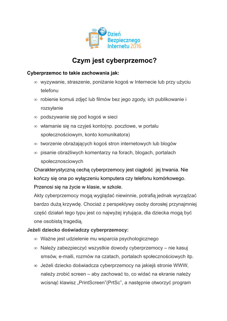 Czym jest cyberprzemoc? Cyberprzemoc to takie zachowania jak: • wyzywanie, straszenie, poniżanie kogoś w Internecie lub przy użyciu telefonu • robienie komuś zdjęć lub filmów bez jego zgody, ich publikowanie i rozsyłanie • podszywanie się pod kogoś w sieci • włamanie się na czyjeś konto(np. pocztowe, w portalu społecznościowym, konto komunikatora) • tworzenie obrażających kogoś stron internetowych lub blogów • pisanie obraźliwych komentarzy na forach, blogach, portalach społecznosciowych Charakterystyczną cechą cyberprzemocy jest ciągłość jej trwania. Nie kończy się ona po wyłączeniu komputera czy telefonu komórkowego. Przenosi się na życie w klasie, w szkole. Akty cyberprzemocy mogą wyglądać niewinnie, potrafią jednak wyrządzać bardzo dużą krzywdę. Chociaż z perspektywy osoby dorosłej przynajmniej część działań tego typu jest co najwyżej irytująca, dla dziecka mogą być one osobistą tragedią. Jeżeli dziecko doświadczy cyberprzemocy: • Ważne jest udzielenie mu wsparcia psychologicznego • Należy zabezpieczyć wszystkie dowody cyberprzemocy – nie kasuj smsów, e-maili, rozmów na czatach, portalach społecznościowych itp. • Jeżeli dziecko doświadcza cyberprzemocy na jakiejś stronie WWW, należy zrobić screen – aby zachować to, co widać na ekranie należy wcisnąć klawisz „PrintScreen”(PrtSc”, a następnie otworzyć program tekstowy (np. Word) lub graficzny (np. Paint) i wkleić tam screen naciskając jednocześnie klawisze „Ctrl” i „V”. Należy pamiętać, o zapisaniu pliku! • Jeśli doszło do przestępstwa, należy o sprawie poinformować policję. Podobnie należy postąpić, jeśli sprawca pozostaje nieznany, policja może uzyskać dostęp do billingów telefonicznych lub logów z serwera administratora serwisu pozwalające na zidentyfikowanie go. • Wsparcie psychologiczne w przypadkach cyberprzemocy i porad dotyczących rozwiązywania problemów z nią związanych można znaleźć również u konsultantów bezpłatnych telefonów zaufania dla dzieci i młodzieży 116111 (www.116111.pl) oraz 800100100 (www.800100100.pl) dla rodziców. Czym jest hejtowanie? Słowo "krytyka" w mowie potocznej ma wydźwięk negatywny, co nie do końca jest prawidłowe. Krytyka to nic innego jak wyrażanie swojej opinii na dany temat, ale zarówno w sposób pozytywny jak i negatywny. Za przykład niech posłużą krytycy filmowi, których zadaniem nie jest mieszać ludzi z błotem, a wyrażać swoją opinię (również pozytywną) na temat danego filmu. Hejtingiem można nazwać więc wyrażanie swojej opinii, ale zawsze w sposób negatywny. Często w sposób wulgarny i chamski, nie poparty żadnymi argumentami. Hejtowanie rzadko ma cokolwiek wspólnego z krytyką. Hejterzy skupiają się raczej na obrażaniu i "obrzucaniu błotem". Samo zjawisko hejtingu jest ściśle związane związane z internetem, co nie znaczy że tylko tam występuje. Zasady antyhejtowe - wskazówki dla młodzieży. 1. Zastanów się zanim odpowiesz na hejterski komentarz. Nie daj się ponieść emocjom, nie odpowiadaj pod wpływem chwili. 2. Jeżeli bardzo się złościsz, napisz odpowiedź, a potem weź głęboki oddech i skasuj ją. 3. Nie odpowiadaj agresją na agresję. W ten sposób jedynie prowokujesz hejtera do dalszego obrażania. 4. Nie lajkuj, nie udostępniaj hejterskich komentarzy. W ten sposób jedynie zwiększasz ich zasięg. 5. Jeżeli możesz kasuj nienawistne komentarze. 6. Zgłaszaj hejt i mowę nienawiści korzystając z opcji dostępnych na forach lub w mediach społecznościowych. 7. Nie każda krytyka to hejt. Odróżniaj hejt od konstruktywnej krytyki. 8. Gdy coś ci się nie podoba lub denerwuje, wyraź to kulturalnie, nie hejtuj. 9. Nie rezygnuj z tego, co robisz, myślisz i mówisz tylko ze względu na hejetrów. 10. Jeżeli nie możesz poradzić sobie z hejterem, zgłoś to osobie zaufanej lub zadzwoń do telefonu zaufania: 116 111. Więcej informacji na temat cyberprzemocy, niebezpiecznych treści, sextingu, praw autorskich, niebezpiecznych kontaktów i nadużywania Internetu znajdziecie Państwo na stronie internetowej saferinternet.pl Twoje dziecko jest ofiarą lub świadkiem hejtu i potrzebuje pomocy? Może poprosić o pomoc w szkole. Może także skontaktować się z telefonem zaufania dla dzieci i młodzieży 116 111 Telefon 116 111 (codziennie od 12.00 do 22.00) LiveChat na stronie 116111.pl/czat (pon.- pt. od 12.00 do 18.00) Formularz kontaktowy na stronie 116111.pl/napisz (zawsze) Jest hejterem? Niech skontaktuje się ze swoją głową, sercem i sumieniem. Przeprosi i nie robi tego więcej! Zbyt trudne? Zawsze może skorzystać ze wsparcia konsultantów Telefonu Zaufania dla Dzieci i Młodzieży 116 111 lub poprosić o pomoc w szkole Źródło: - materiały z kampanii „Powiedz stop cyberprzemocy „ i „Przytul hejtera” (saferinternet.pl) - dojrzewamy.pl - fdn.pl