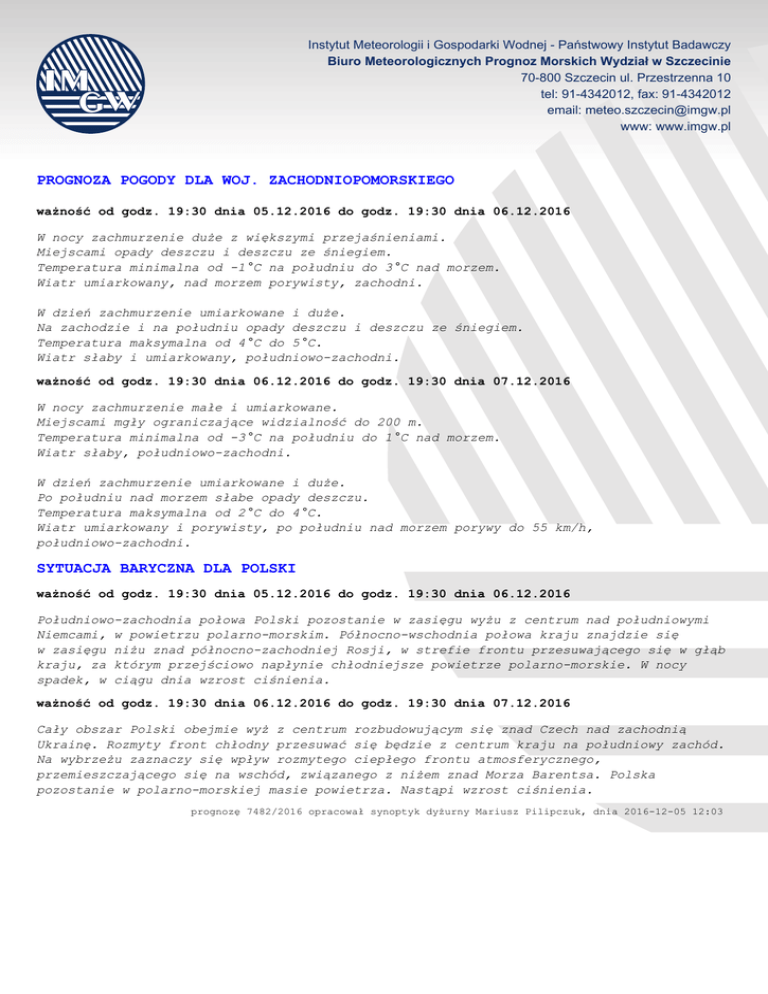 Instytut Meteorologii i Gospodarki Wodnej - Państwowy Instytut Badawczy Biuro Meteorologicznych Prognoz Morskich Wydział w Szczecinie 70-800 Szczecin ul. Przestrzenna 10 tel: 91-4342012, fax: 91-4342012 email: [email protected] www: www.imgw.pl PROGNOZA POGODY DLA WOJ. ZACHODNIOPOMORSKIEGO ważność od godz. 19:30 dnia 05.12.2016 do godz. 19:30 dnia 06.12.2016 W nocy zachmurzenie duże z większymi przejaśnieniami. Miejscami opady deszczu i deszczu ze śniegiem. Temperatura minimalna od -1°C na południu do 3°C nad morzem. Wiatr umiarkowany, nad morzem porywisty, zachodni. W dzień zachmurzenie umiarkowane i duże. Na zachodzie i na południu opady deszczu i deszczu ze śniegiem. Temperatura maksymalna od 4°C do 5°C. Wiatr słaby i umiarkowany, południowo-zachodni. ważność od godz. 19:30 dnia 06.12.2016 do godz. 19:30 dnia 07.12.2016 W nocy zachmurzenie małe i umiarkowane. Miejscami mgły ograniczające widzialność do 200 m. Temperatura minimalna od -3°C na południu do 1°C nad morzem. Wiatr słaby, południowo-zachodni. W dzień zachmurzenie umiarkowane i duże. Po południu nad morzem słabe opady deszczu. Temperatura maksymalna od 2°C do 4°C. Wiatr umiarkowany i porywisty, po południu nad morzem porywy do 55 km/h, południowo-zachodni. SYTUACJA BARYCZNA DLA POLSKI ważność od godz. 19:30 dnia 05.12.2016 do godz. 19:30 dnia 06.12.2016 Południowo-zachodnia połowa Polski pozostanie w zasięgu wyżu z centrum nad południowymi Niemcami, w powietrzu polarno-morskim. Północno-wschodnia połowa kraju znajdzie się w zasięgu niżu znad północno-zachodniej Rosji, w strefie frontu przesuwającego się w głąb kraju, za którym przejściowo napłynie chłodniejsze powietrze polarno-morskie. W nocy spadek, w ciągu dnia wzrost ciśnienia. ważność od godz. 19:30 dnia 06.12.2016 do godz. 19:30 dnia 07.12.2016 Cały obszar Polski obejmie wyż z centrum rozbudowującym się znad Czech nad zachodnią Ukrainę. Rozmyty front chłodny przesuwać się będzie z centrum kraju na południowy zachód. Na wybrzeżu zaznaczy się wpływ rozmytego ciepłego frontu atmosferycznego, przemieszczającego się na wschód, związanego z niżem znad Morza Barentsa. Polska pozostanie w polarno-morskiej masie powietrza. Nastąpi wzrost ciśnienia. prognozę 7482/2016 opracował synoptyk dyżurny Mariusz Pilipczuk, dnia 2016-12-05 12:03