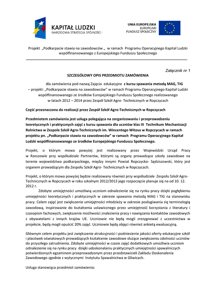 Projekt „Podkarpacie stawia na zawodowców „ w ramach Programu Operacyjnego Kapitał Ludzki współfinansowanego z Europejskiego Funduszu Społecznego SZCZEGÓŁOWY OPIS PRZEDMIOTU ZAMÓWIENIA Załącznik nr 1 dla zamówienia pod nazwą Zajęcia edukacyjne z kursu spawania metodą MAG, TIG – projekt: „Podkarpacie stawia na zawodowców” w ramach Programu Operacyjnego Kapitał Ludzki współfinansowanego ze środków Europejskiego Funduszu Społecznego realizowanego w latach 2012 – 2014 przez Zespół Szkół Agro- Technicznych w Ropczycach Część przeznaczona do realizacji przez Zespół Szkół Agro-Technicznych w Ropczycach Przedmiotem zamówienia jest usługa polegająca na zorganizowaniu i przeprowadzeniu teoretycznych i praktycznych zajęć z kursu spawania dla uczniów klas III Technikum Mechanizacji Rolnictwa w Zespole Szkół Agro-Technicznych im. Wincentego Witosa w Ropczycach w ramach projektu pn. „Podkarpacie stawia na zawodowców” w ramach Programu Operacyjnego Kapitał Ludzki współfinansowanego ze środków Europejskiego Funduszu Społecznego. Projekt, o którym mowa powyżej jest realizowany przez Wojewódzki Urząd Pracy w Rzeszowie przy współudziale Partnerów, którymi są organy prowadzące szkoły zawodowe na terenie województwa podkarpackiego, między innymi Powiat Ropczycko- Sędziszowski, który jest organem prowadzącym dla Zespołu Szkół Agro- Technicznych w Ropczycach. Projekt, o którym mowa powyżej będzie realizowany również przy współudziale Zespołu Szkół AgroTechnicznych w Ropczycach w roku szkolnym 2012/2013 jego rozpoczęcie planuje się na od 10. 12. 2012 r. Zdobyte umiejętności umożliwią uczniom odnalezienie się na rynku pracy dzięki pogłębieniu umiejętności teoretycznych i praktycznych w zakresie spawania metodą MAG i TIG na stanowisku pracy. Celem zajęć jest zwiększenie umiejętności młodzieży w zakresie posługiwania się terminologią zawodową, inspirowanie do kształcenia ustawicznego przez umiejętność korzystania z literatury i czasopism fachowych, zwiększenie możliwości znalezienia pracy i nawiązania kontaktów zawodowych z obywatelami z innych krajów UE. Uczniowie nie będą mogli zrezygnować z uczestnictwa w projekcie, będą mogli opuścić 20% zajęć. Uczniowie będą objęci również ankietą ewaluacyjną. Głównym celem projektu jest zwiększenie atrakcyjności i podniesienie jakości oferty edukacyjne szkół i placówek oświatowych prowadzących kształcenie zawodowe służące zwiększeniu zdolności uczniów do przyszłego zatrudnienia. Zdobyte umiejętności w czasie zajęć dodatkowych umożliwia uczniom odnalezienie się na rynku pracy dzięki udoskonalaniu praktycznych umiejętności spawalniczych potwierdzonych egzaminem przeprowadzonym przez przedstawicieli Zakładu Doskonalenia Zawodowego zgodnie z wytycznymi Instytutu Spawalnictwa w Gliwicach. Usługa stanowiąca przedmiot zamówienia: Projekt „Podkarpacie stawia na zawodowców „ w ramach Programu Operacyjnego Kapitał Ludzki współfinansowanego z Europejskiego Funduszu Społecznego 1}polegać będzie na przeprowadzeniu zajęć teoretycznych z kursu spawacza MAG, TIG dla klas: III Technikum w Zespole Szkól Agro-Technicznych w Ropczycach, im. Wincentego Witosa w grupie 10 osobowej. 2}polegać będzie na przeprowadzeniu zajęć praktycznych z kursu spawacza MAG, TIG dla klas: III Technikum w Zespole Szkól Agro-Technicznych w Ropczycach, im. Wincentego Witosa w grupie 10 osobowej. 3} swoim zakresem obejmować będzie również systematyczne prowadzenie w trakcie realizacji zajęć teoretycznych i praktycznych dokumentacji z przebiegu zajęć dydaktycznych oddzielnie dla każdej grupy, a po zakończeniu zajęć sporządzenie kompleksowej dokumentacji z przebiegu i realizacji usługi będącej przedmiotem zamówienia dla każdej grupy, oraz sporządzenie certyfikatu uczestnictwa po zakończeniu projektu. 4}realizacja zajęć będzie bezpośrednio prowadzona przez osoby wskazane przez Wykonawcę w złożonej ofercie do prowadzenia zajęć dydaktycznych i spełniających wymagania określone przez Zamawiającego Zajęcia teoretyczne stanowiące przedmiot usługi będącej przedmiotem zamówienia odbywać się będą 1} w grupie, 10 osobowej w miesiącach grudzień 2012 i styczeń raz w tygodniu przez okres 6 tygodni, po 3 godziny lekcyjne, a w 7 tygodniu 2 godziny zajęć godz. lekcyjna – 45 min ( razem 20 godzin ). 2} w godzinach popołudniowych, w przedziale czasowym od 14.00 do 16.30 – z przerwą w dniach wskazanych przez dyrektora szkoły w oparciu o uaktualniony plan zajęć Zajęcia praktyczne stanowiące przedmiot usługi będącej przedmiotem zamówienia odbywać się będą 1} w grupie, 10 osobowej w miesiącach grudzień 2012 i styczeń dwa razy w tygodniu przez okres 5 tygodni, po 5 godzin praktycznych ( razem 50 godzin ). 2} w godzinach popołudniowych, oraz w soboty w dniach wskazanych przez dyrektora szkoły w oparciu o uaktualniony plan zajęć W celu prawidłowej realizacji usługi będącej przedmiotem zamówienia Zamawiający zapewni możliwość korzystania przez uczniów z książki: Wydawca: KABE KROSNO Leon Mistur „Spawanie łukowe w osłonach gazowych „ Projekt „Podkarpacie stawia na zawodowców „ w ramach Programu Operacyjnego Kapitał Ludzki współfinansowanego z Europejskiego Funduszu Społecznego Celem zajęć jest zwiększenie umiejętności młodzieży w zakresie wykonywanie prac spawalniczych inspirowanie do kształcenia ustawicznego przez umiejętność korzystania z literatury i czasopism fachowych, zwiększenie możliwości znalezienia pracy i nawiązania kontaktów zawodowych z obywatelami z innych krajów UE, poprawa oceny z nauczanego przedmiotu. Uczniowie nie będą mogli zrezygnować z uczestnictwa w projekcie. Uczniowie będą mogli opuścić 20% zajęć. Uczniowie będą objęci również ankietą ewaluacyjną. Program zajęć dydaktycznych stanowiących przedmiot u