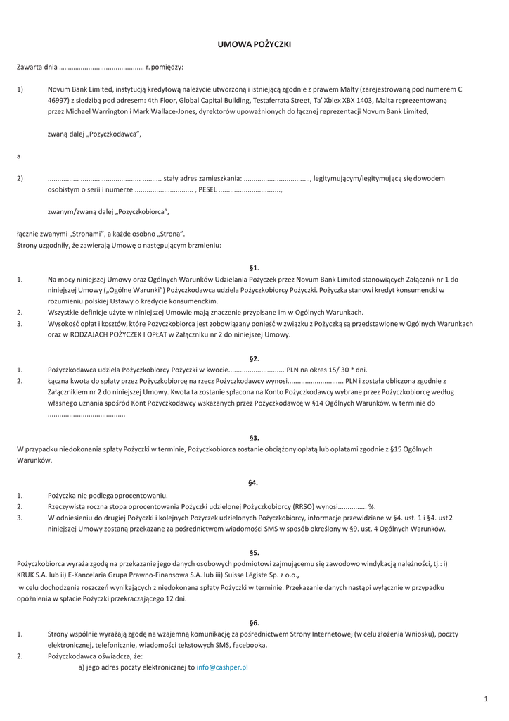 UMOWA POŻYCZKI Zawarta dnia …………..............................… r. pomiędzy: 1) Novum Bank Limited, instytucją kredytową należycie utworzoną i istniejącą zgodnie z prawem Malty (zarejestrowaną pod numerem C 46997) z siedzibą pod adresem: 4th Floor, Global Capital Building, Testaferrata Street, Ta’ Xbiex XBX 1403, Malta reprezentowaną przez Michael Warrington i Mark Wallace-Jones, dyrektorów upoważnionych do łącznej reprezentacji Novum Bank Limited, zwaną dalej „Pozyczkodawca”, a 2) ................ ............................... .......... stały adres zamieszkania: .................................., legitymującym/legitymującą się dowodem osobistym o serii i numerze .............................. , PESEL ................................, zwanym/zwaną dalej „Pozyczkobiorca”, łącznie zwanymi „Stronami”, a każde osobno „Strona”. Strony uzgodniły, że zawierają Umowę o następującym brzmieniu: 1. 2. 3. 1. 2. §1. Na mocy niniejszej Umowy oraz Ogólnych Warunków Udzielania Pożyczek przez Novum Bank Limited stanowiących Załącznik nr 1 do niniejszej Umowy („Ogólne Warunki”) Pożyczkodawca udziela Pożyczkobiorcy Pożyczki. Pożyczka stanowi kredyt konsumencki w rozumieniu polskiej Ustawy o kredycie konsumenckim. Wszystkie definicje użyte w niniejszej Umowie mają znaczenie przypisane im w Ogólnych Warunkach. Wysokość opłat i kosztów, które Pożyczkobiorca jest zobowiązany ponieść w związku z Pożyczką są przedstawione w Ogólnych Warunkach oraz w RODZAJACH POŻYCZEK I OPŁAT w Załączniku nr 2 do niniejszej Umowy. §2. Pożyczkodawca udziela Pożyczkobiorcy Pożyczki w kwocie............................. PLN na okres 15/ 30 * dni. Łączna kwota do spłaty przez Pożyczkobiorcę na rzecz Pożyczkodawcy wynosi............................. PLN i została obliczona zgodnie z Załącznikiem nr 2 do niniejszej Umowy. Kwota ta zostanie spłacona na Konto Pożyczkodawcy wybrane przez Pożyczkobiorcę według własnego uznania spośród Kont Pożyczkodawcy wskazanych przez Pożyczkodawcę w §14 Ogólnych Warunków, w terminie do ........................................ §3. W przypadku niedokonania spłaty Pożyczki w terminie, Pożyczkobiorca zostanie obciążony opłatą lub opłatami zgodnie z §15 Ogólnych Warunków. §4. 1. 2. 3. Pożyczka nie podlega oprocentowaniu. Rzeczywista roczna stopa oprocentowania Pożyczki udzielonej Pożyczkobiorcy (RRSO) wynosi............... %. W odniesieniu do drugiej Pożyczki i kolejnych Pożyczek udzielonych Pożyczkobiorcy, informacje przewidziane w §4. ust. 1 i §4. ust 2 niniejszej Umowy zostaną przekazane za pośrednictwem wiadomości SMS w sposób określony w §9. ust. 4 Ogólnych Warunków. §5. Pożyczkobiorca wyraża zgodę na przekazanie jego danych osobowych podmiotowi zajmującemu się zawodowo windykacją należności, tj.: i) KRUK S.A. lub ii) E-Kancelaria Grupa Prawno-Finansowa S.A. lub iii) Suisse Légiste Sp. z o.o., w celu dochodzenia roszczeń wynikających z niedokonana spłaty Pożyczki w terminie. Przekazanie danych nastąpi wyłącznie w przypadku opóźnienia w spłacie Pożyczki przekraczającego 12 dni. 1. 2. §6. Strony wspólnie wyrażają zgodę na wzajemną komunikację za pośrednictwem Strony Internetowej (w celu złożenia Wniosku), poczty elektronicznej, telefonicznie, wiadomości tekstowych SMS, facebooka. Pożyczkodawca oświadcza, że: a) jego adres poczty elektronicznej to [email protected] 1 3. 1. 2. 1. 2. 3. 1. 2. 3. b) jego numer telefonu to (22) 206 21 49 Pożyczkobiorca oświadcza, że: a) jego adres poczty elektronicznej to ………………. b) jego numer telefonu to...................... §7. Strony oświadczają, że są świadome istnienia możliwości polubownego rozwiązania ewentualnych sporów wynikających z postanowień niniejszej Umowy i Ogólnych Warunków. Pożyczkodawca wskazuje, że organem nadzoru właściwym dla spraw konsumenckich jest Consumer Complaints Manager przy Consumer Complaints Unit, Malta Financial Services Authority, Notabile Road, Attard, BKR 3000, Malta. §8. Na mocy niniejszej Umowy, zawsze pod warunkiem uprzedniego spełnienia przez Pożyczkobiorcę warunków przewidzianych Ogólnymi Warunkami, Strony wspólnie wyrażają zgodę na zawarcie przyszłych Umów Pożyczki. Zawarcie przyszłych Umów Pożyczki może nastąpić za pośrednictwem wiadomości SMS lub za pośrednictwem Konta Użytkownika, na warunkach określonych w Ogólnych Warunkach. O Pożyczkę może ubiegać się wyłącznie osoba posiadająca aktywne Konto Użytkownika. §9. Pożyczkobiorca może odstąpić od niniejszej Umowy, bez podawania przyczyn, w terminie określonym w §18 Ogólnych Warunków. Pożyczkobiorca oświadcza, że dane podane w niniejszej Umowie są zgodne z prawdą, rzetelne i aktualne, oraz przyjmuje do wiadomości, że podanie nieprawdziwych danych wprowadzających w błąd Pożyczkodawcę i powodujących niekorzystne rozporządzenie mieniem Pożyczkodawcy naraża Pożyczkodawcę na szkodę i powoduje powstanie z tego tytułu odpowiedzialności po stronie Pożyczkobiorcy. Następujące załączniki stanowią integralną część niniejszej Umowy: i. Załącznik nr 1 – Ogólne Warunki Udzielania Pożyczek przez Novum Bank Limited, ii. Załącznik nr 2 – Rodzaje pożyczek i opłaty, iii. Załącznik nr 3 – Wzór oświadczenia o odstąpieniu od Umowy. ----------------------------------Pożyczkobiorca ------------------------------ -----------------------------Pożyczkodawca *niepotrzebne skreślić 2 Załącznik nr 1 OGÓLNE WARUNKI UDZIELANIA POŻYCZEK PRZEZ NOVUM BANK LIMITED § 1. Wstęp 1. 2. 3. 4. Niniejsze Ogólne Warunki określają zasady udzielania pożyczek przez Novum Bank Limited („Pożyczkodawca”), instytucję kredytową i spółkę z ograniczoną odpowiedzialnością prowadzącą działalność bankową, należycie utworzoną i istniejącą zgodnie z prawem Malty, z siedzibą pod adresem: 4th Fl