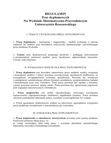 REGULAMIN Prac dyplomowych Na Wydziale Matematyczno-Przyrodniczym Uniwersytetu Rzeszowskiego I. TEMATY I WYKONANIE OPRAC DYPLOMOWYCH 1. Pracę dyplomową – licencjacką i magisterską – student wykonuje w okresie ostatnich lat studiów pod kierunkiem nauczyciela akademickiego zatwierdzonego przez dziekana Wydziału. 2. Tematy prac dyplomowych proponuje promotor i podlegają zatwierdzeniu w przedostatnim semestrze studiów przez dyrektorów odpowiednich instytutów (wersja: radę instytutu) II. WYMAGANIA OGÓLNE DLA PRAC DYPLOMOWYCH 1. Praca dyplomowa jest dowodem opanowania przez studenta wiedzy związanej z kierunkiem studiów i służyć powinna rozwiązywaniu określonych problemów, ze szczególnym uwzględnieniem wybranej specjalizacji. Powinna też świadczyć o umiejętności samodzielnego doboru literatury przedmiotu, przeprowadzenia badania i formułowania ocen oraz wniosków. Treść pracy powinna być zgodna z tematem, a praca powinna stanowić spójną całość. Praca powinna być opracowana poprawnie pod względem merytorycznym i formalnym. 2. Praca magisterska jest próbą samodzielnego, twórczego rozwiązania (opracowania) zaproponowanego studentowi zagadnienia (tematu). Praca powinna zawierać samodzielne dokonania autora, wyraźnie wyszczególnione we wstępie. 3. Przed egzaminem dyplomowym student na pierwszym egzemplarzu (oryginale) pracy podpisuje oświadczenie o samodzielnym jej wykonaniu. III. STRUKTURA PRAC DYPLOMOWYCH 1. Praca magisterska o charakterze teoretycznym powinna mieć prostą strukturę. Konieczne elementy takiej pracy, to: a) wstęp, zawierający plan całej pracy i wyraźnie określenie samodzielnego dokonania; nazwisko ewentualnego konsultanta, b) część główna, nie więcej niż trzy rozdziały; w rozdziale pierwszym należy przedstawić dotychczasowy stan wiedzy o zagadnieniu (temacie), c) zakończenie, d) wykaz pozycji wykorzystanej literatury (i tyko takich) Samodzielnym dokonaniem w pracy magisterskiej o charakterze teoretycznym może być m.in.: - nowy wynik lub nowe ujęcie znanego wyniku, - uzupełnienie i rozwinięcie oryginalnych wyników, - rozwiązanie wybranych problemów spoza odpowiedniej dyscypliny przy użyciu wiedzy związanej z kierunkiem studiów, - zastawnie, usystematyzowanie lub nowe ujęcie faktów i procesów ze wskazaniem dziedziny, np. w perspektywie historycznej, z wykorzystaniem co najmniej dwóch źródeł, - przykłady ilustrujące definicje, stwierdzenia i procesy, - przystępne ujęcie trudnego fragmentu pewnej teorii. Objętość takiej pracy zasadniczo nie powinna być większa niż 40 stron. 2. Praca magisterska o charakterze doświadczalnym powinna: a) zawierać: - wstęp, zawierający sprecyzowanie celu oraz zakresu; nazwisko ewentualnego konsultanta - analizę (opis) dotychczasowego stanu wiedzy o problemie (temacie), - określenie celu badań i sformułowanie problemów badawczych, opis metodologii badań, - opis badania empirycznego lub propozycji dydaktycznej, z wykorzystaniem informacji o podobnych faktach i sytuacjach, - zakończenie – ocenę realizacji celu i zakresu pracy, b) obszarem tematycznym zawierać się w szeroko rozumianych naukach, objętych kierunkiem studiów, c) zawierać ewentualne wnioski o charakterze użytkowym przeprowadzonych analiz i badań, d) zawierać zestawienie pozycji wykorzystanej literatury (i tylko takich). Praca doświadczalna powinna mieć charakter umotywowanej próby (etiudy) badawczej lub propozycji dydaktycznej. Materiałem badawczym mogą być m.in. protokoły z badań empirycznych, protokoły lekcji, zapisy lekcji, zapisy rozmów z praktykami, uczniami lub nauczycielami, instrukcje użytkowe, schematy konstrukcyjne, podręczniki i inne materiały. Propozycja badawcza i dydaktyczna powinna być osadzona w odpowiedniej teorii. Objętość takiej pracy (głównej części) zasadniczo nie powinna przekraczać 60 stron; nie ma ograniczeń wielkości dodatków i aneksów. 3. W pracy dyplomowej należy przytaczać te określenia i opisy wykorzystywanych pojęć, faktów, procesów i sformułowania tych stwierdzeń, które wykraczają poza programy obowiązkowych przedmiotów. Przytoczone i cytowane definicje, opisy i stwierdzenia powinny być opatrzone odsyłaczami. 4. Praca dyplomowa powinna być napisana po polsku i spełniać podstawowe wymogi poprawności matematycznej, językowej i edytorskiej. Cytaty powinny być wyróżnione, ze wskazaniem źródła. Cytaty mogą być umieszczone w cudzysłowach lub wyodrębnione wcięciem oraz wskazane dokładnie ich źródłom np.: ([1], s.239). Powołania się (odsyłacze) w tekście na literaturę powinny być dokładne (ze wskazaniem stron), np.: „pisze o tym Freudenthal (1973a, s.123)”; „znaleźć to można w ([4], s.125)”. Odsyłacze (notki) mogą być umieszczone na odpowiednich stronach lub zgrupowane na końcu pracy, przed spisem literatury. Nazwy należy stosować w brzmieniu oryginalnym lub spolszczone, o ile takie istnieją. Symbole i nazwy należy używać konsekwentnie i starannie odróżniać od innych. Wzory są częścią zdania i powinny być umieszczone centralnie, w osobnych wierszach, z oznaczeniem cyfra arabską w nawiasach ( ) ich kolejności, umieszczonym w pobliżu prawego marginesu. Podstawowe operatory należy umieścić w połowie linii z obustronną spacją. Rysunki, wykresy, zdjęcia i tabele – o wysokości co najmniej 1/3 strony – powinny być umieszczone centralnie, w osobnych pasmach, z oznaczeniem cyfrą arabską ich nazwy i kolejności, umieszczoną pod nimi. Opisy wewnątrz rysunku (wykresu) powinny być czytelne i nie mogą zmniejszać jego czytelności. Niezbędna jest informacja o formacie (programie edycyjnym) rysunku. Wyróżnienia tekstu powinny być zaznaczone grubą czcionką lub kursywą. 5. Spis literatury powinien być ułożony alfabetycznie i mieć format zgodny z wymaganiami wydawnictw z danej dziedziny. Wyrazy i nazwiska pisane w oryginale innym alfabetem niż 