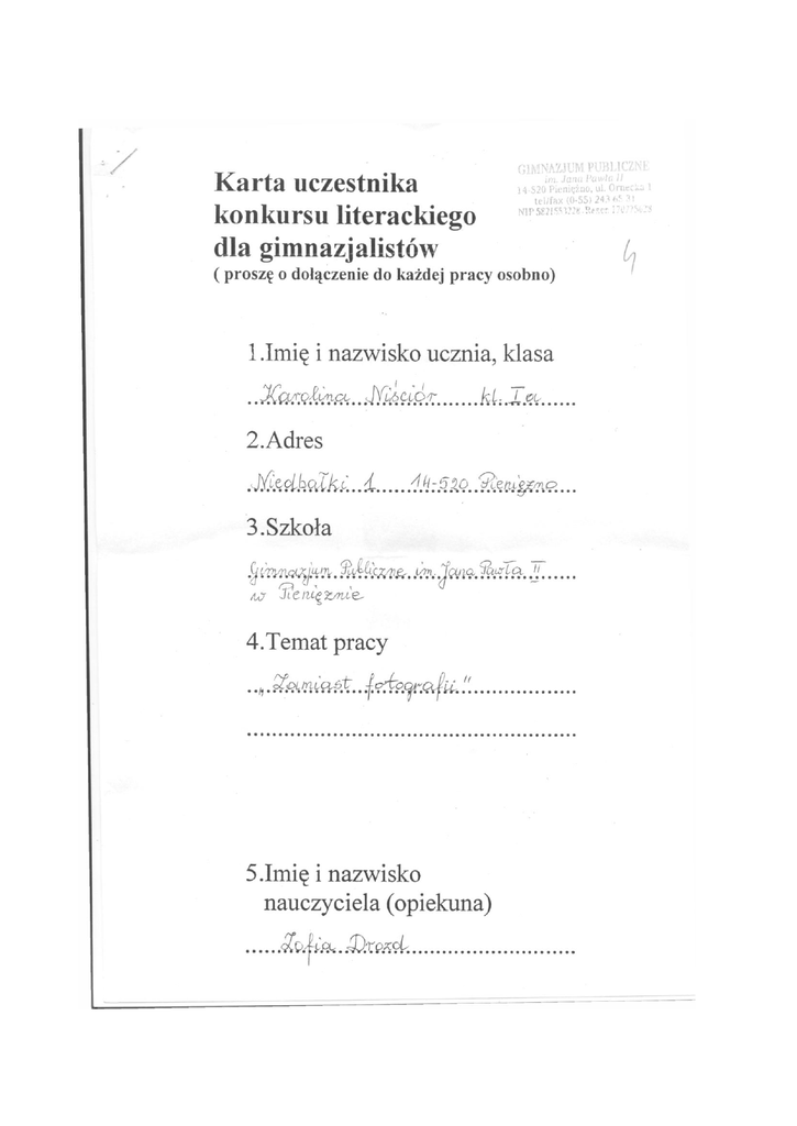 „Zamiast fotografii" Pewnego dnia moja córeczka Zuzia wróciła ze szkoły bardzo podekscytowana. Powiedziała, że musi stworzyć drzewo genealogiczne naszej rodziny. Chciałam jej pomóc, więc przyniosłam ze strychu stare fotografie i notatniki. W pewnym momencie natknęłam się na zielony zeszyt. Był do niego malutki kluczyk. Pomyślałam, że to coś szczególnego, więc zaczęłam czytać: Był ponury jesienny dzień. Właśnie wracałam z cmentarza, gdy po wielu latach rozłąki ujrzałam swojego ojca. Nie widziałam go 10 lat, gdyż zostawił mnie i mamę, gdy zachorowała na raka. Wyjechał za granicą i założył nową rodziną. Nie potrafiłam mu tego wybaczyć. Chciałam podejść bliżej, ale... stchórzyłam i uciekłam do domu. Postąpiłam tak, jak on 10 łat temu. Byliśmy wtedy tacy szczęśliwi! Mimo długiego rozstania, nie zapomniałam o nim. Zawsze nosiłam jego zdjęcie przy piersi. Jednak ja zapamiętałam go jako zupełnie innego człowieka i nie chciałam mieć z nim nic do czynienia. Wieczorem siedząc przy kominku, zaczęłam wspominać dawne czasy. Chociaż bardzo chciałam, nie potrafiłam wymazać go ze swej pamięci. Przecież oprócz tego, że nas zostawił, nauczył mnie kochać. Przez 15 lat nawiązaliśmy ze sobą silną wiąż, a dokładnie w 1985 roku to wszystko, co budowaliśmy przez wiele lat, legło w gruzach. Nie wiem, czy mam silą, aby odrzucić ten ciężar i zacząć budować od nowa. Podczas, gdy tak rozmyślałam, zrobiło się późno. Słońce już dawno schowało się za horyzontem. Chociaż była sobota, nie poszłam do klubu z kumplami, ale położyłam się wcześniej spać. „Biedna dziewczyna" - pomyślałam i przewróciłam kolejną kartkę. Po pewnej chwili z zamyślenia wyrwało mnie pukanie do drzwi. - Dzień dobry! - powiedziałam - Dzień dobry. Jest Zuzka? - zapytała Asia, przyjaciółka mojej córki. - Jest u siebie w pokoju. Wejdź. - zaprosiłam ją do środka i zawołałam córeczkę. - Siemka! - Cześć! Idziemy pograć na komputerze? - Yhy. - Ej, córuniu! Nie zapomniałaś o czymś? Nie odrobiłaś jeszcze swojej pracy domowej. - Teraz?! Nie mogę za pół godziny? - zapytała. - Wieczorem idziemy do babci. Ma dzisiaj imieniny. Nie pamiętasz? - Pamiętam, pamiętam. - Więc? - ciągnęłam dyskusję. - No dobra. Co mam robić? - Przynieś ze strychu czerwony karton, a ja zrobię kakao. Uśmiechnij się trochę! Dwadzieścia minut później siedziałyśmy już przy stole i przeglądałyśmy zawartość pudełka. - Papiery, zeszyty, albumy... Czego tu nie ma?! Przecież w takim tempie nie skończymy tego do poniedziałku! - Nie denerwuj się tak! Złość piękności szkodzi. Posłuchaj na przykład tego: Rano wstałam zmęczona i niewyspana. Całą noc myślałam o mamie. Zastanawiałam się, co zrobiłaby na moim miejscu. Szukając odpowiedzi, udałam się na cmentarz. To ciche i spokojne miejsce. Wbrew sobie, zaczęłam płakać, gdyż zrozumiałam, że tęsknię za matką. Brakuje mi tych chwil, gdy mnie przytulała, pocieszała i udzielała rad. Odmawiając modlitwę spostrzegłam leżącą na mogile fotografię. Podniosłam ją. W pewnej chwili, uświadomiłam sobie, jaka byłam samolubna. Cały czas myślałam o sobie, a nie o innych. Postanowiłam pójść na poddasze - ulubione miejsce rodziców. Nigdy tam nie chodziłam, ponieważ to było ich magiczne miejsce. Ich — dopóki nie zostałyśmy same. Ten fragment wydał mi się wyjątkowo znajomy, ponieważ mój ukochany także wyjechał za granicę i nie wrócił. Pamiętam, że cała rodzina odradzała mi to małżeństwo, ale wtedy byłam młoda i głupia. Wiele przez niego wycierpiałam, choć na początku mieliśmy „swój własny świat". Zawsze o pełni księżyca spotykaliśmy się w domku na plaży, spacerowaliśmy brzegiem jeziora lub rozmawialiśmy aż do świtu. To właśnie tam przeżyłam najpiękniejsze chwile swojego życia. - Mamo, nie śpij! - zawołała moja córcia. - Co? A, już! Już czytam dalej! Na początku wszystko wydawało się normalne. W pewnej chwili zobaczyłam niewielki karton. Chwyciłam go w ręce i szybko zeszłam na dół. Te pajęczyny i półmrok zawsze przyprawiały mnie o dreszcze. Przeglądając pudełko znalazłam listy miłosne rodziców, pamiętnik mamy i dziennik taty. Na samym dnie leżała biała, porządnie zaklejona koperta. Nie byłam pewna, czy mogę zajrzeć do środka, na kopercie nie było adresata ani nadawcy. Przełamałam się i otworzyłam ją. To kartka z pamiętnika mamy. Pomyślałam, że warto zapoznać się z przemyśleniami osoby, która była i nadał jest mi bliska. „ Droga Wiktorio!" - zaczęłam czytać. „Miałam nadzieję, że ta kartka trafi w Twoje ręce. Wiem, że zostało mi niewiele życia. Dlatego zanim odejdę, chcę Ci o czymś powiedzieć. Osoba na zdjęciu załączonym do listu to twój brat. Tak, masz brata. Gdy miałaś 5 lat, ponownie zaszłam w ciążę. Nie miałam z czego utrzymać rodziny. Wojtuś (bo tak ma na imię) jest wychowankiem Domu Dziecka we Wrocławiu. Pragnę, abyś odnalazła go i zapewniła mu to, czego ja z ojcem nie mogliśmy Ci zapewnić. Wiedz, że bardzo Cię kocham i zawsze będę kochała. " Nie mogłam w to uwierzyć. Mam brata! Spojrzałam na fotografię. Jeszcze go dobrze nie znałam, ale czułam, że będziemy tworzyć zgrany duet. Jednak to nie był cały list. Na koniec mama dodała, abym wybaczyła tacie, bo wie, że go kocham, a widząc z góry całą rodzinę, będzie jeszcze szczęśliwsza. Następnego dnia poszłam do taty. Wynajmował kawalerkę niedaleko mojej uczelni. Mieszkał sam. Nie wiedziałam, co mu powiem, ale jedno było pewne. Chcę, aby wrócił do domu. Zabrałam ze sobą album, gdyż zostały w nim uwiecznione najpiękniejsze chwile naszego życia. Miałam nadzieję, że dzięki temu łatwiej będzie zapomnieć o przeszłości. Zapukałam. Tata otworzył i zaprosił mnie do środka. Domyślał się, jaki jest cel m