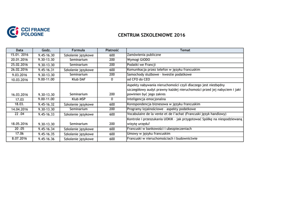CENTRUM SZKOLENIOWE 2016 Data 15.01. 2016 20.01.2016 25.02.2016 26.02.2016 9.03.2016 10.03.2016 16.03.2016 17.03 18.03. 14.04.2016 22 .04 18.05.2016 20 .05 17.06 8.07.2016 Godz. 9.45-16.30 9.30-13.30 9.30-13.30 9.45-16.31 9.30-13.30 9.00-11.00 Formuła Szkolenie językowe Seminarium Seminarium Płatność 600 200 200 Szkolenie językowe Seminarium Klub DAF 600 200 0 9.30-13.30 9.00-11.00 Seminarium Klub MŚP 200 0 9.45-16.32 9.30-13.30 9.45-16.33 Szkolenie językowe Seminarium 600 200 Szkolenie językowe 600 9.30-13.30 9.45-16.34 9.45-16.35 9.45-16.36 Seminarium 200 Szkolenie językowe Szkolenie językowe Szkolenie językowe 600 600 600 Temat Zamówienia publiczne Wymogi GIODO Podatki we Francji Komunikacja przez telefon w języku francuskim Samochody służbowe – kwestie podatkowe od CFO do CEO Aspekty nabywania nieruchomości czyli dlaczego jest niezbędny szczegółowy audyt prawny każdej nieruchomości przed jej nabyciem i jaki powinien być jego zakres Inteligencja emocjonalna Korespondencja biznesowa w języku francuskim Programy lojalnościowe – aspekty podatkowe Vocabulaire de la vente et de l’achat (Francuski język handlowy) Kontrole i przeszukania UOKiK – jak przygotować Spółkę na niespodziewaną wizytę urzędu? Francuski w bankowości i ubezpieczeniach Umowy w języku francuskim Francuski w nieruchomościach i budownictwie