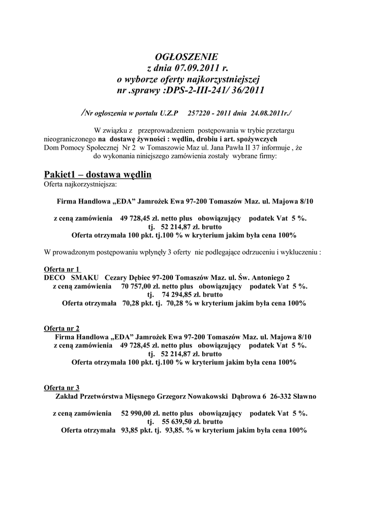 OGŁOSZENIE z dnia 07.09.2011 r. o wyborze oferty najkorzystniejszej nr .sprawy :DPS-2-III-241/ 36/2011 /Nr ogłoszenia w portalu U.Z.P 257220 - 2011 dnia 24.08.2011r./ W związku z przeprowadzeniem postępowania w trybie przetargu nieograniczonego na dostawę żywności : wędlin, drobiu i art. spożywczych Dom Pomocy Społecznej Nr 2 w Tomaszowie Maz ul. Jana Pawła II 37 informuje , że do wykonania niniejszego zamówienia zostały wybrane firmy: Pakiet1 – dostawa wędlin Oferta najkorzystniejsza: Firma Handlowa „EDA” Jamrożek Ewa 97-200 Tomaszów Maz. ul. Majowa 8/10 z ceną zamówienia 49 728,45 zł. netto plus obowiązujący podatek Vat 5 %. tj. 52 214,87 zł. brutto Oferta otrzymała 100 pkt. tj.100 % w kryterium jakim była cena 100% W prowadzonym postępowaniu wpłynęły 3 oferty nie podlegające odrzuceniu i wykluczeniu : Oferta nr 1 DECO SMAKU Cezary Dębiec 97-200 Tomaszów Maz. ul. Św. Antoniego 2 z ceną zamówienia 70 757,00 zł. netto plus obowiązujący podatek Vat 5 %. tj. 74 294,85 zł. brutto Oferta otrzymała 70,28 pkt. tj. 70,28 % w kryterium jakim była cena 100% Oferta nr 2 Firma Handlowa „EDA” Jamrożek Ewa 97-200 Tomaszów Maz. ul. Majowa 8/10 z ceną zamówienia 49 728,45 zł. netto plus obowiązujący podatek Vat 5 %. tj. 52 214,87 zł. brutto Oferta otrzymała 100 pkt. tj.100 % w kryterium jakim była cena 100% Oferta nr 3 Zakład Przetwórstwa Mięsnego Grzegorz Nowakowski Dąbrowa 6 26-332 Sławno z ceną zamówienia 52 990,00 zł. netto plus obowiązujący podatek Vat 5 %. tj. 55 639,50 zł. brutto Oferta otrzymała 93,85 pkt. tj. 93,85. % w kryterium jakim była cena 100% Pakiet 2 – dostawa drobiu Oferta najkorzystniejsza: DECO SMAKU Cezary Dębiec 97-200 Tomaszów Maz. ul. Św. Antoniego 2 z ceną zamówienia 25 365,00 zł. netto plus obowiązujący podatek Vat 5 %. tj. 26 633,25 zł. brutto Oferta otrzymała 100 pkt. tj. 100 % w kryterium jakim była cena 100% W prowadzonym postępowaniu wpłynęły dwie oferty nie podlegające odrzuceniu i wykluczeniu : Oferta nr 1 DECO SMAKU Cezary Dębiec 97-200 Tomaszów Maz. ul. Św. Antoniego 2 z ceną zamówienia 25 365,00 zł. netto plus obowiązujący podatek Vat 5 %. Tj. 26 633,25 zł. brutto Oferta otrzymała 100 pkt. tj. 100 % w kryterium jakim była cena 100% Oferta nr 2 Zakład Przetwórstwa Mięsnego Grzegorz Nowakowski Dąbrowa 6 26-332 Sławno z ceną zamówienia 29 525,00 zł. netto plus obowiązujący podatek Vat 5 %. tj. 31 001,25 zł. brutto Oferta otrzymała 85,91 pkt. tj. 85,91% w kryterium jakim była cena 100% Pakiet 3 – dostawa art. spożywczych Oferta najkorzystniejsza: Piekarnia Inowłódź Hurtownia Nabiału sp.j. 97-215 Inowłódź ul. Spalska 25 z ceną zamówienia 70 649,53 zł. netto plus obowiązujący podatek Vat . tj. 76 700,07 zł. brutto Oferta otrzymała 100 pkt. tj. 100% w kryterium jakim była cena 100% W prowadzonym postępowaniu wpłynęła tylko jedna oferta nie podlegające odrzuceniu i wykluczeniu : Oferta nr 1 Piekarnia Inowłódź Hurtownia Nabiału sp.j. 97-215 Inowłódź ul. Spalska 25 z ceną zamówienia 70 649,53 zł. netto plus obowiązujący podatek Vat . tj. 76 700,07 zł. brutto Oferta otrzymała 100 pkt. tj. 100% w kryterium jakim była cena 100% Informujemy ,że termin podpisania umowy z w/wymienionymi firmami nastąpi w dniu 19.09.2011r. w siedzibie Zamawiającego.
