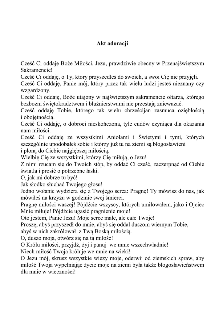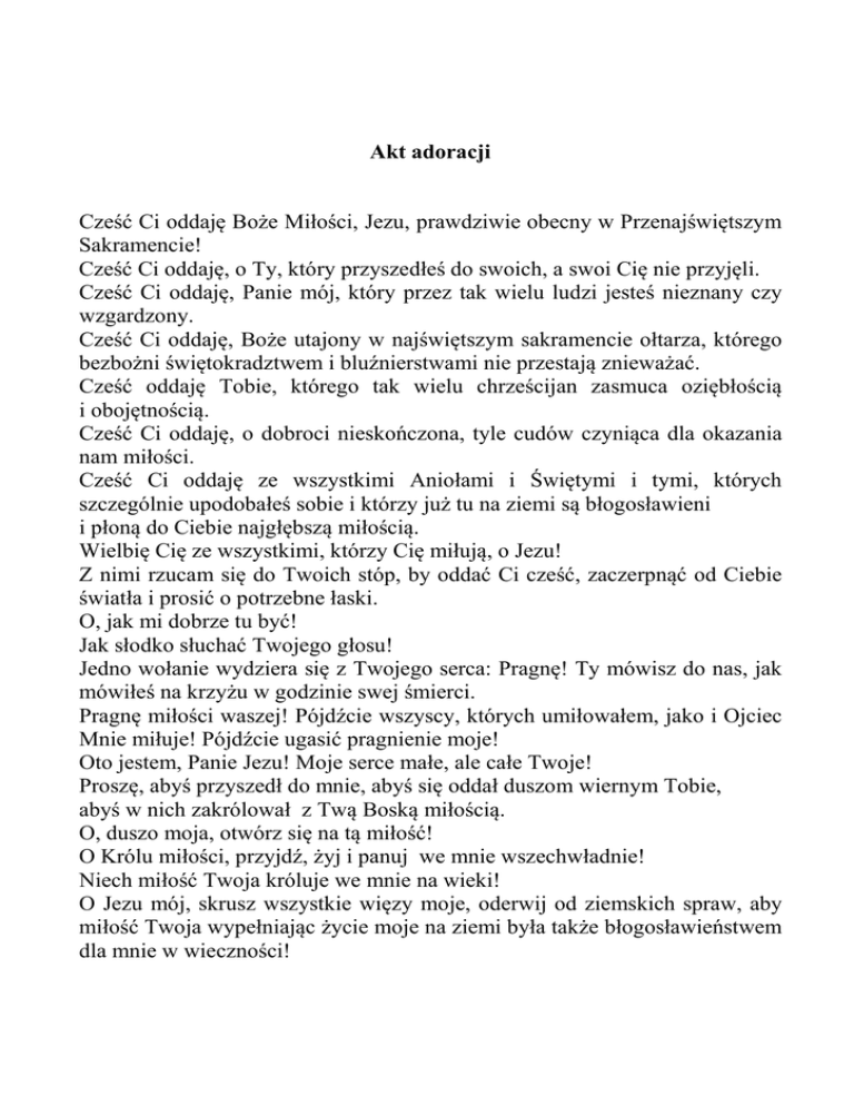 Akt adoracji Cześć Ci oddaję Boże Miłości, Jezu, prawdziwie obecny w Przenajświętszym Sakramencie! Cześć Ci oddaję, o Ty, który przyszedłeś do swoich, a swoi Cię nie przyjęli. Cześć Ci oddaję, Panie mój, który przez tak wielu ludzi jesteś nieznany czy wzgardzony. Cześć Ci oddaję, Boże utajony w najświętszym sakramencie ołtarza, którego bezbożni świętokradztwem i bluźnierstwami nie przestają znieważać. Cześć oddaję Tobie, którego tak wielu chrześcijan zasmuca oziębłością i obojętnością. Cześć Ci oddaję, o dobroci nieskończona, tyle cudów czyniąca dla okazania nam miłości. Cześć Ci oddaję ze wszystkimi Aniołami i Świętymi i tymi, których szczególnie upodobałeś sobie i którzy już tu na ziemi są błogosławieni i płoną do Ciebie najgłębszą miłością. Wielbię Cię ze wszystkimi, którzy Cię miłują, o Jezu! Z nimi rzucam się do Twoich stóp, by oddać Ci cześć, zaczerpnąć od Ciebie światła i prosić o potrzebne łaski. O, jak mi dobrze tu być! Jak słodko słuchać Twojego głosu! Jedno wołanie wydziera się z Twojego serca: Pragnę! Ty mówisz do nas, jak mówiłeś na krzyżu w godzinie swej śmierci. Pragnę miłości waszej! Pójdźcie wszyscy, których umiłowałem, jako i Ojciec Mnie miłuje! Pójdźcie ugasić pragnienie moje! Oto jestem, Panie Jezu! Moje serce małe, ale całe Twoje! Proszę, abyś przyszedł do mnie, abyś się oddał duszom wiernym Tobie, abyś w nich zakrólował z Twą Boską miłością. O, duszo moja, otwórz się na tą miłość! O Królu miłości, przyjdź, żyj i panuj we mnie wszechwładnie! Niech miłość Twoja króluje we mnie na wieki! O Jezu mój, skrusz wszystkie więzy moje, oderwij od ziemskich spraw, aby miłość Twoja wypełniając życie moje na ziemi była także błogosławieństwem dla mnie w wieczności!