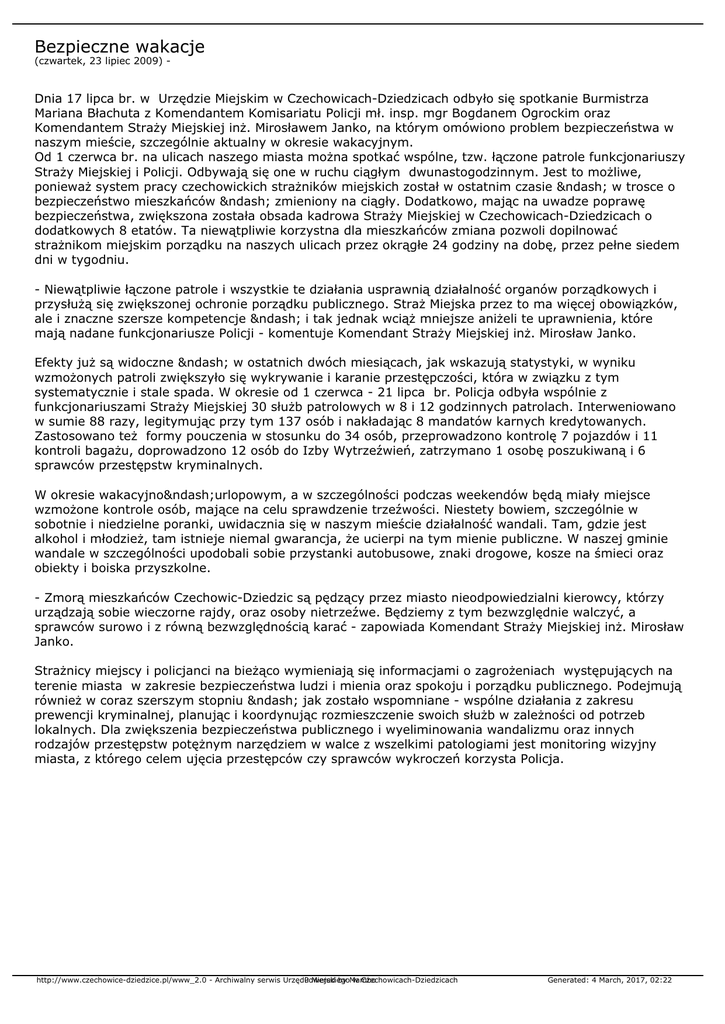 Bezpieczne wakacje (czwartek, 23 lipiec 2009) - Dnia 17 lipca br. w Urzędzie Miejskim w Czechowicach-Dziedzicach odbyło się spotkanie Burmistrza Mariana Błachuta z Komendantem Komisariatu Policji mł. insp. mgr Bogdanem Ogrockim oraz Komendantem Straży Miejskiej inż. Mirosławem Janko, na którym omówiono problem bezpieczeństwa w naszym mieście, szczególnie aktualny w okresie wakacyjnym. Od 1 czerwca br. na ulicach naszego miasta można spotkać wspólne, tzw. łączone patrole funkcjonariuszy Straży Miejskiej i Policji. Odbywają się one w ruchu ciągłym dwunastogodzinnym. Jest to możliwe, ponieważ system pracy czechowickich strażników miejskich został w ostatnim czasie – w trosce o bezpieczeństwo mieszkańców – zmieniony na ciągły. Dodatkowo, mając na uwadze poprawę bezpieczeństwa, zwiększona została obsada kadrowa Straży Miejskiej w Czechowicach-Dziedzicach o dodatkowych 8 etatów. Ta niewątpliwie korzystna dla mieszkańców zmiana pozwoli dopilnować strażnikom miejskim porządku na naszych ulicach przez okrągłe 24 godziny na dobę, przez pełne siedem dni w tygodniu. - Niewątpliwie łączone patrole i wszystkie te działania usprawnią działalność organów porządkowych i przysłużą się zwiększonej ochronie porządku publicznego. Straż Miejska przez to ma więcej obowiązków, ale i znaczne szersze kompetencje – i tak jednak wciąż mniejsze aniżeli te uprawnienia, które mają nadane funkcjonariusze Policji - komentuje Komendant Straży Miejskiej inż. Mirosław Janko. Efekty już są widoczne – w ostatnich dwóch miesiącach, jak wskazują statystyki, w wyniku wzmożonych patroli zwiększyło się wykrywanie i karanie przestępczości, która w związku z tym systematycznie i stale spada. W okresie od 1 czerwca - 21 lipca br. Policja odbyła wspólnie z funkcjonariuszami Straży Miejskiej 30 służb patrolowych w 8 i 12 godzinnych patrolach. Interweniowano w sumie 88 razy, legitymując przy tym 137 osób i nakładając 8 mandatów karnych kredytowanych. Zastosowano też formy pouczenia w stosunku do 34 osób, przeprowadzono kontrolę 7 pojazdów i 11 kontroli bagażu, doprowadzono 12 osób do Izby Wytrzeźwień, zatrzymano 1 osobę poszukiwaną i 6 sprawców przestępstw kryminalnych. W okresie wakacyjno–urlopowym, a w szczególności podczas weekendów będą miały miejsce wzmożone kontrole osób, mające na celu sprawdzenie trzeźwości. Niestety bowiem, szczególnie w sobotnie i niedzielne poranki, uwidacznia się w naszym mieście działalność wandali. Tam, gdzie jest alkohol i młodzież, tam istnieje niemal gwarancja, że ucierpi na tym mienie publiczne. W naszej gminie wandale w szczególności upodobali sobie przystanki autobusowe, znaki drogowe, kosze na śmieci oraz obiekty i boiska przyszkolne. - Zmorą mieszkańców Czechowic-Dziedzic są pędzący przez miasto nieodpowiedzialni kierowcy, którzy urządzają sobie wieczorne rajdy, oraz osoby nietrzeźwe. Będziemy z tym bezwzględnie walczyć, a sprawców surowo i z równą bezwzględnością karać - zapowiada Komendant Straży Miejskiej inż. Mirosław Janko. Strażnicy miejscy i policjanci na bieżąco wymieniają się informacjami o zagrożeniach występujących na terenie miasta w zakresie bezpieczeństwa ludzi i mienia oraz spokoju i porządku publicznego. Podejmują również w coraz szerszym stopniu – jak zostało wspomniane - wspólne działania z zakresu prewencji kryminalnej, planując i koordynując rozmieszczenie swoich służb w zależności od potrzeb lokalnych. Dla zwiększenia bezpieczeństwa publicznego i wyeliminowania wandalizmu oraz innych rodzajów przestępstw potężnym narzędziem w walce z wszelkimi patologiami jest monitoring wizyjny miasta, z którego celem ujęcia przestępców czy sprawców wykroczeń korzysta Policja. http://www.czechowice-dziedzice.pl/www_2.0 - Archiwalny serwis Urzędu Powered Miejskiego by Mambo w Czechowicach-Dziedzicach Generated: 4 March, 2017, 02:22